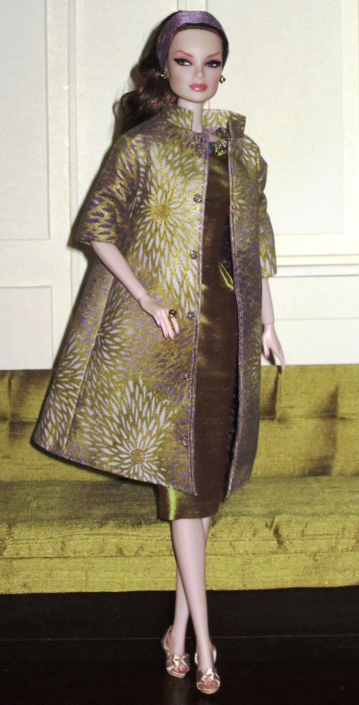 A delightful Renaissance print with holly sprigs sprinkled throughout makes up this classic swing coat with a nehru collar. The coat is lined in purple silk shot with green. Gold filagree buttons decorate the front of the coat. The gold is picked up in the pleated cummerbund of the sheath dress. Beads decorate the shoulders of the sheath.