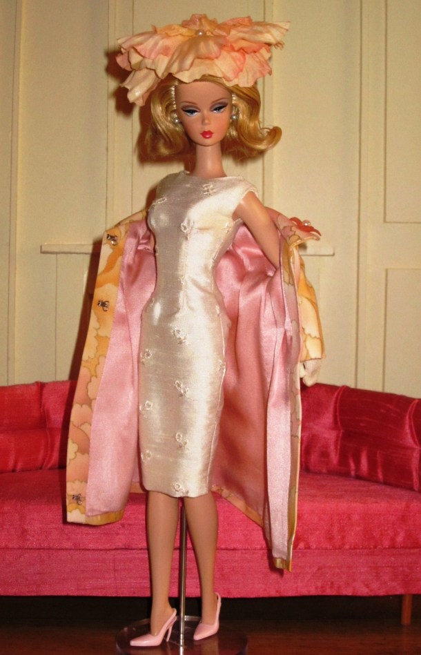 This vintage styled coat is made from an exquisite fabric of pink roses touched with lustrous pearl tones. It is fully lined with pale pink silk and sports pearl buttons. A slim, boatneck sheath in creamy silk eyelet is lined in pale pink silk, which shows through the eyelet. A pleated pink cummerbund decorates the waist, and pearls and pink beads embellish the shoulders. Edition of 2