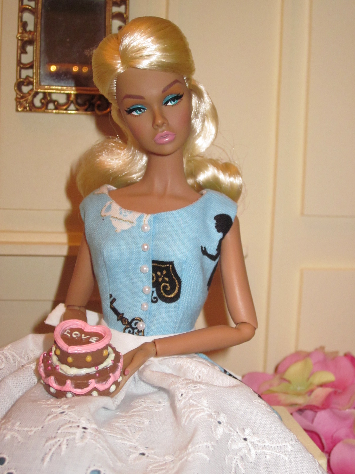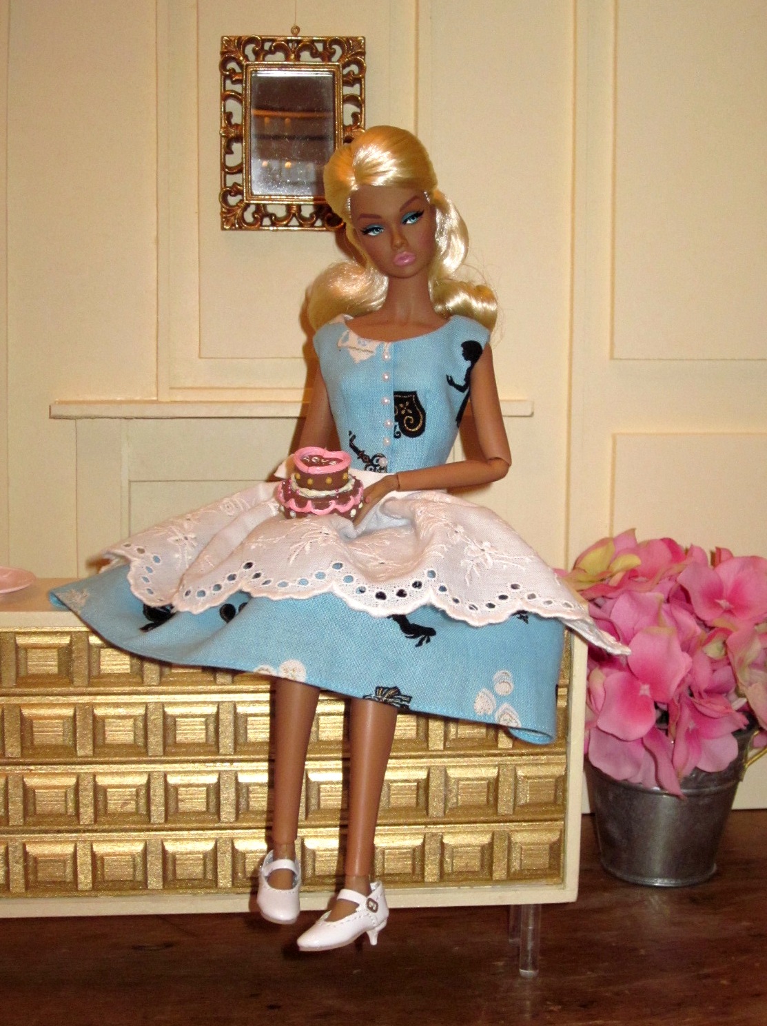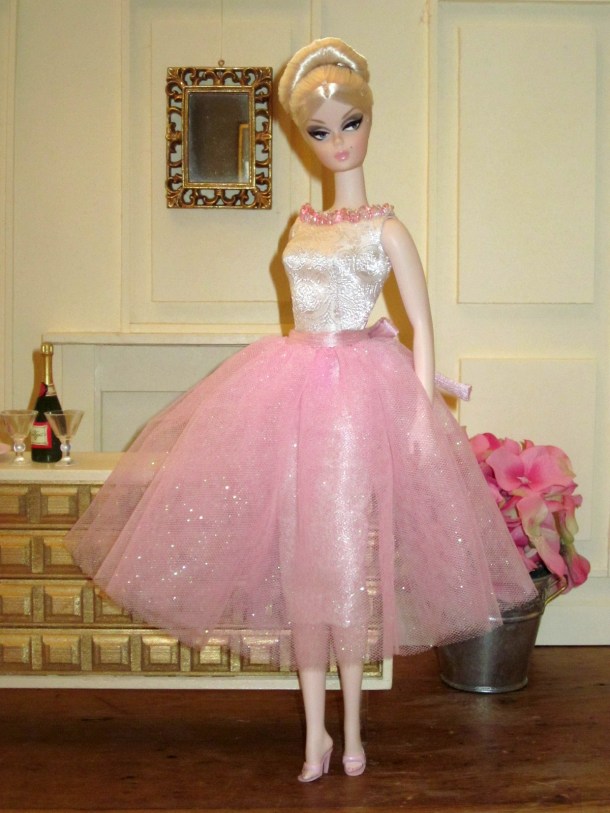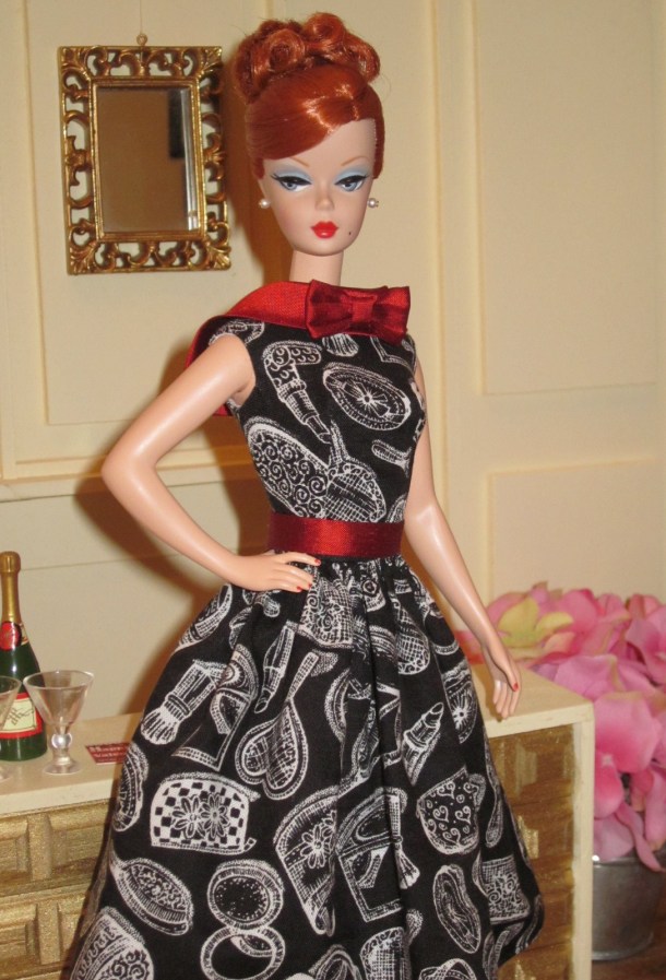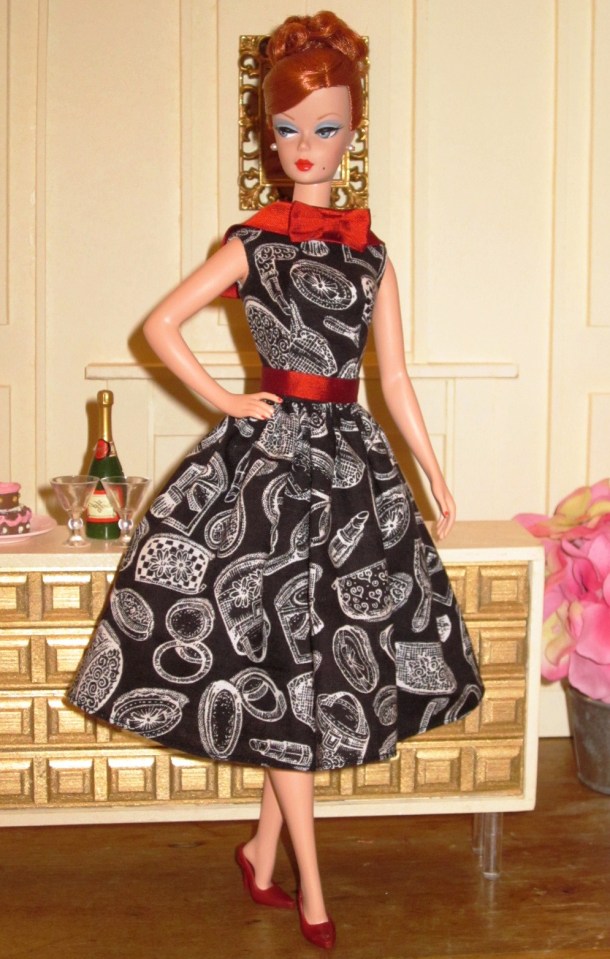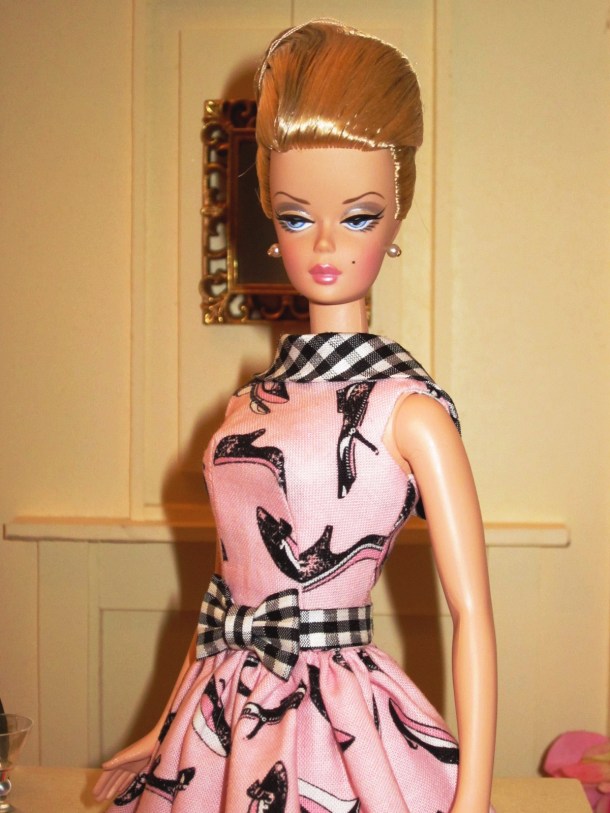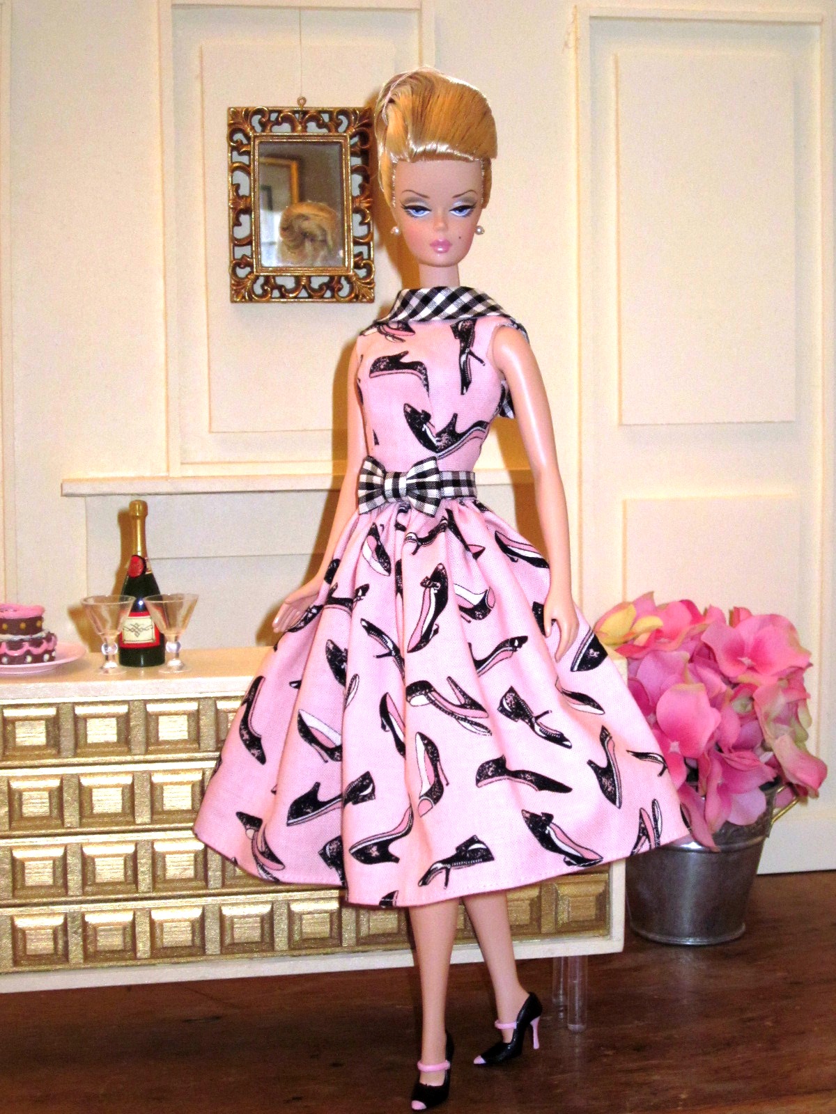 Another day dress in pale pink cotton sprinkled with vintage shoes in black and white. Black and white checked silk taffeta for the collar and bow belt. Classic Barbie! Edition of 2