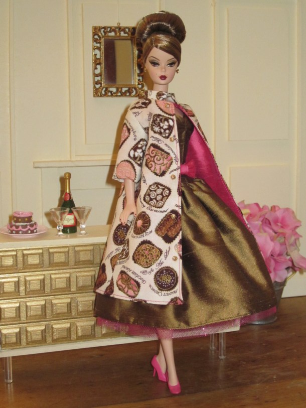 A classic swing coat with a nehru collar in a whimsical print of luxurious truffles, lined with raspberry pink silk. Touches of gold are picked up by gold filagree buttons. A full skirted chocolate brown silk party dress is decorated with a raspberry silk bow belt. A raspberry sparkle tulle petticoat peeks out from the hem of the dress. Edition of 2