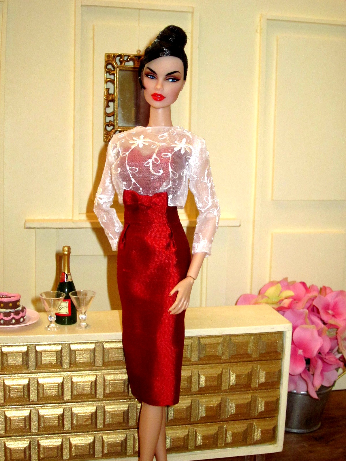 A rich, iridescent red silk taffeta cocktail dress with a sweetheart neckline is topped with a white lace organza over blouse trimmed with a red silk bow. A perfect Valentine! Edition of 2