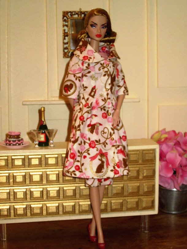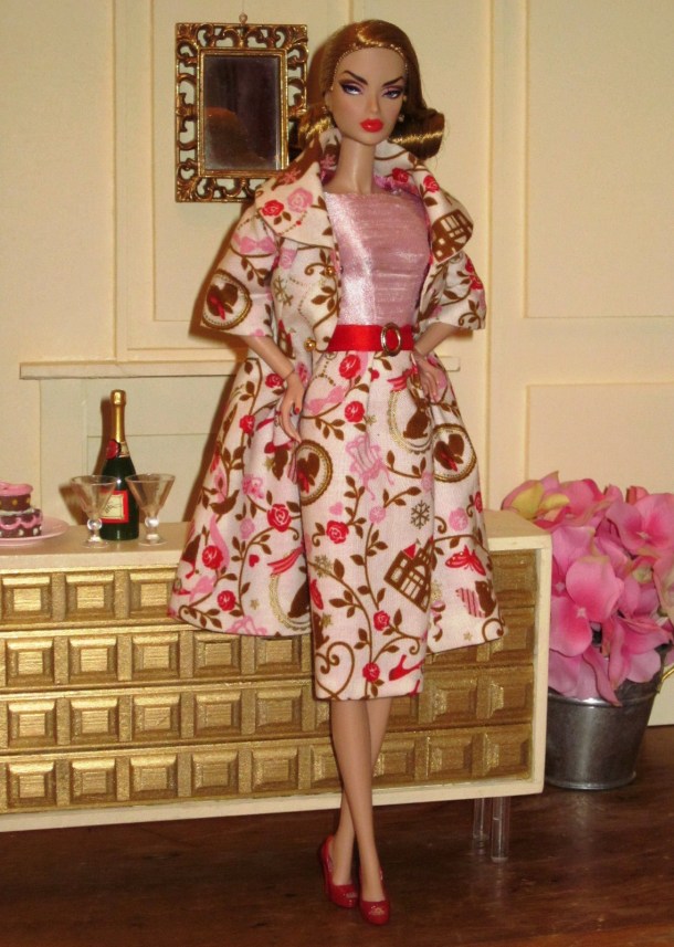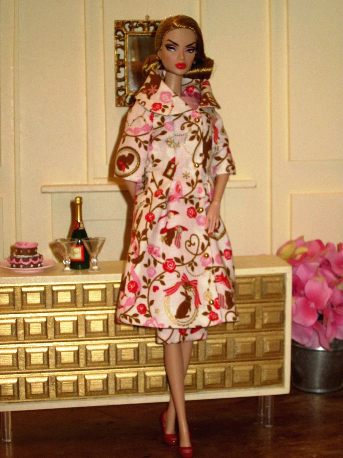 This fairy tale fashion is made from a whimsical Japanese fabric that is covered with charming motifs of shoes, castles, crowns and woodland creatures, all intertwined with the rose vines that cover the castle of the Sleeping Beauty. The colors are chocolate brown, rose pink and red, touched with gold. The coat is lined with rose pink silk shot with brown and gold buttons decorate the front. The classic sheath has the fairy tale print for the skirt and a pale pink silk top. A red silk belt with a gold buckle decorates the waistline. Edition of 2