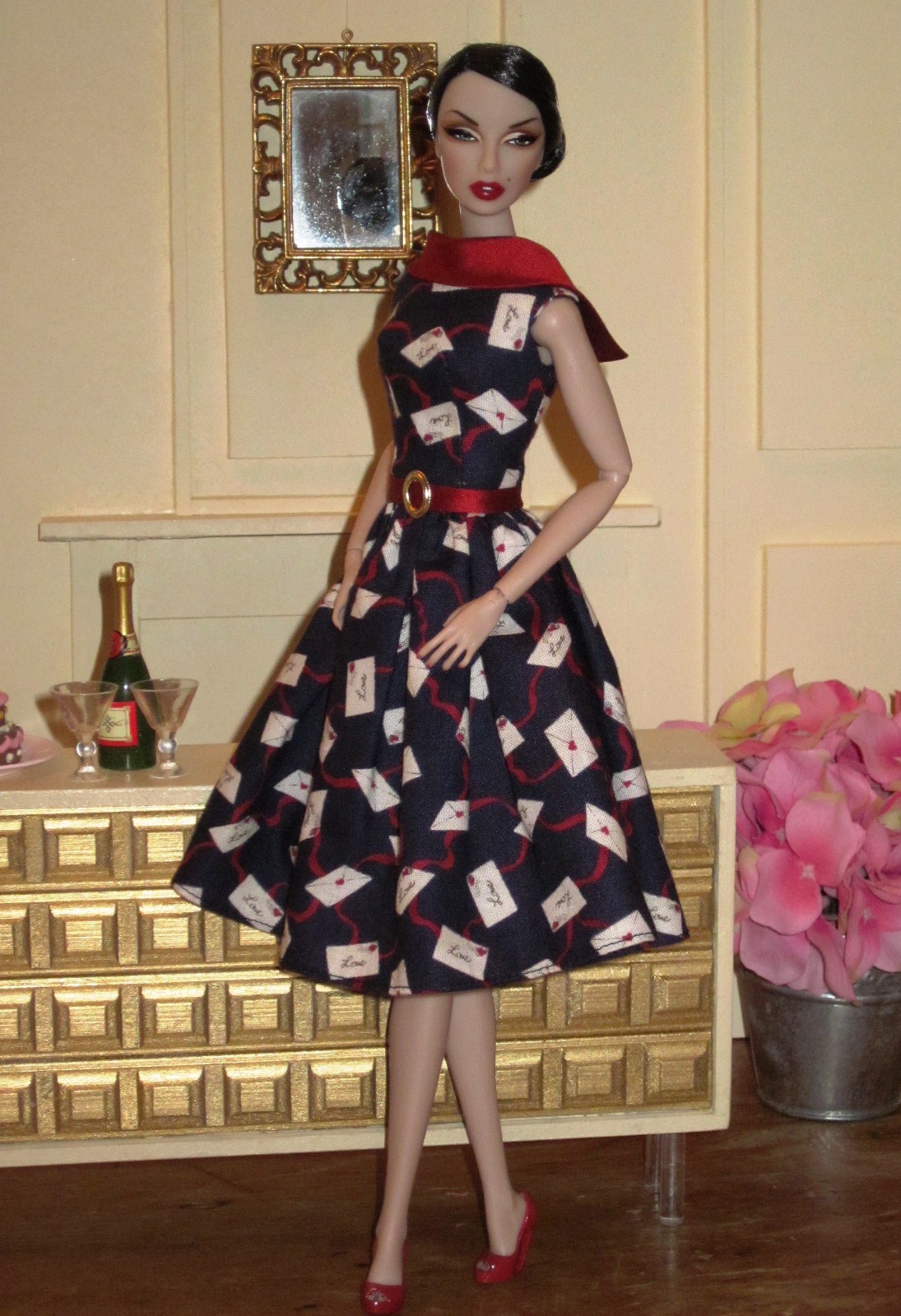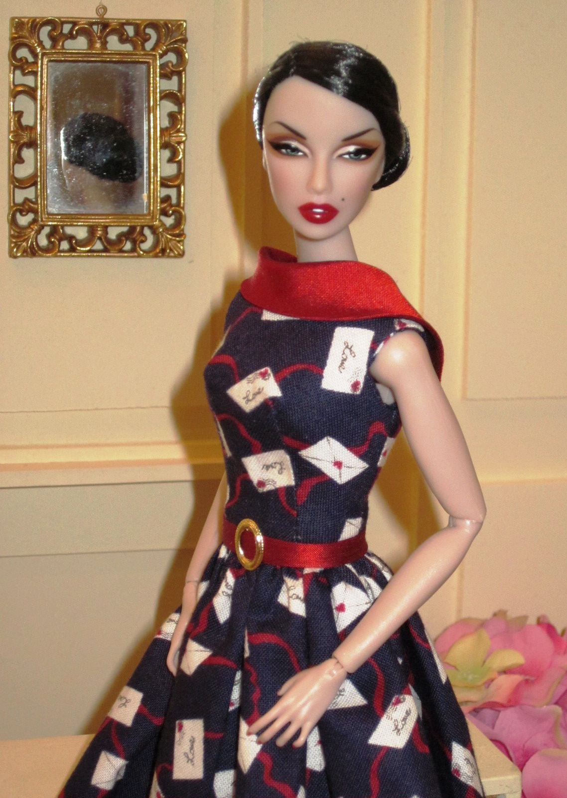 Adorable! I love this navy blue cotton print with swirling red ribbons and tiny Valentines and it works beautifully for this classic vintage day dress. Deep red silk taffeta makes up the rolled collar, which dips to a deep V in the back, and a red silk belt and gold buckle trims the waist. Edition of 2