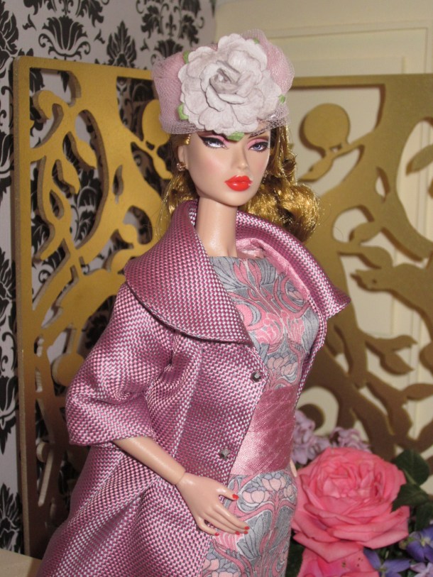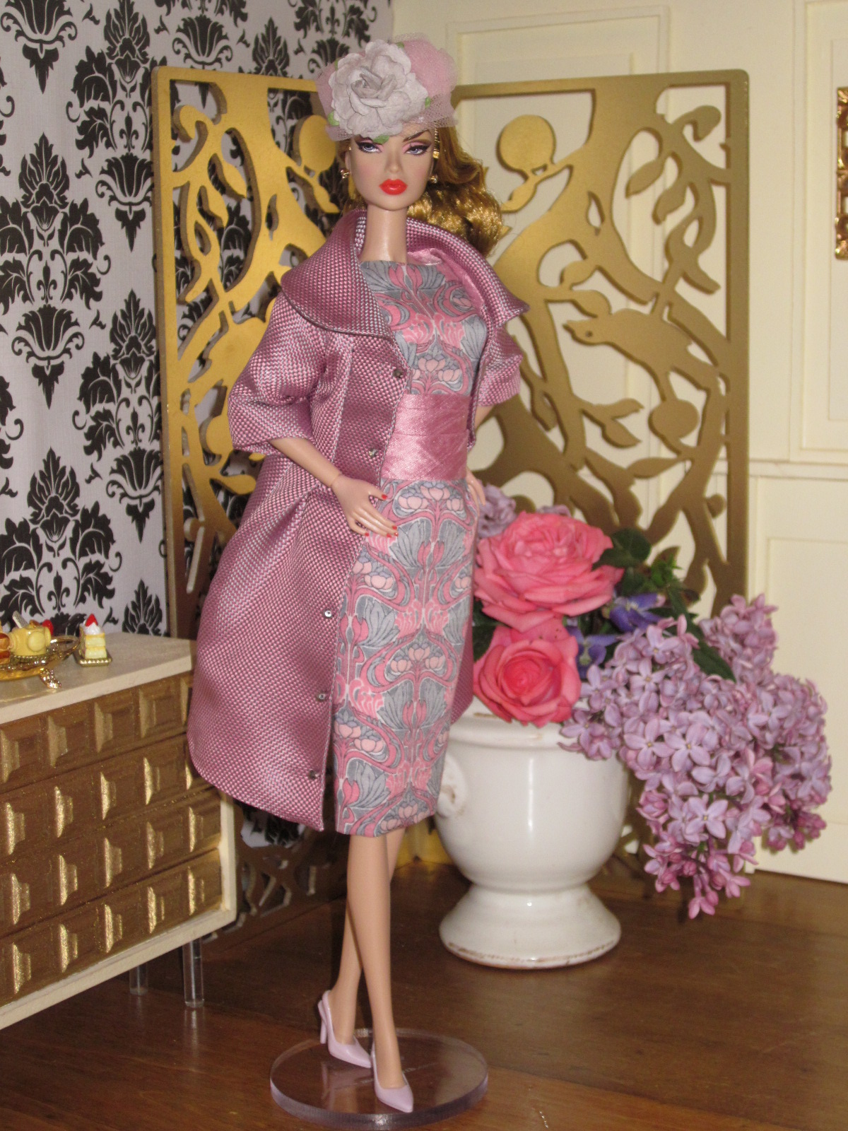 This sheath is in a classic Art Nouveau print in shades of pale pink, rose pink, and grey with a rose silk cummerbund. A gorgeous coat in rose pink and grey micro checked silk brocade has tiny faceted silver grey crystal buttons. A pink hat swathed in pale pink tulle and trimmed with a pale grey rose tops off the ensemble.