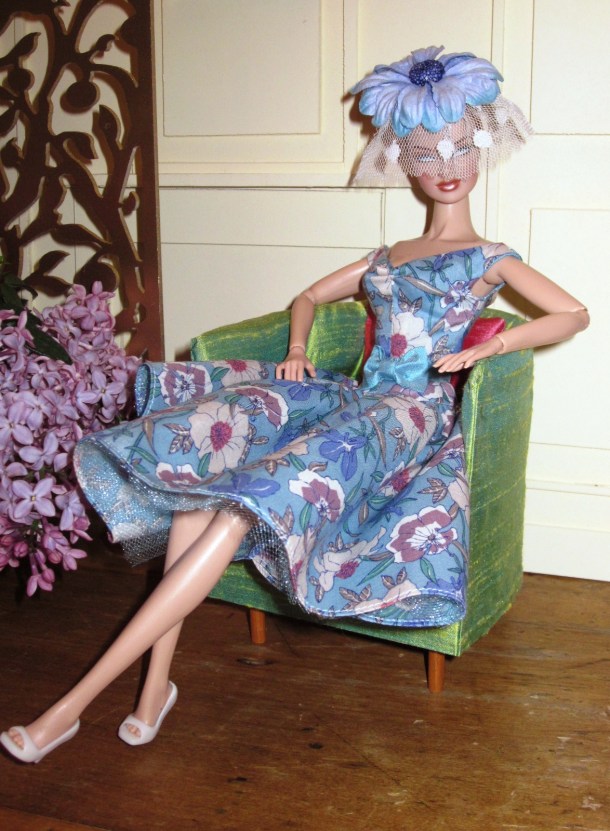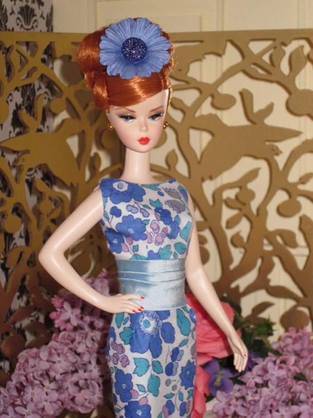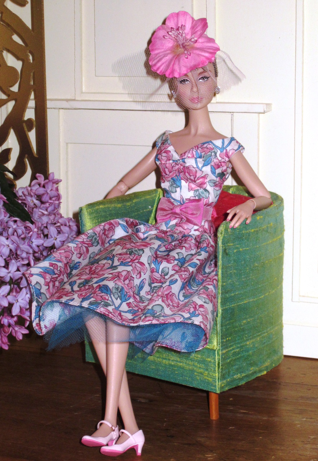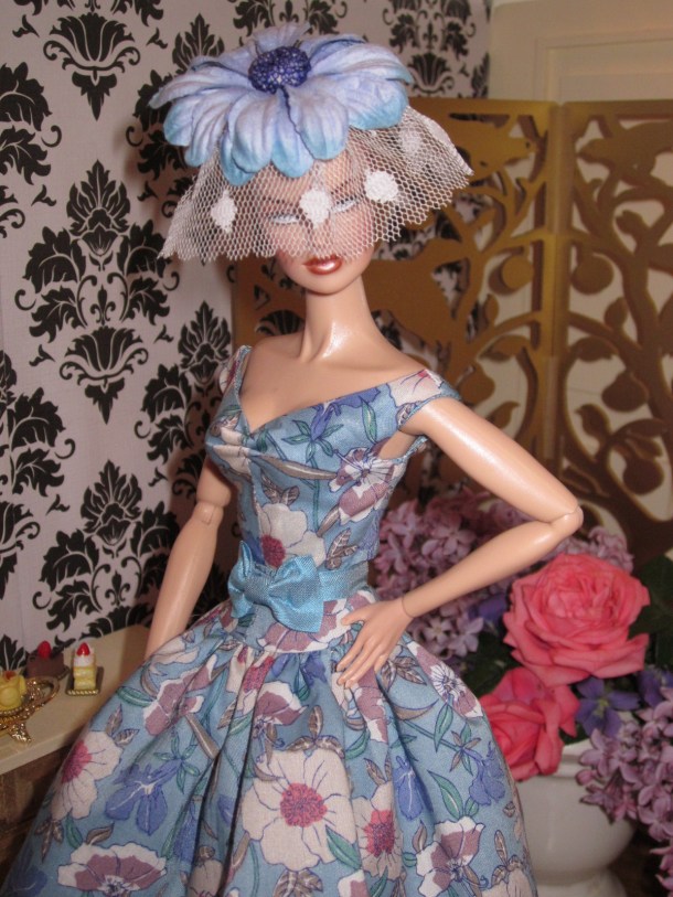 Our house had an incredible garden when I was growing up and one of my very favorite flowers were the miniature carnations known as “Pinks.” That is probably why I love this fabric so much. Covered in pink “Pinks” and their distinctive blue-ish green stems and leaves, it reminds me so much of these spicy fragrant flowers that flourished in my father’s garden. A scalloped tulle petticoat in turquoise blue peeks out from the hem. The pink fascinator is included.