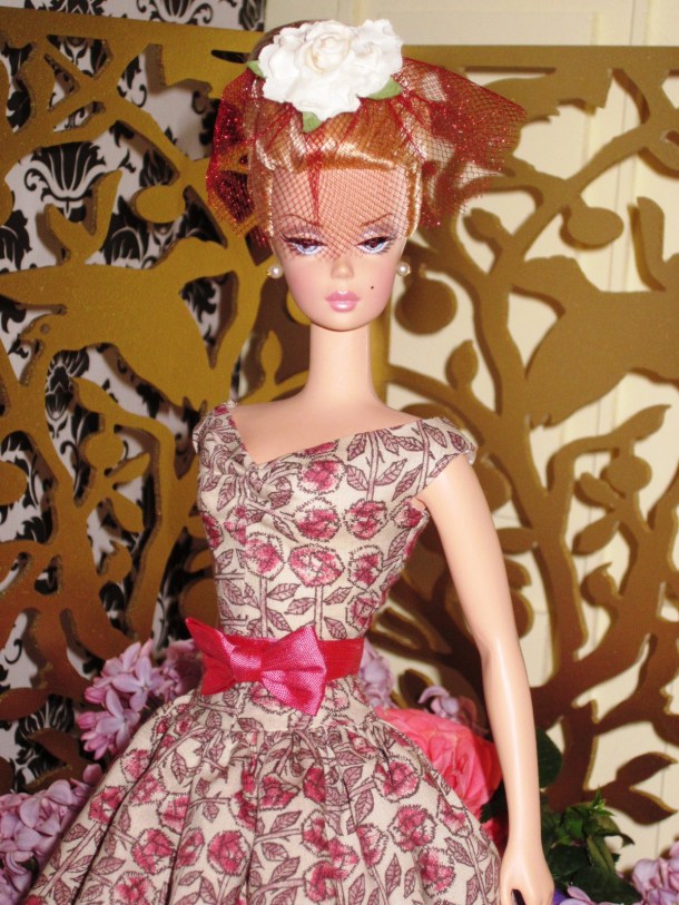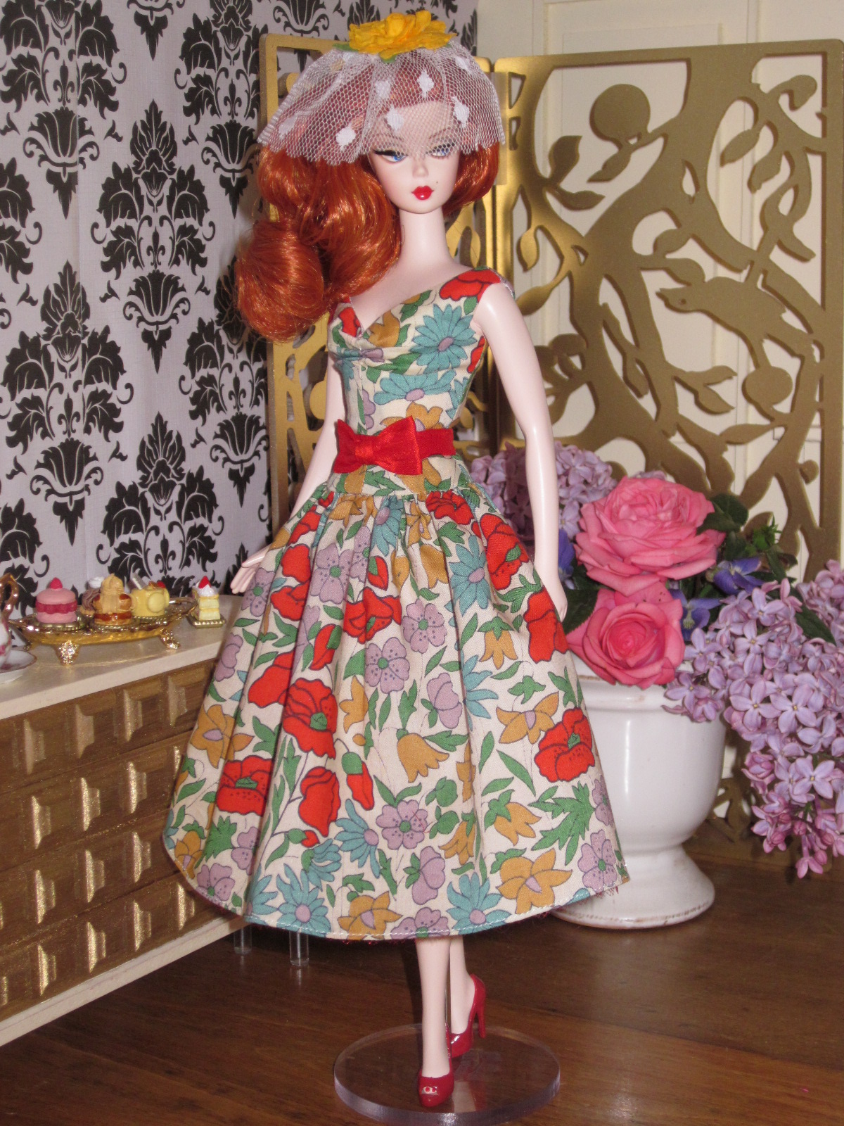 I adore this new Liberty fabric, cream decorated with stylized woodblock roses. The tones are subtle, but so enchanting. The scalloped tulle petticoat is in a sparkle cranberry shade, which is also the veil of the fascinator. A single cream rose crowns the ensemble. A cranberry silk belt and bow accents the waist.