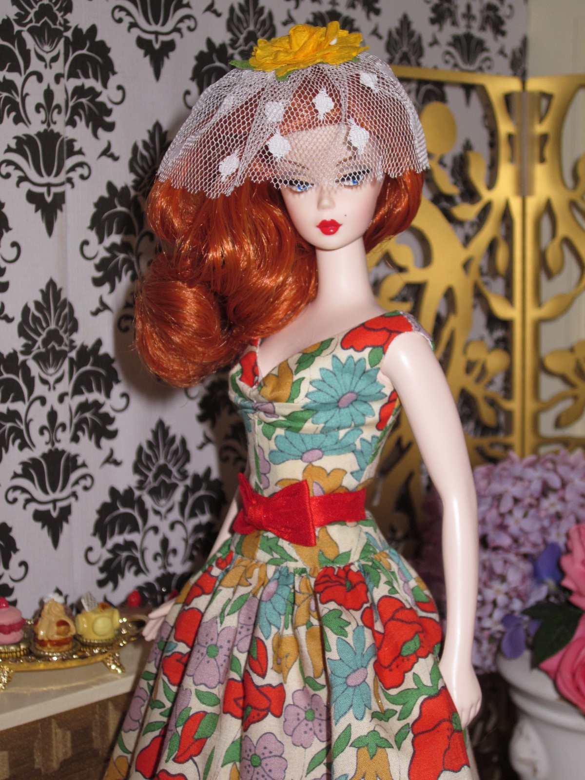 This print was designed for Liberty in 1974 and comes in many color combinations. The bright red poppies are the focal point. A scalloped red tulle underskirt peeks out from the hem. The bright yellow fascinator with white flocked tulle veil is included.