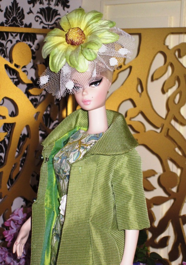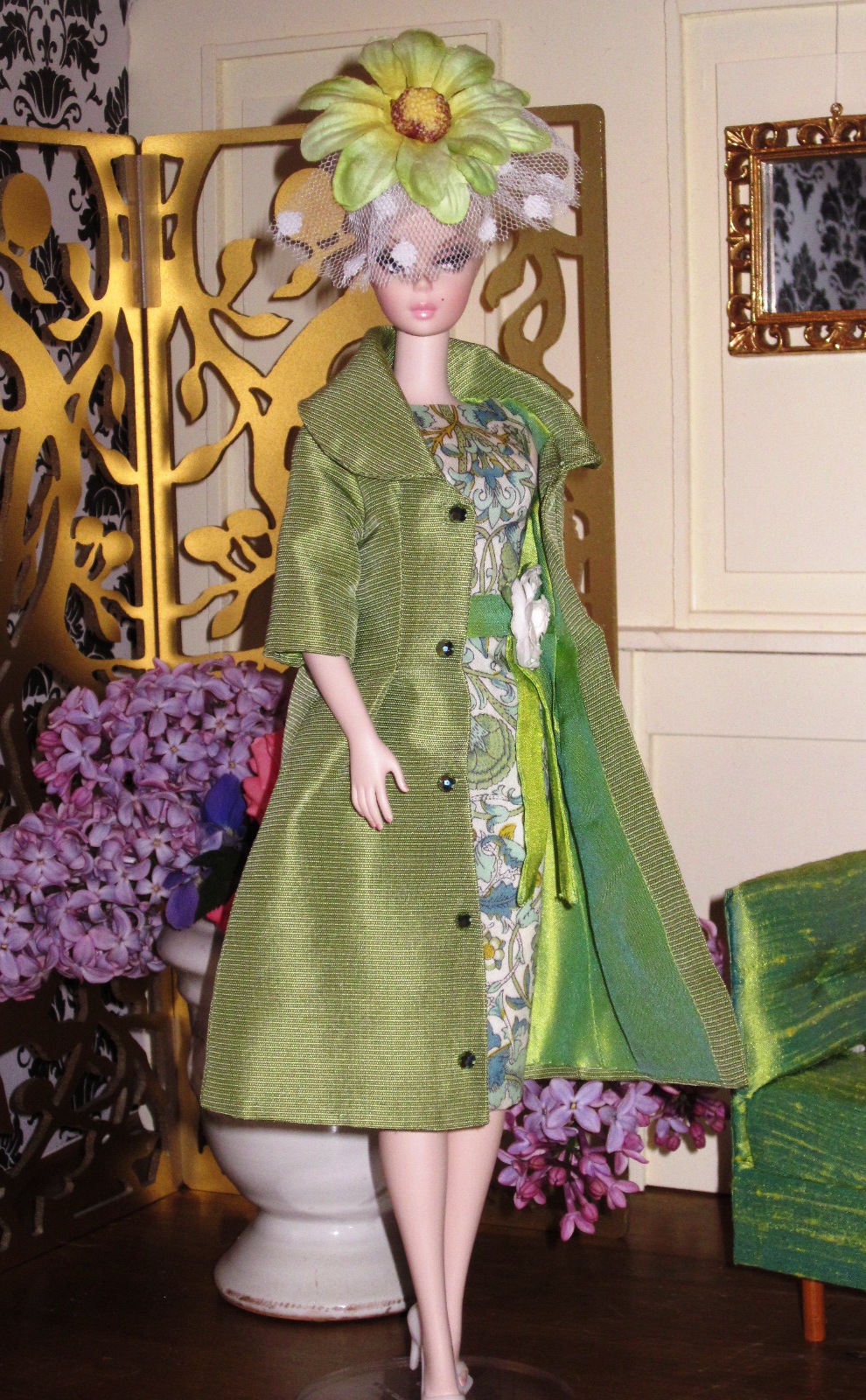 A shawl collared coat in spring green silk twill with faceted green crystal buttons tops this slim sheath in the classic Liberty Art Nouveau print “Lodden.” A spring green sash and creamy gardenia decorate the waist. The fascinator hat is included.