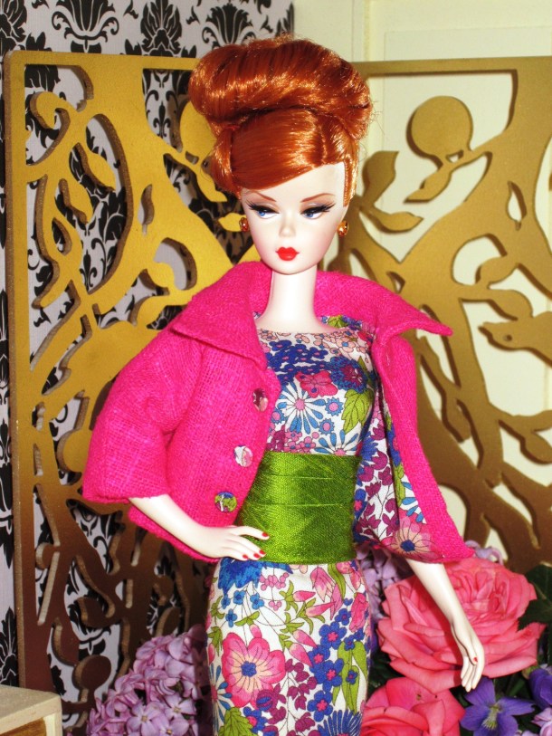 A bright pink silk noil cropped jacket with covered buttons and floral lining, matching the sheath. A vivid green cummerbund gives a pop of color.