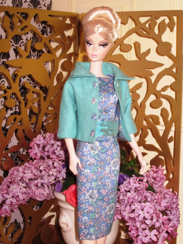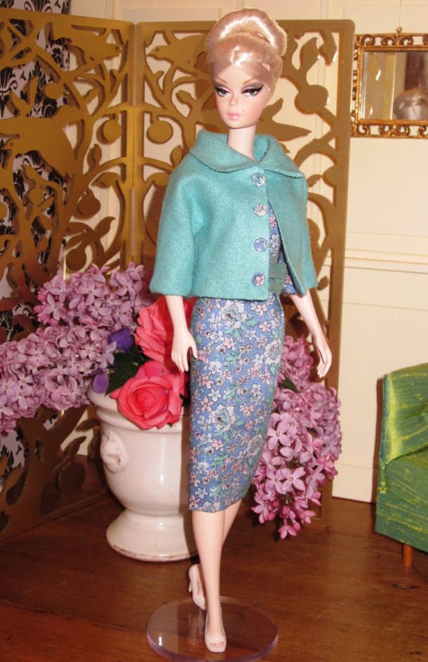 I LOVE this fabric, and sadly this is the last of it. I think I only had a fat quarter in the first place. I haven’t been able to find out the name of the fabric, but it is so delicate and beautiful. The sheath is decorated at the waist with an aqua silk taffeta sash and bow. Pale aqua silk noil makes up the jacket, which has covered buttons and a floral lining to match the sheath.