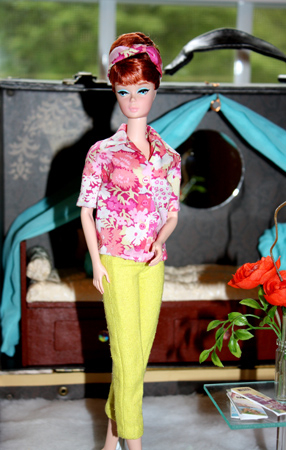 During her visit to Rome, Barbie plans to wear this casual ensemble of chartreuse silk noil capri pants and a bright, summery floral blouse in Liberty of London cotton. Her hair is kept in place with a knotted floral headscarf, even if her plans include a ride through the busy Roman streets on a Vespa!