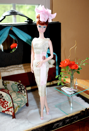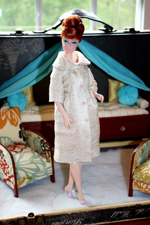 Finally, Barbie models her elegant evening coat ensemble in cream and pale gold floral silk brocade, lined in pale pink silk, that she plans to wear to the ballet in St. Petersburg. A pale pink silk petal hat tops off the ensemble.