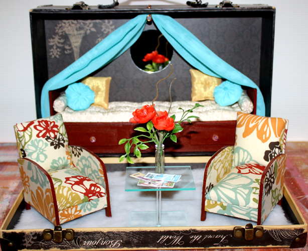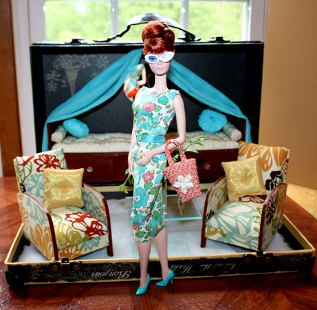 I was so thrilled to be asked to contribute a doll to the Golden Ticket Bon Voyage event at this summer’s Barbie Convention (for more information on this very cool event, look here). I had been looking forward to the theme of the Grand Tour for two years, so I immediately knew that I wanted Barbie to have a Stateroom and a travel wardrobe. The wardrobe, I could handle, but for the Stateroom there was only one place to turn, and that was to Maryann Roy, of Welcome Home. And boy, did she deliver! Here are some sneak peeks of the set that we created. It was such a fun project and we hope that you love it as much as we do. If you are attending the Barbie Convention this summer you will receive 20 Golden Tickets and 20 chances to win this set!