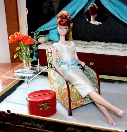 And here is Barbie herself, relaxing in her Stateroom and looking elegant in a Parisian ensemble in cream, figured silk that she has packed to wear to the Moulin Rouge. The top is trimmed with a pale blue tulle ruffle at the hem and a blue silk bow at the waist. Barbie’s makeup and her stunning red hair has been re-styled by Maryann. Her red leather carry-on bag, floral arrangement, Eiffel Tower and travel brochures are also included.