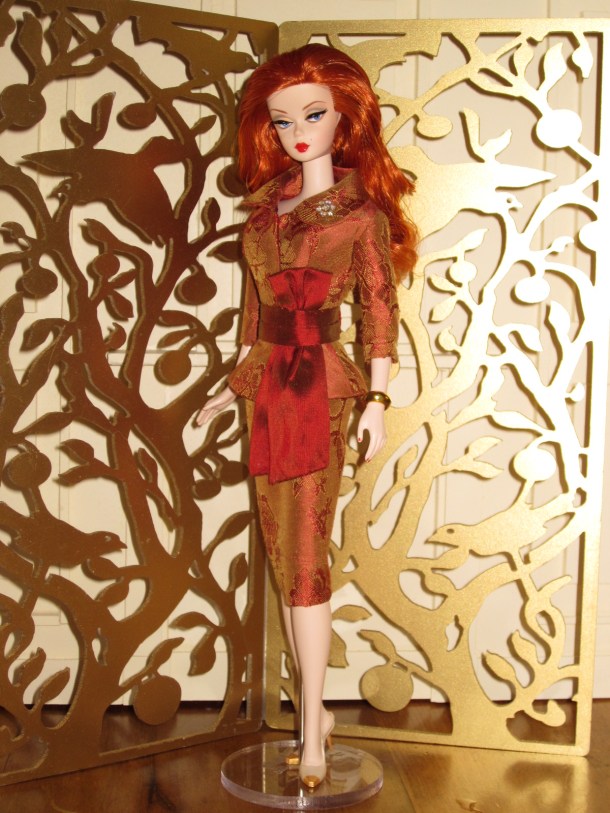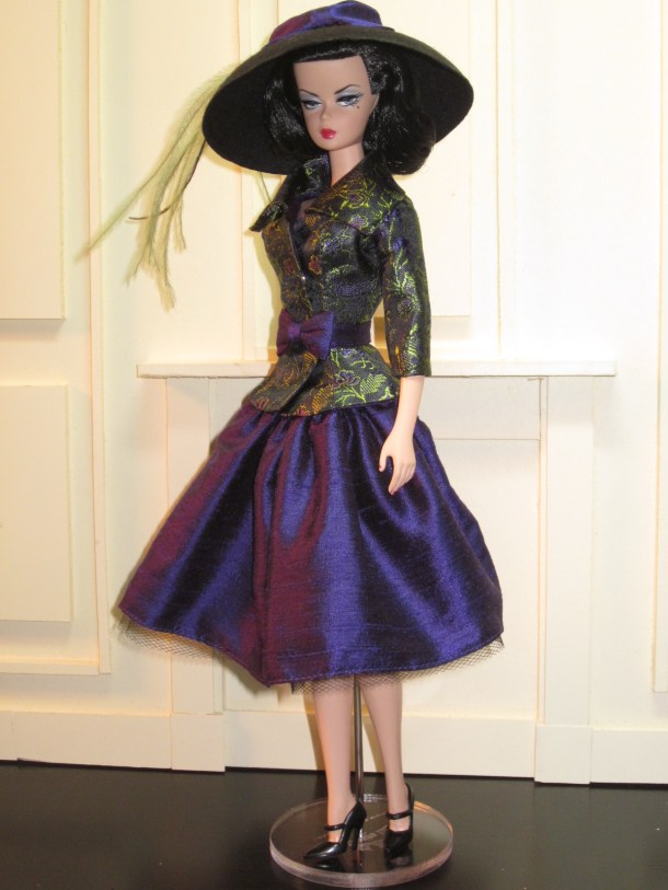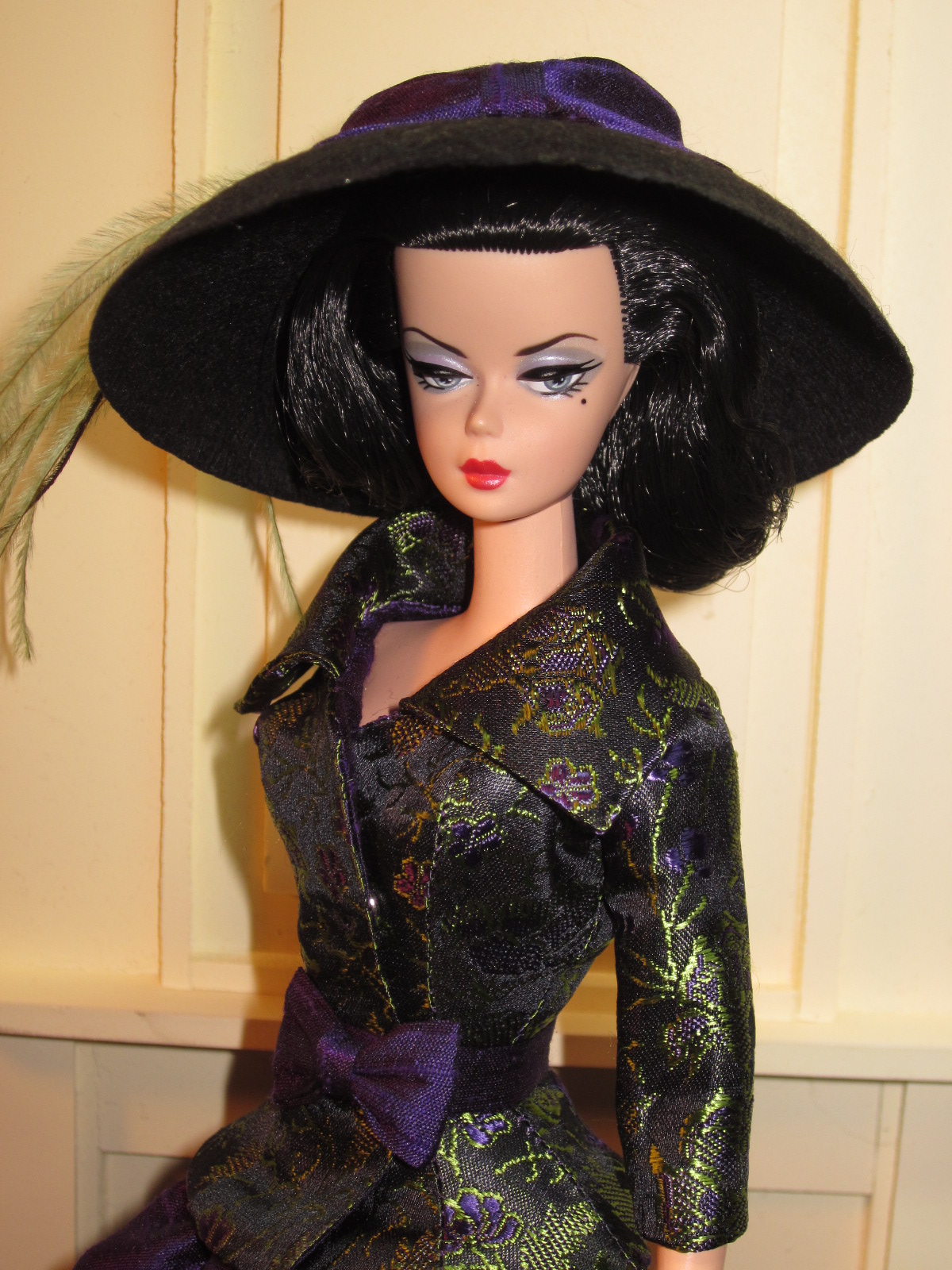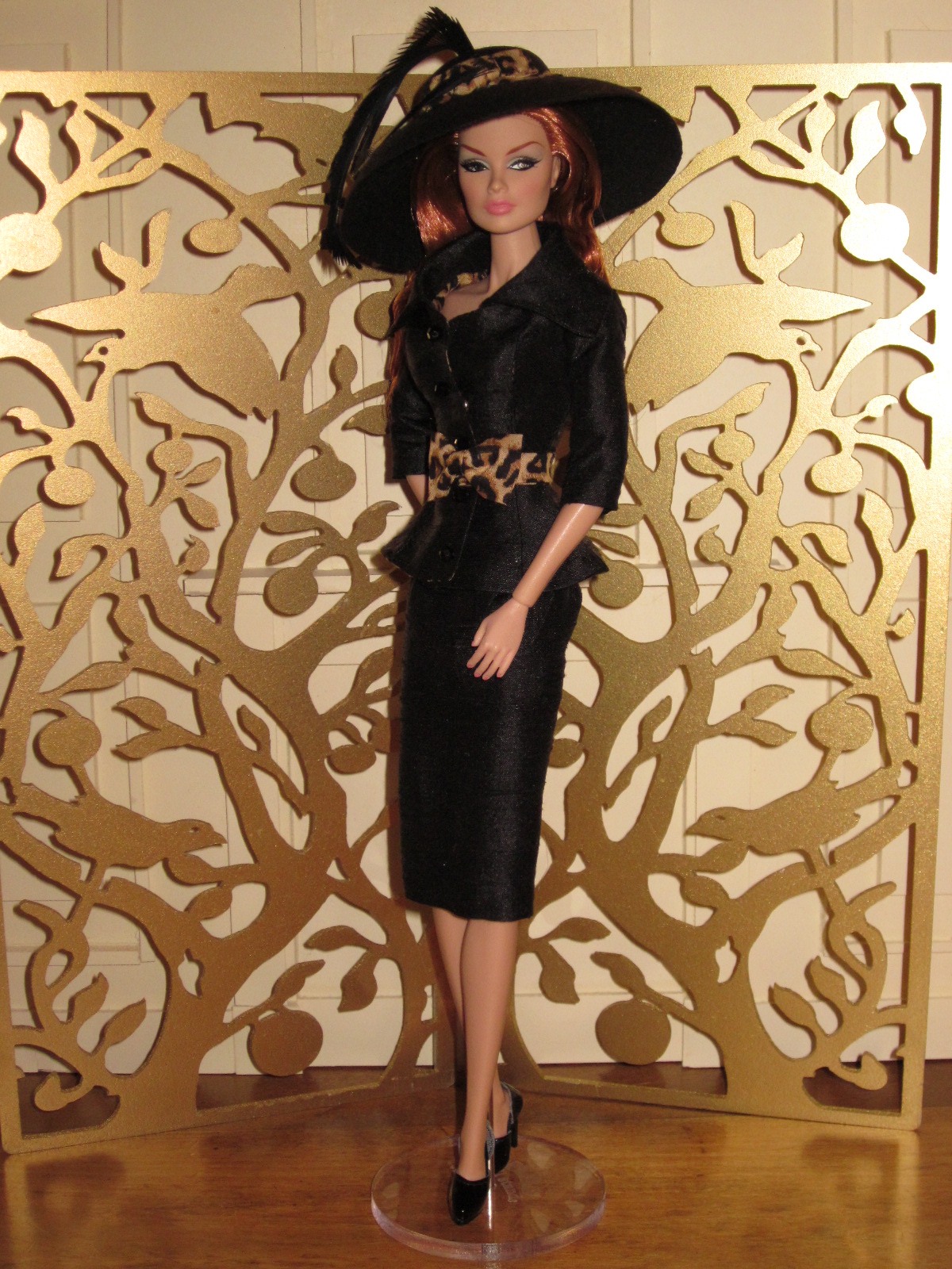 There is nothing like a touch of leopard to add pizazz to a black silk suit. Veronique is ultra chic in this elegant suit in black silk dupioni. The jacket has a peplum, wide collar and faceted jet buttons. It is fully lined in leopard, which peeks out at the neckline and decorates the waistline in the form of a bow belt. A slim pencil skirt completes the suit. An extravagant black hat sports a leopard bow and elegant black feather curls.