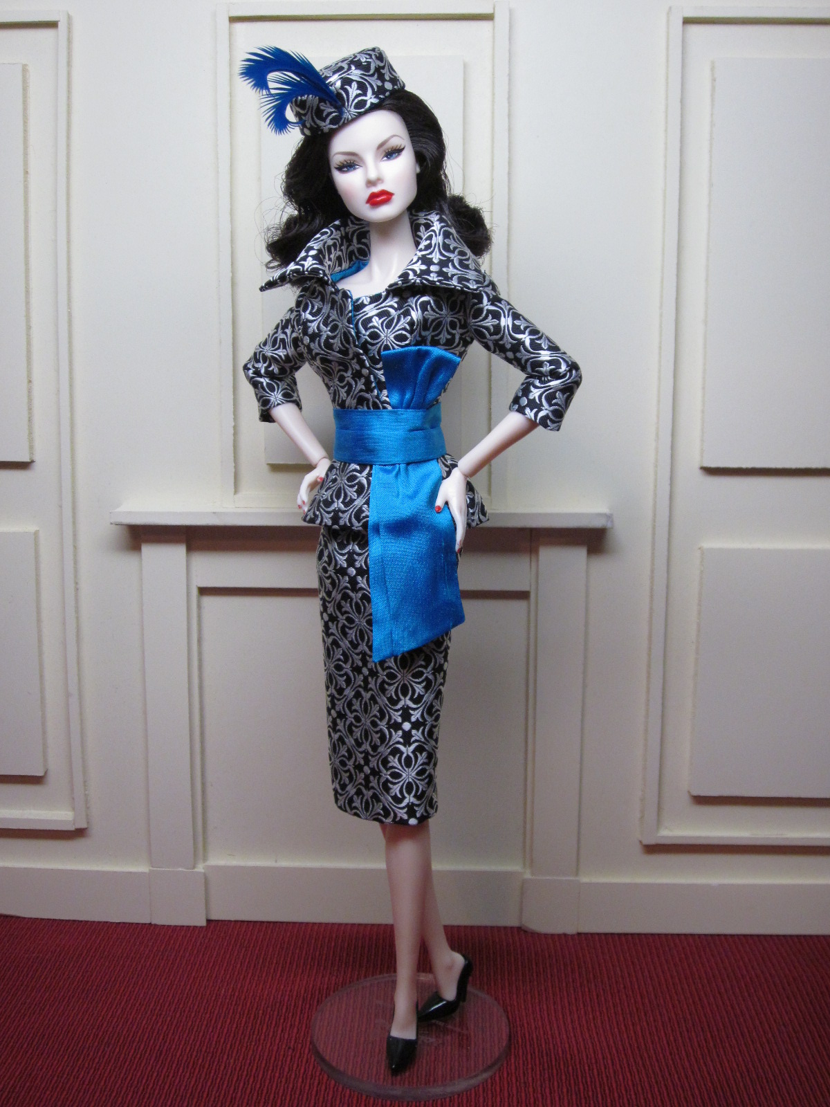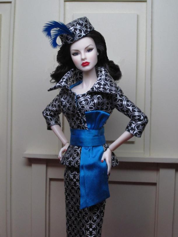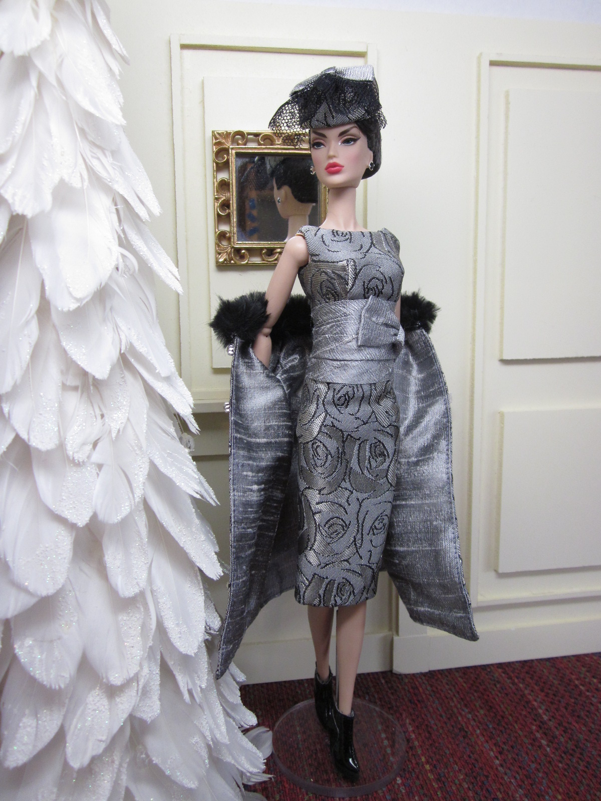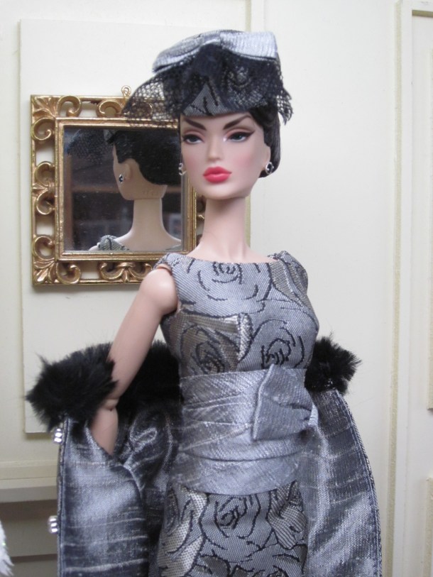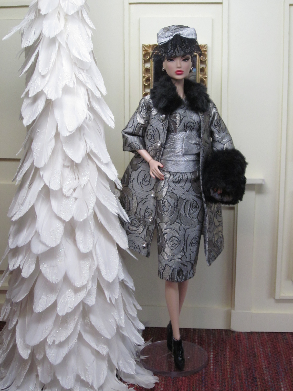 The sheath dress sports a ruched silk cummerbund and bow detail. Accessories include a black (faux) fur muff, fully lined in silver silk dupioni, a pillbox hat in silver brocade with bow and black net veil, and black Swarovski crystal earrings.