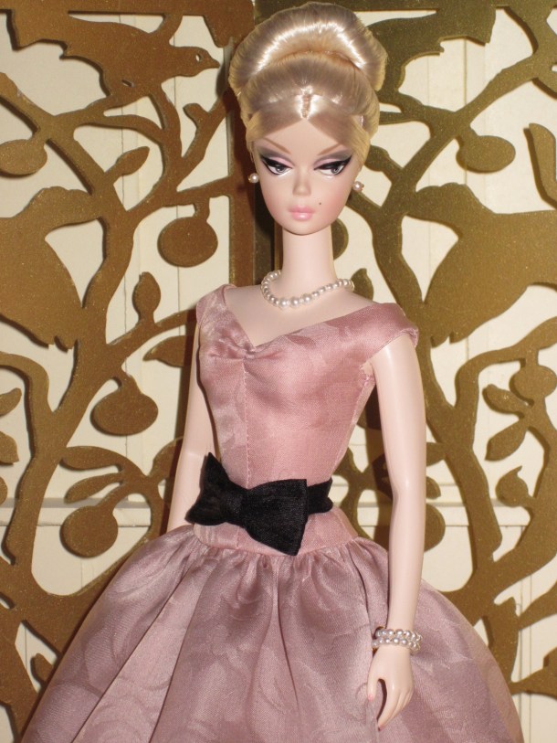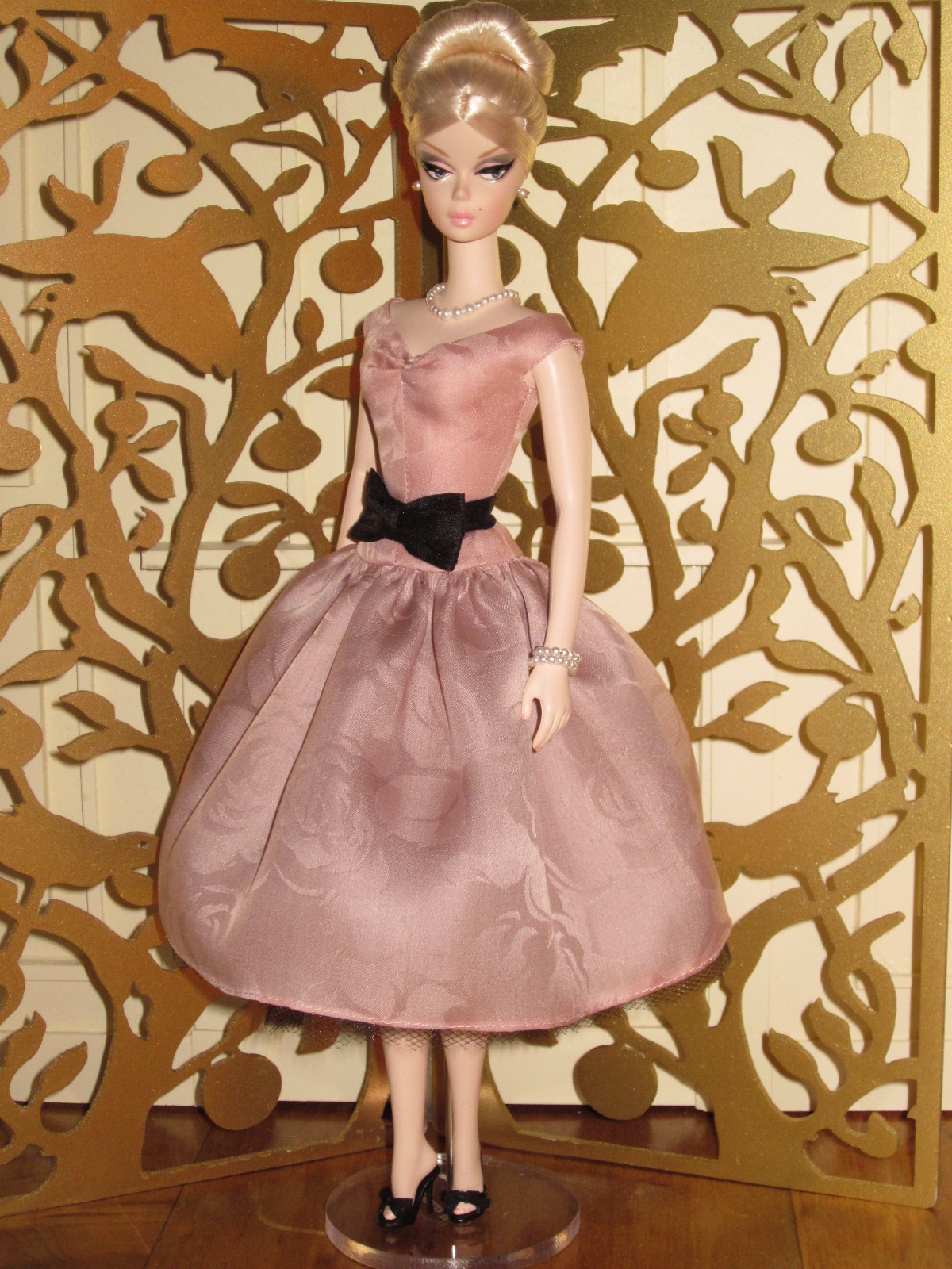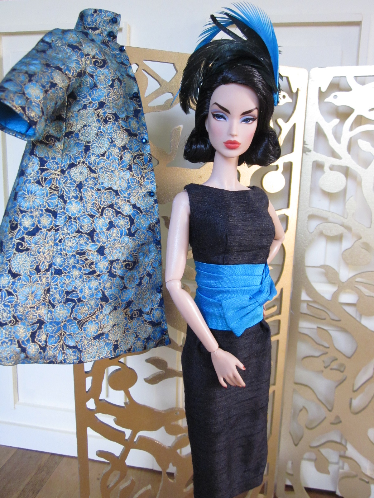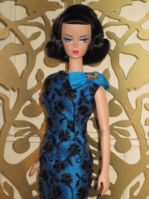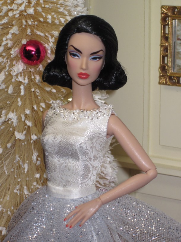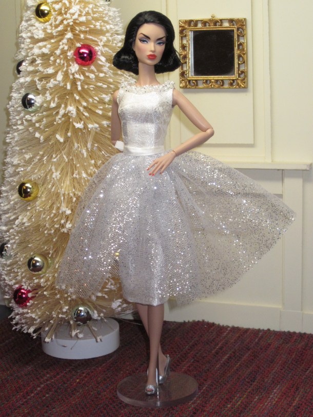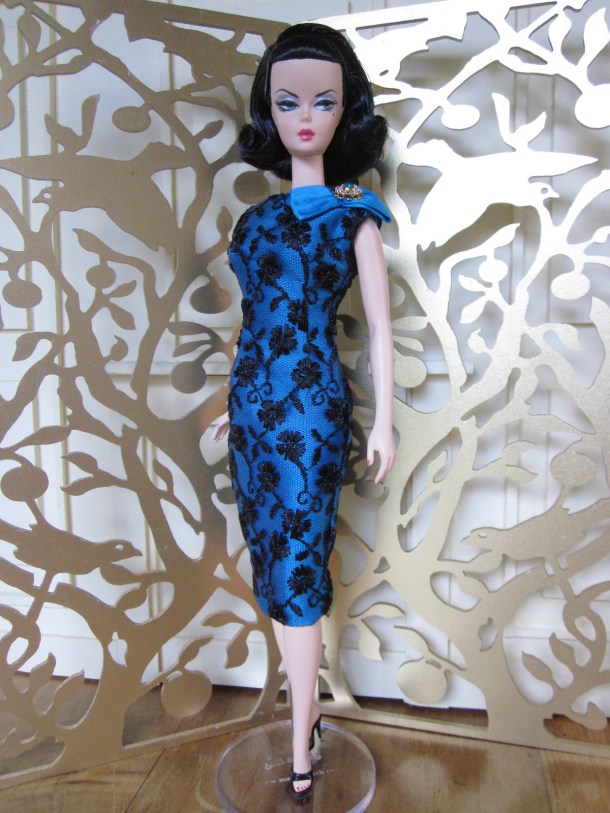 The sheath dress sports a ruched silk cummerbund and bow detail. Accessories include a black (faux) fur muff, fully lined in silver silk dupioni, a pillbox hat in silver brocade with bow and black net veil, and black Swarovski crystal earrings.
