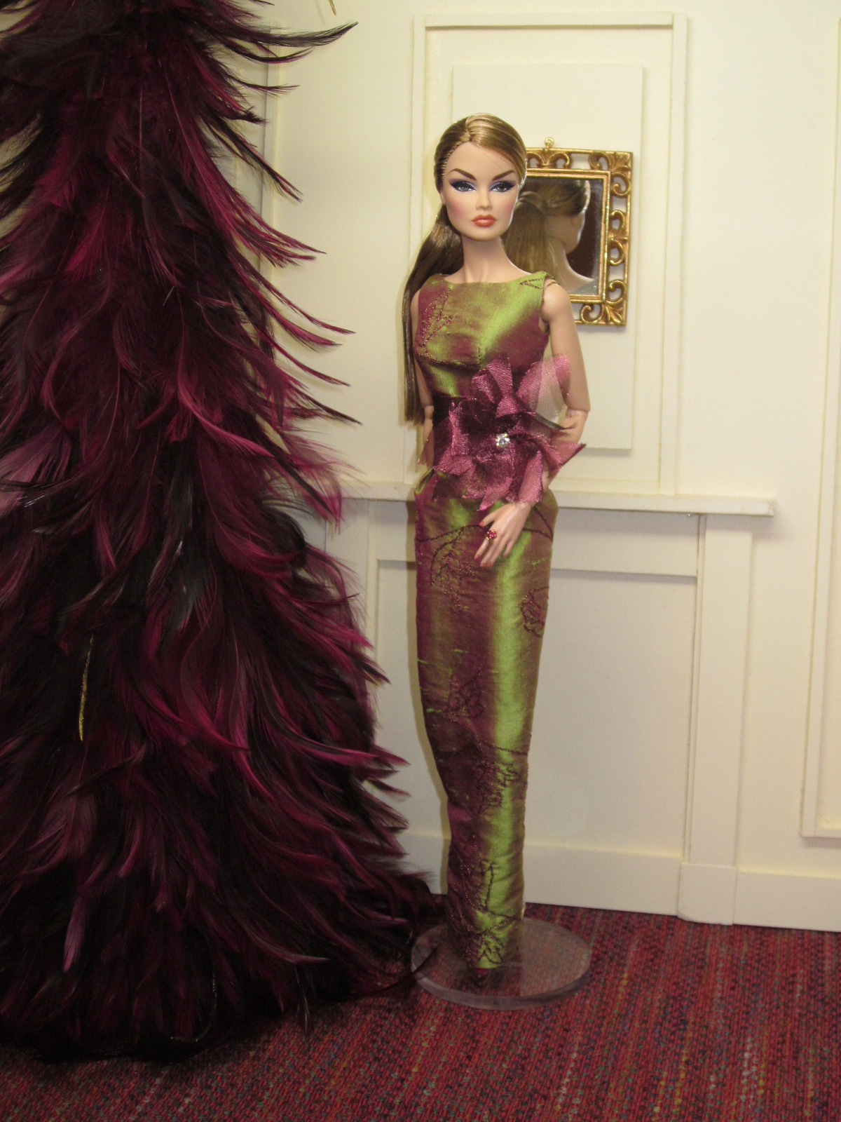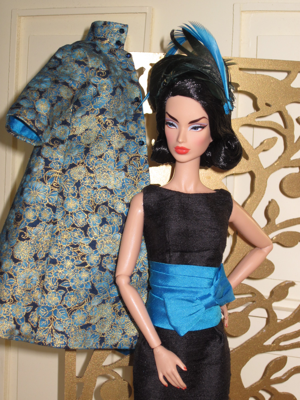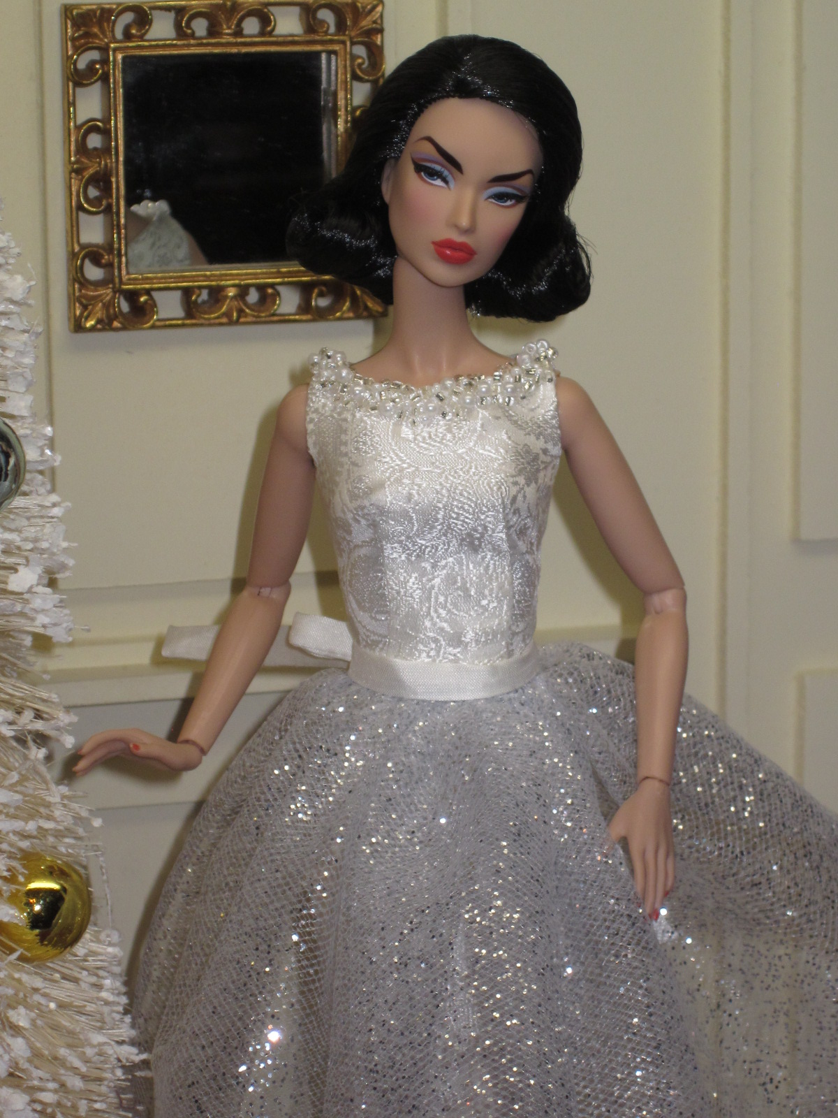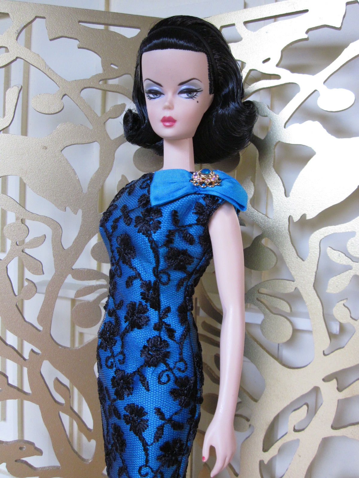 The sheath dress sports a ruched silk cummerbund and bow detail. Accessories include a black (faux) fur muff, fully lined in silver silk dupioni, a pillbox hat in silver brocade with bow and black net veil, and black Swarovski crystal earrings.