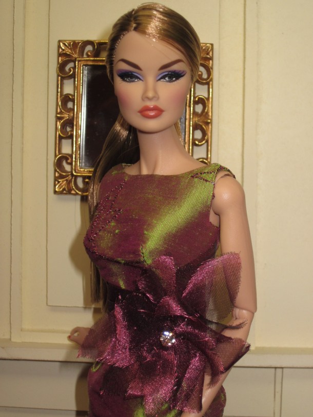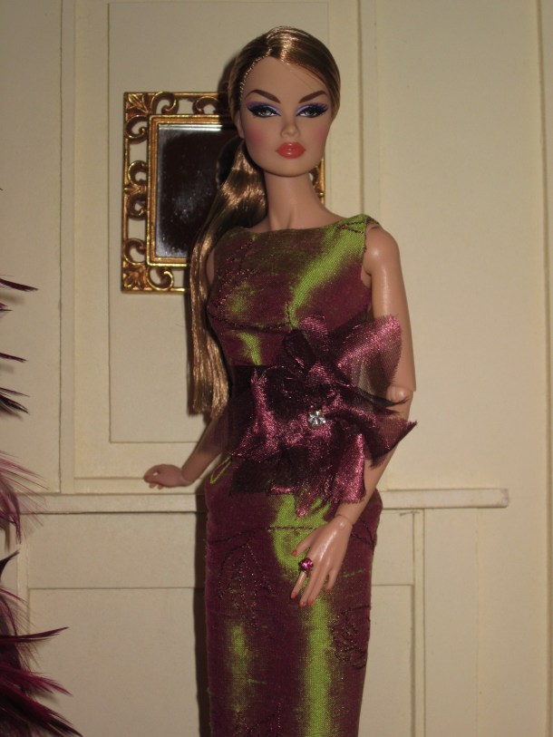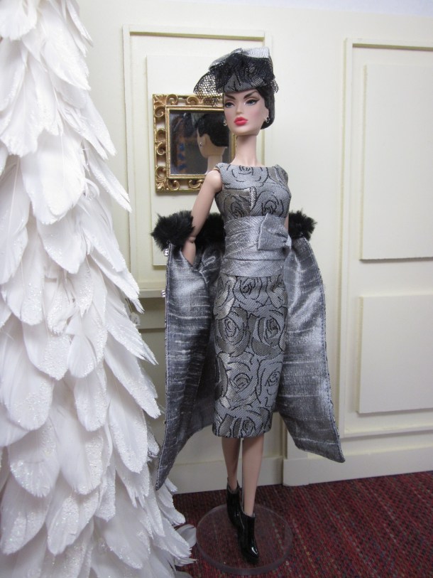 The subtle play of shiny and matte tones of silver in the fabric of the coat and sheath results in a supremely elegant and sophisticated look for this festive time of year. The swing coat is fully lined in silver silk dupioni and features a black (faux) fur collar and Swarovski crystal buttons.