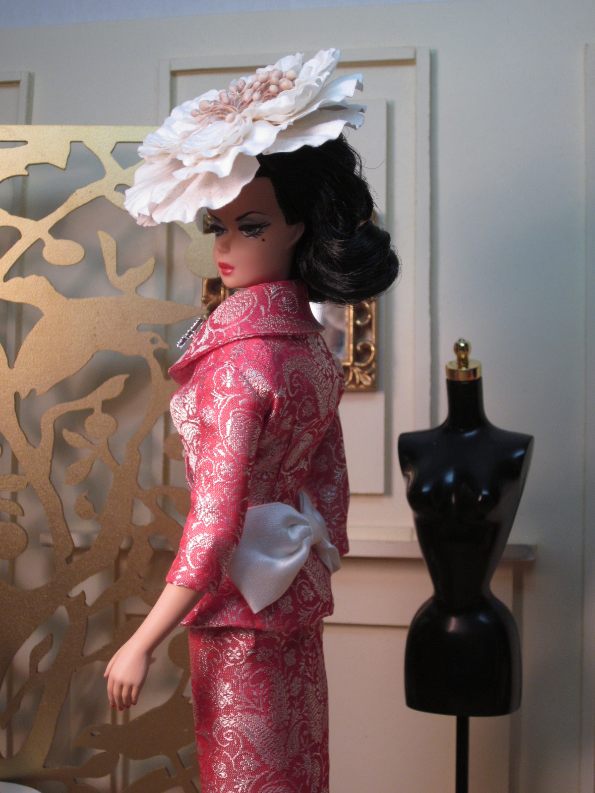 The shawl collar beautifully frames the face and a tiny Eiffel Tower pin adds sparkle. Tiny pearl buttons decorate the front of the jacket and a large, white silk satin bow nestles in the small of the back.