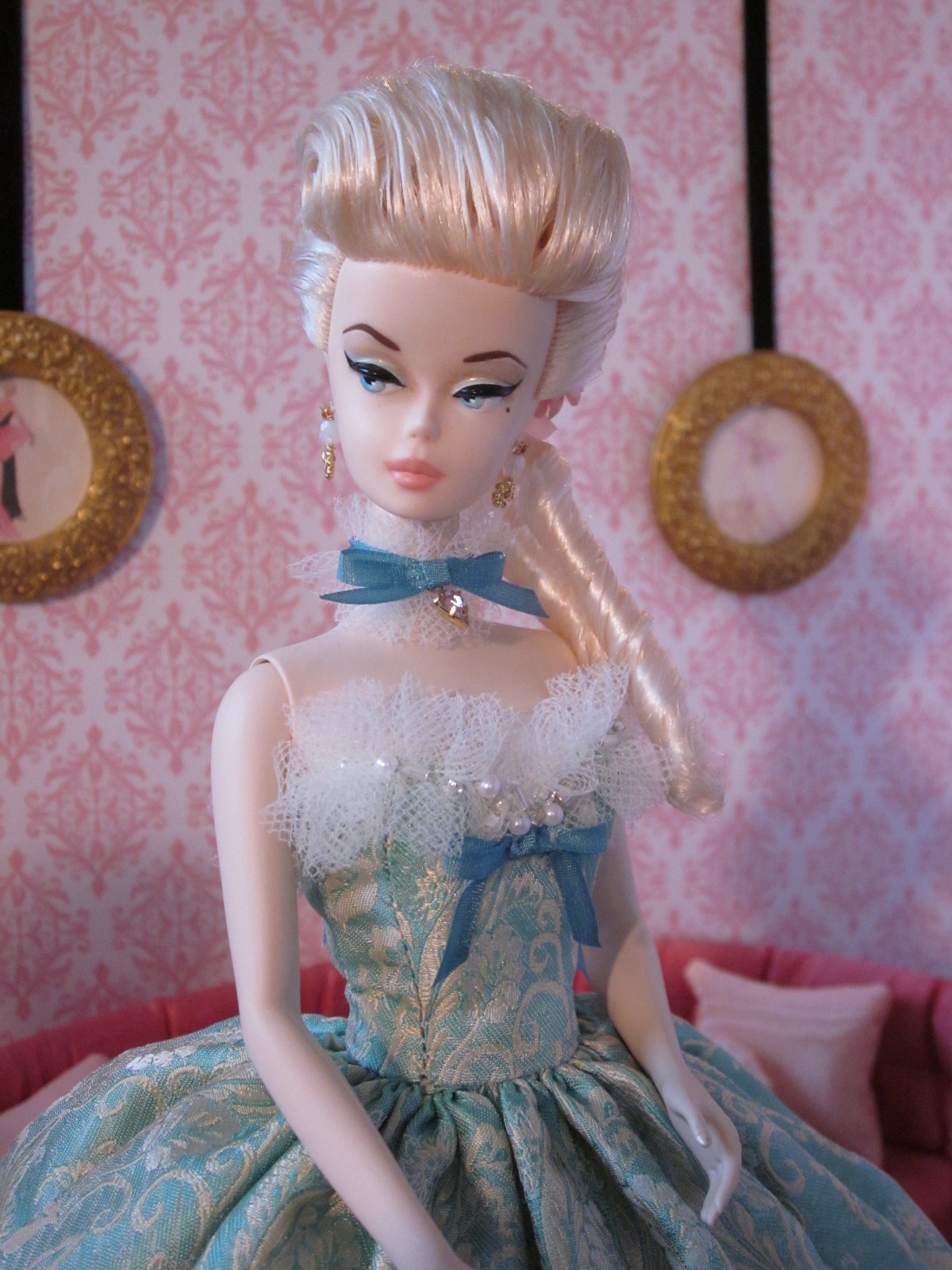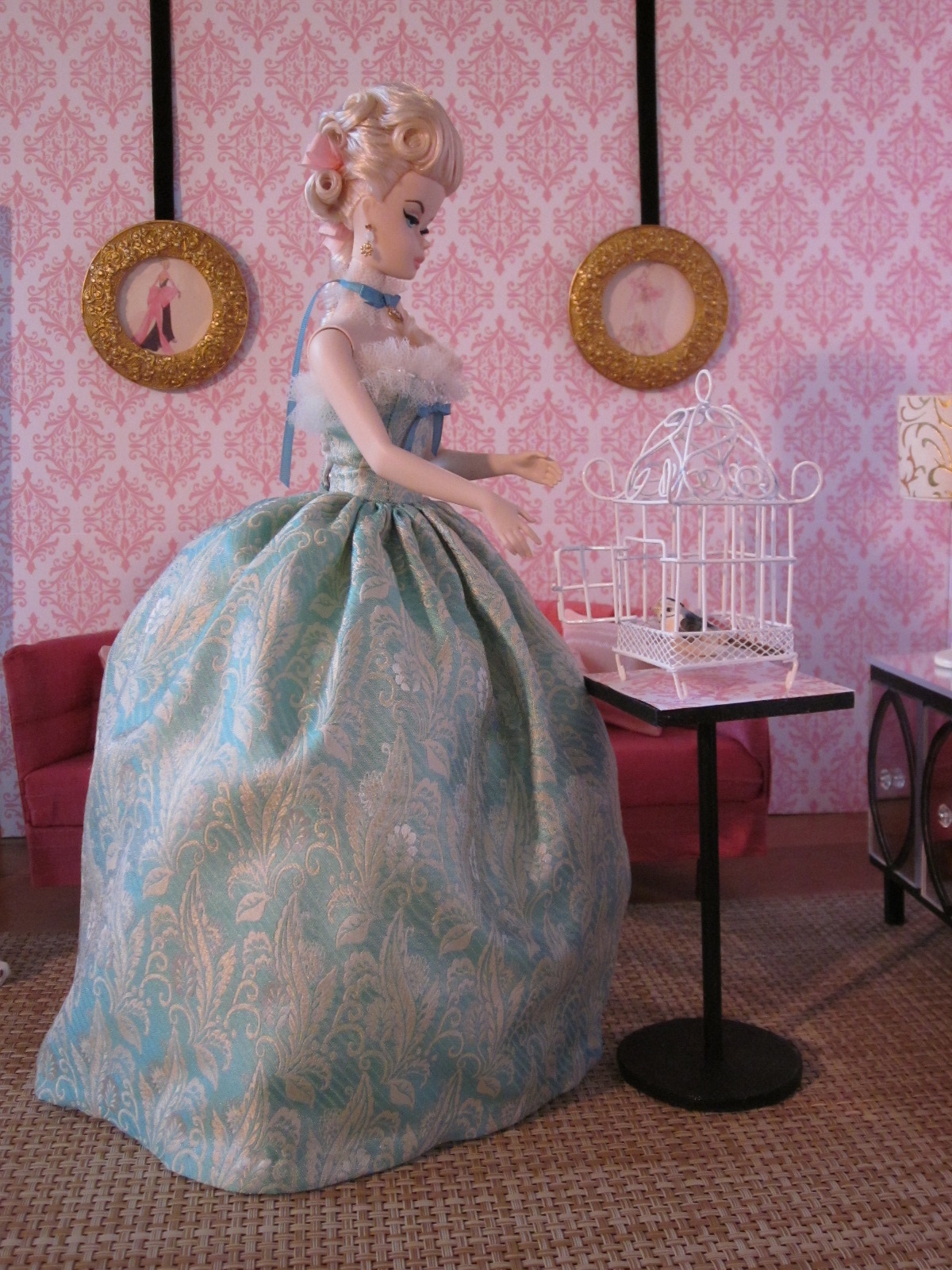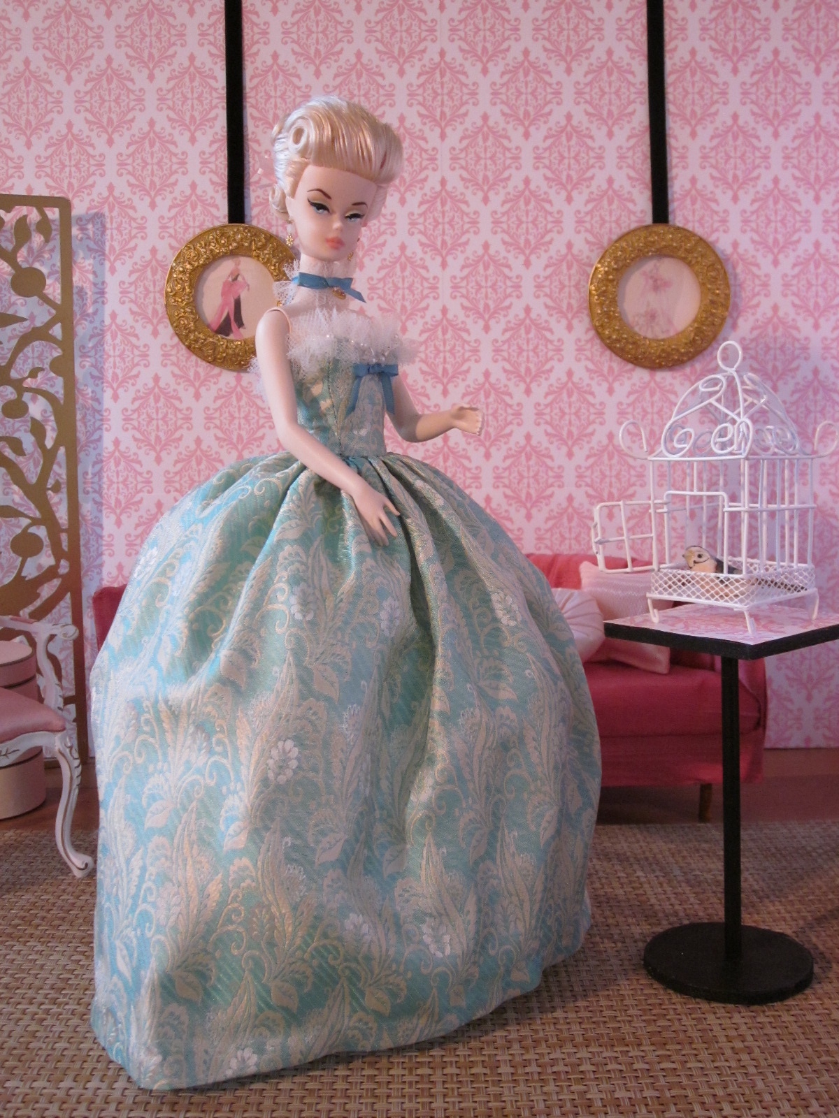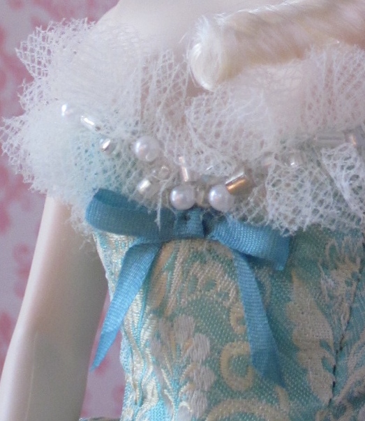 Another gown for the queen, this time in a dreamy sea foam green French silk brocade woven with cream feathers and flowers. The strapless sweetheart bodice is trimmed with a double tulle ruffle with tiny sparkling beads and an aqua silk ribbon bow. The skirt is made full by the tulle petticoat beneath. A tulle and silk ribbon necklace with lavender crystal drop included.