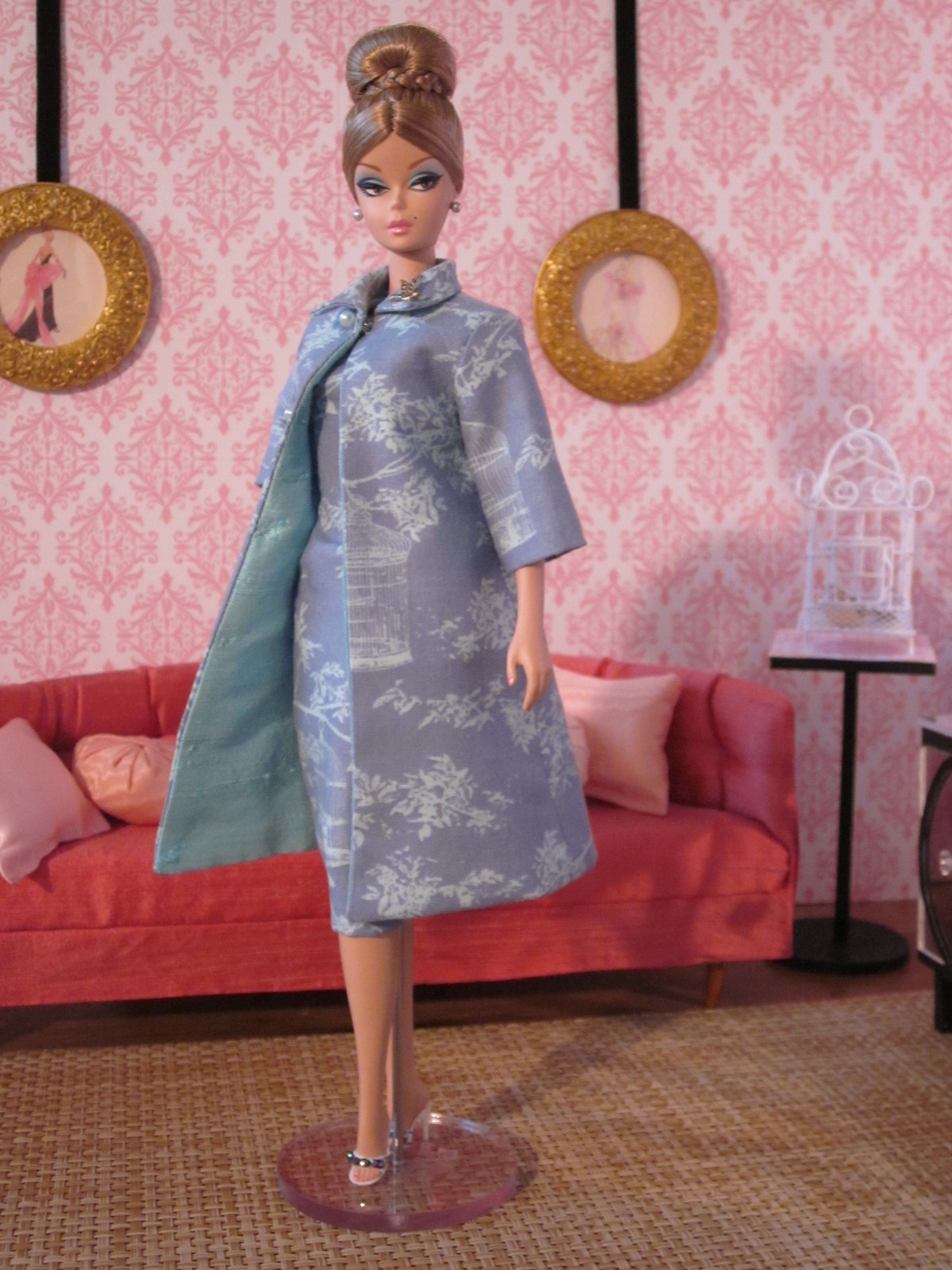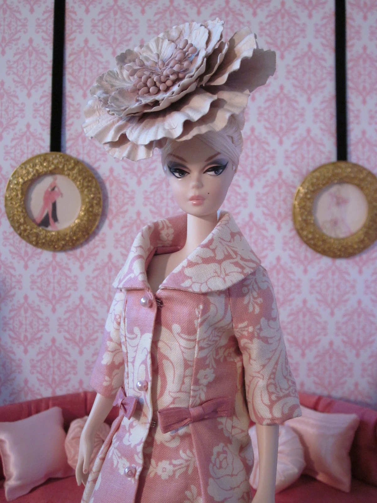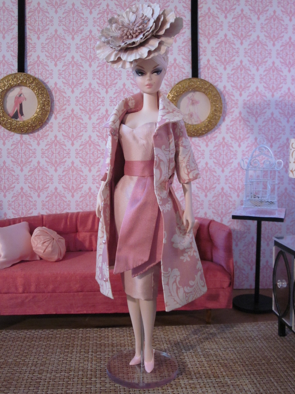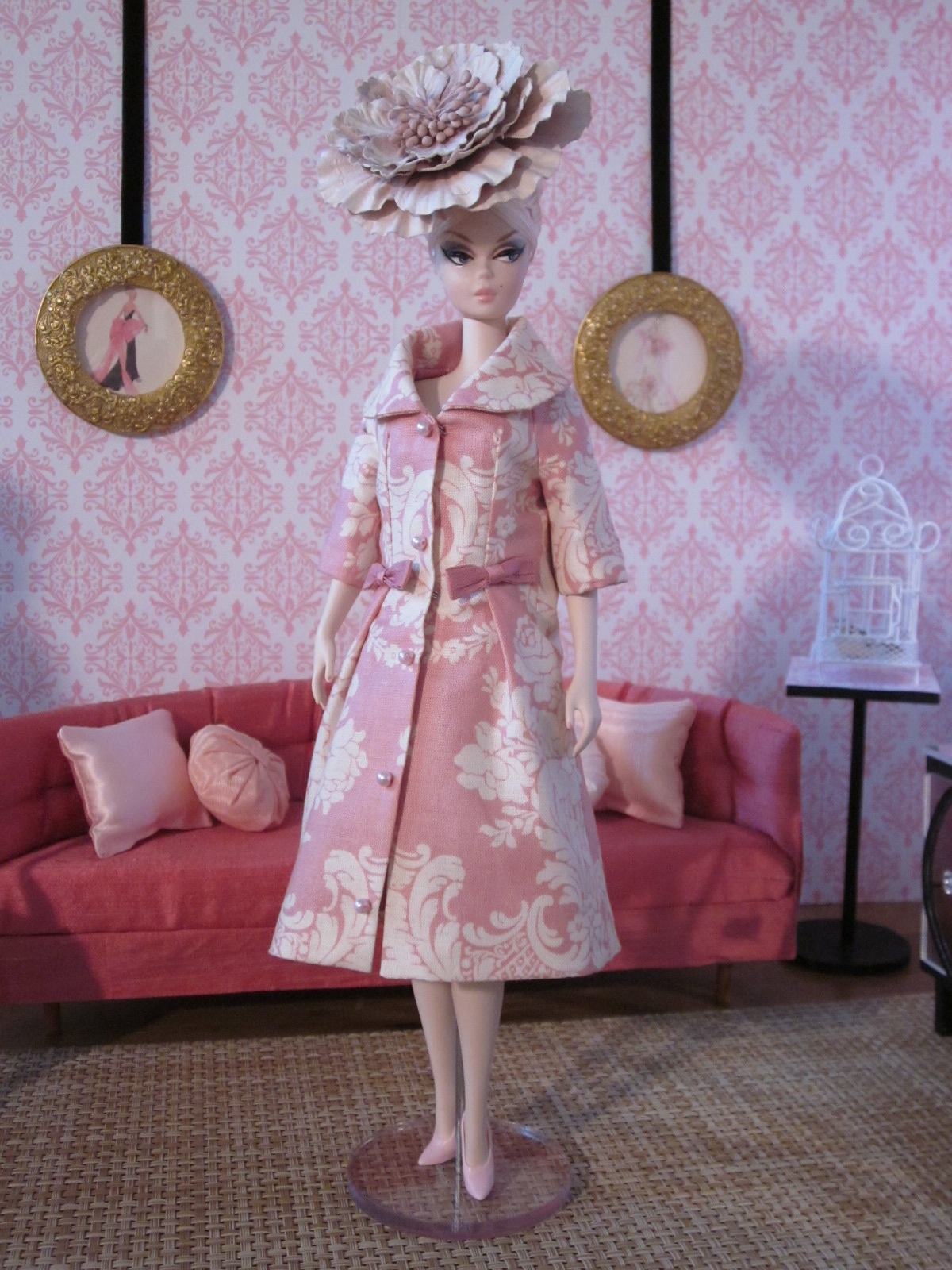 This rose pink and cream damask fabric has been a passion of mine for several years, but I have been saving it for this particular collection. I am just in love with it. The shawl collared coat with front pleats, pale pink pearl buttons and tiny bows is so feminine. The coat is fully lined in dark rose silk. A simple evening sheath in shell pink silk taffeta sports a dark rose silk sash. A blush pink flower hat is the grand finale.