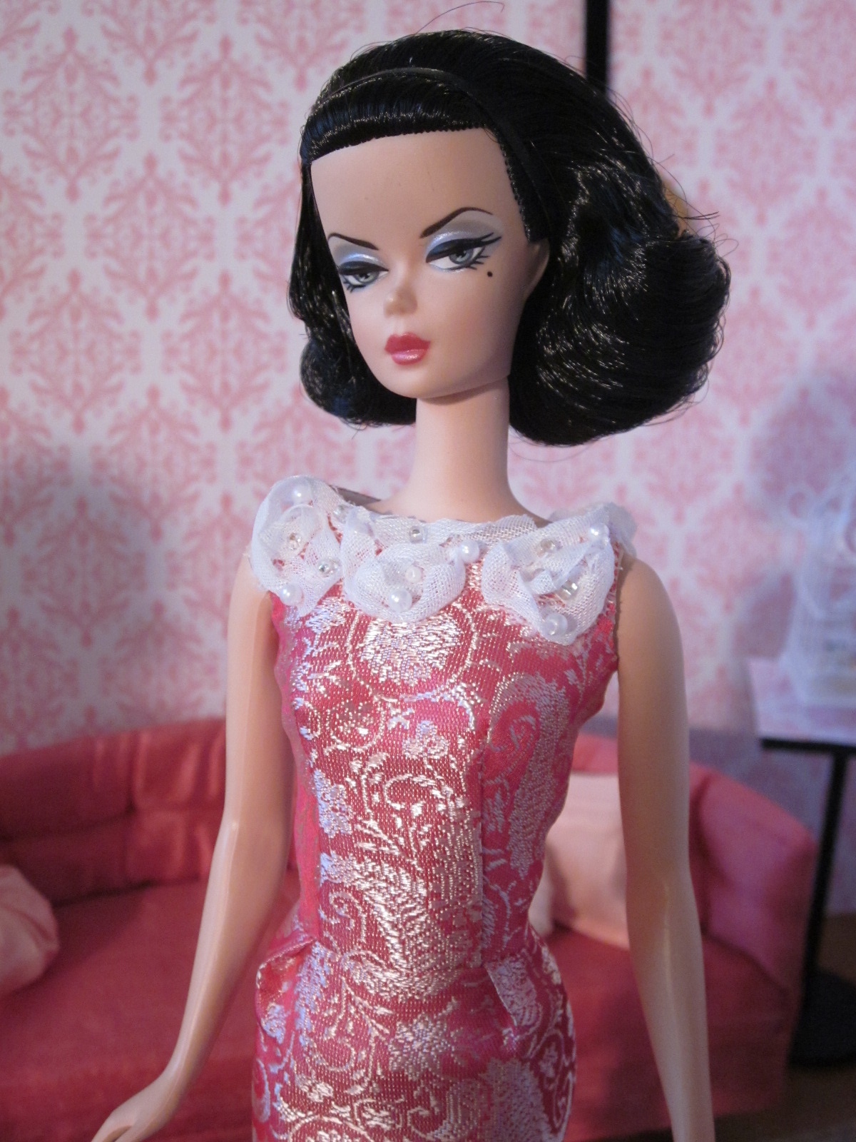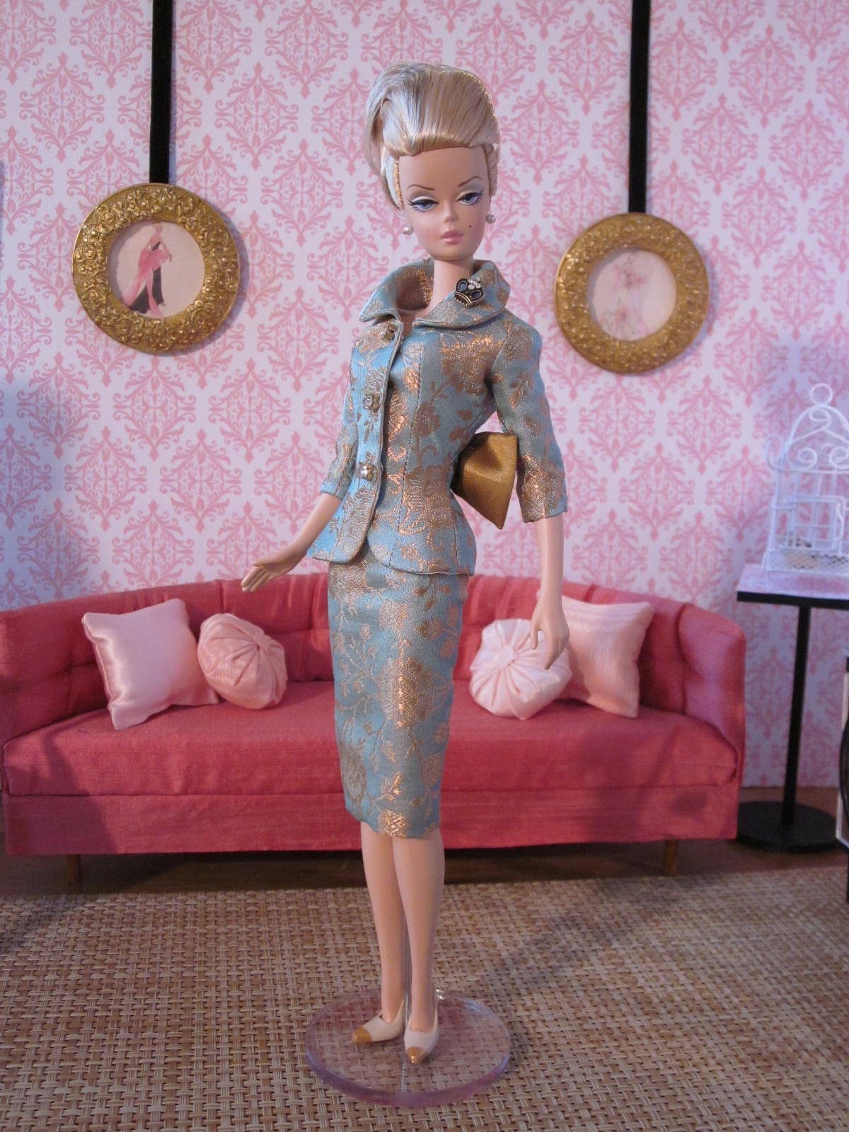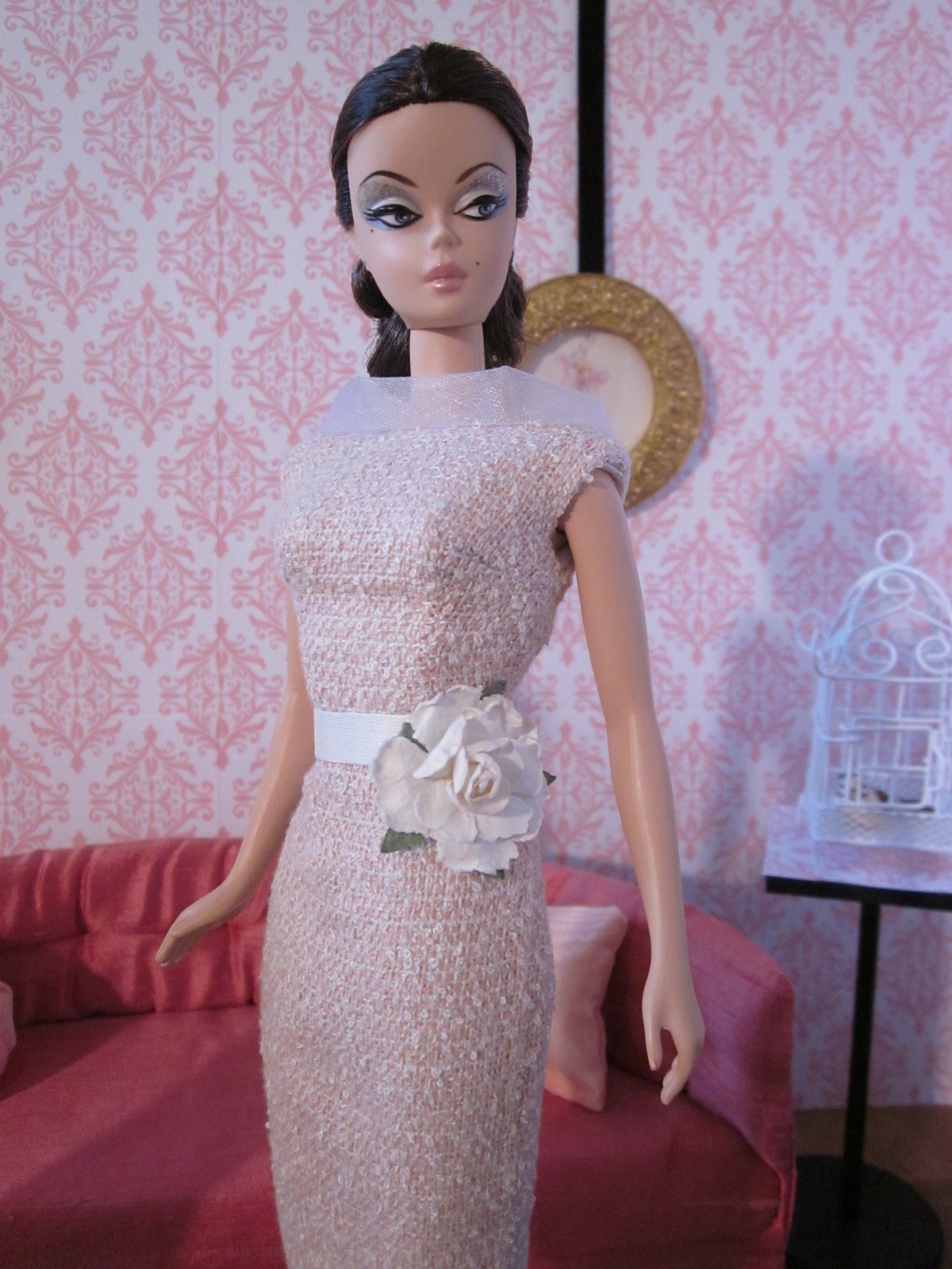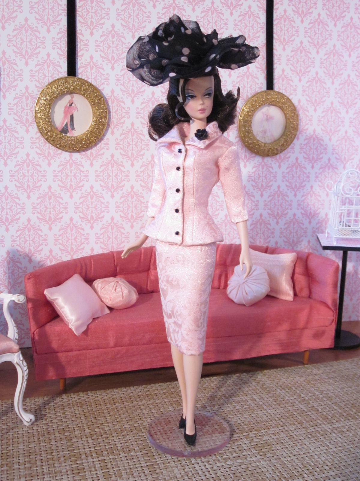 This rose pink and cream damask fabric has been a passion of mine for several years, but I have been saving it for this particular collection. I am just in love with it. The shawl collared coat with front pleats, pale pink pearl buttons and tiny bows is so feminine. The coat is fully lined in dark rose silk. A simple evening sheath in shell pink silk taffeta sports a dark rose silk sash. A blush pink flower hat is the grand finale.