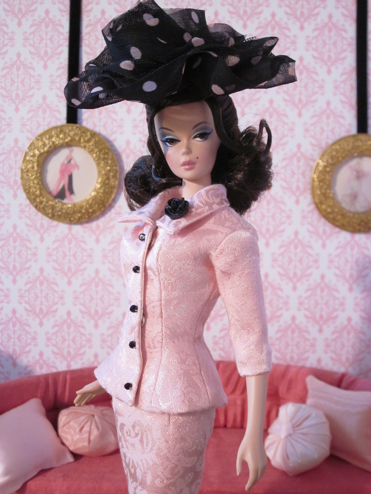 A pink tonal damask suit sports black faceted glass buttons and a black rose brooch on the collar. An extravagant hat of pink dotted black chiffon and tulle is a dramatic flourish to this elegant suit.