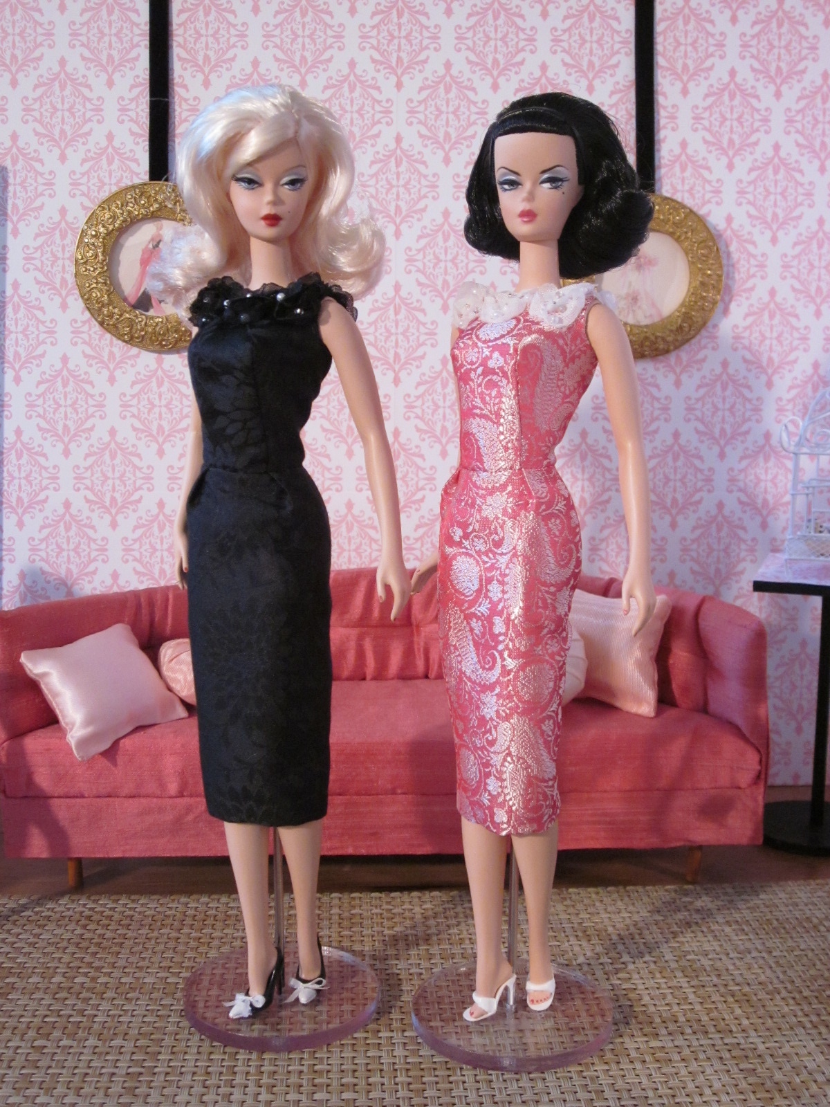 Chantilly means whipped cream in French and the frothy treatment at the necklines of these sheaths reminds me of something sweet, light and airy. The black sheath is made from figured black silk with black chiffon rosette trim around the neck. The raspberry pink dress is trimmed with white chiffon roses. Each neckline sparkles with hand sewn beads and crystals.