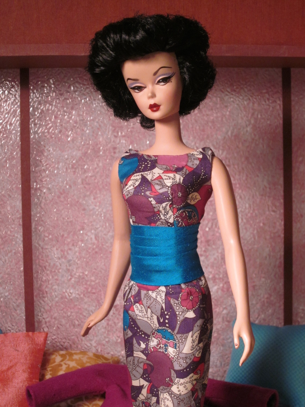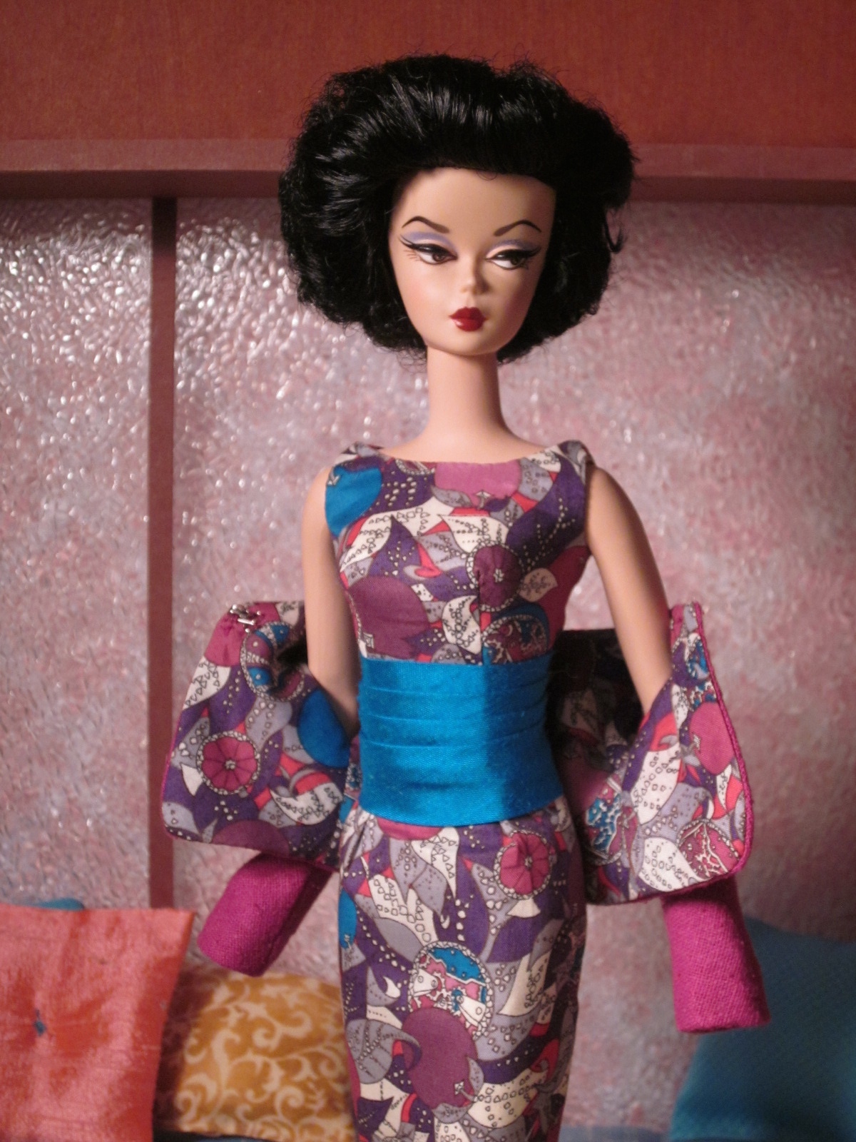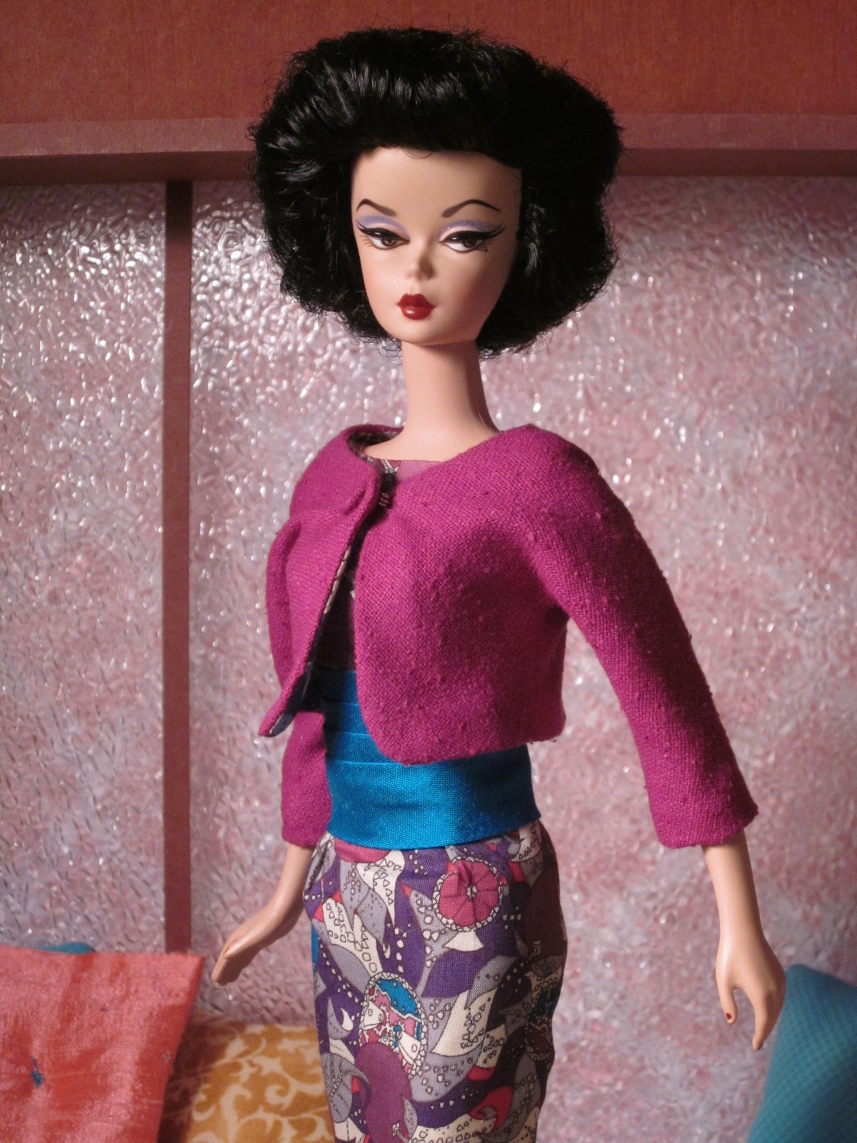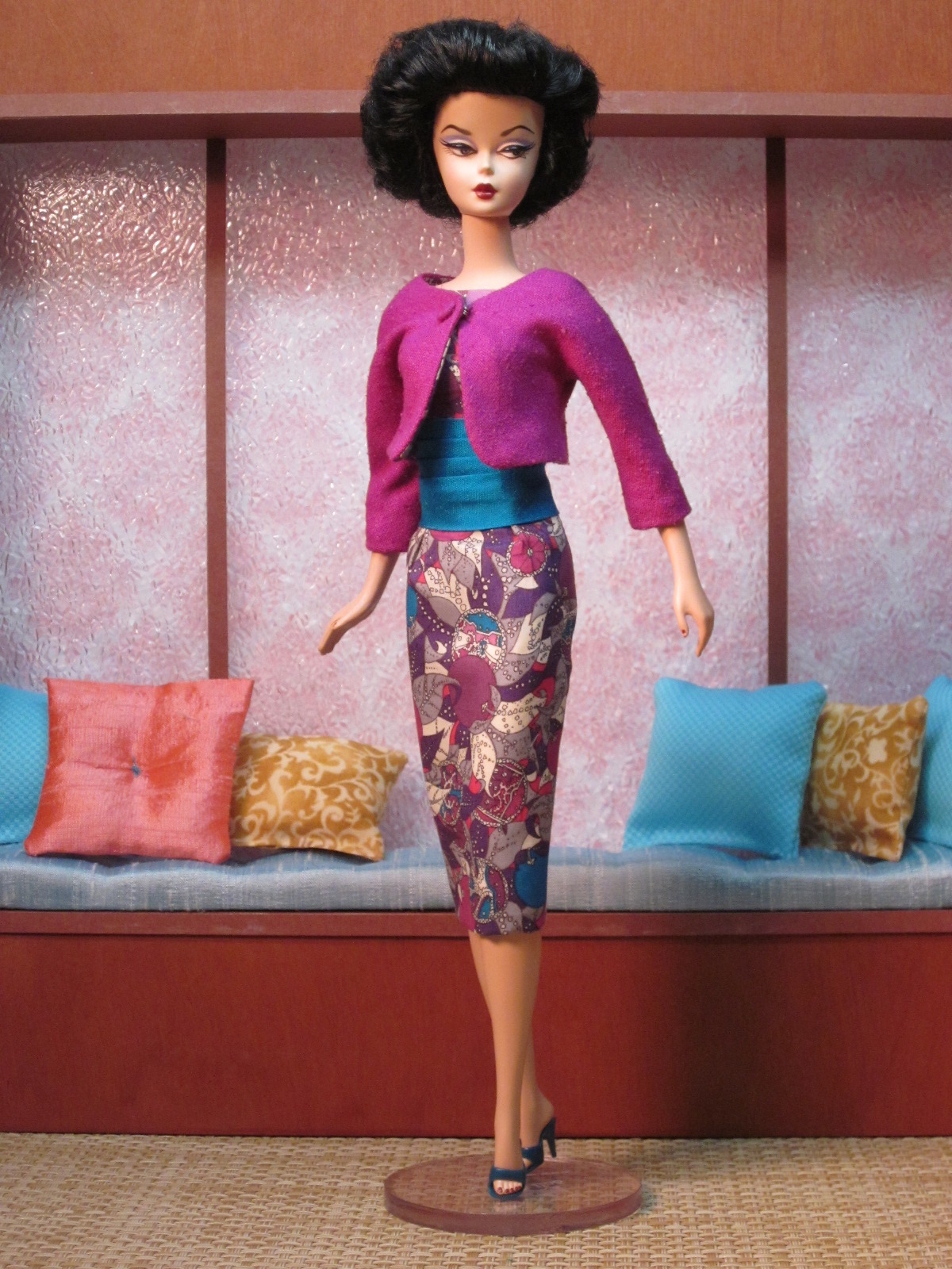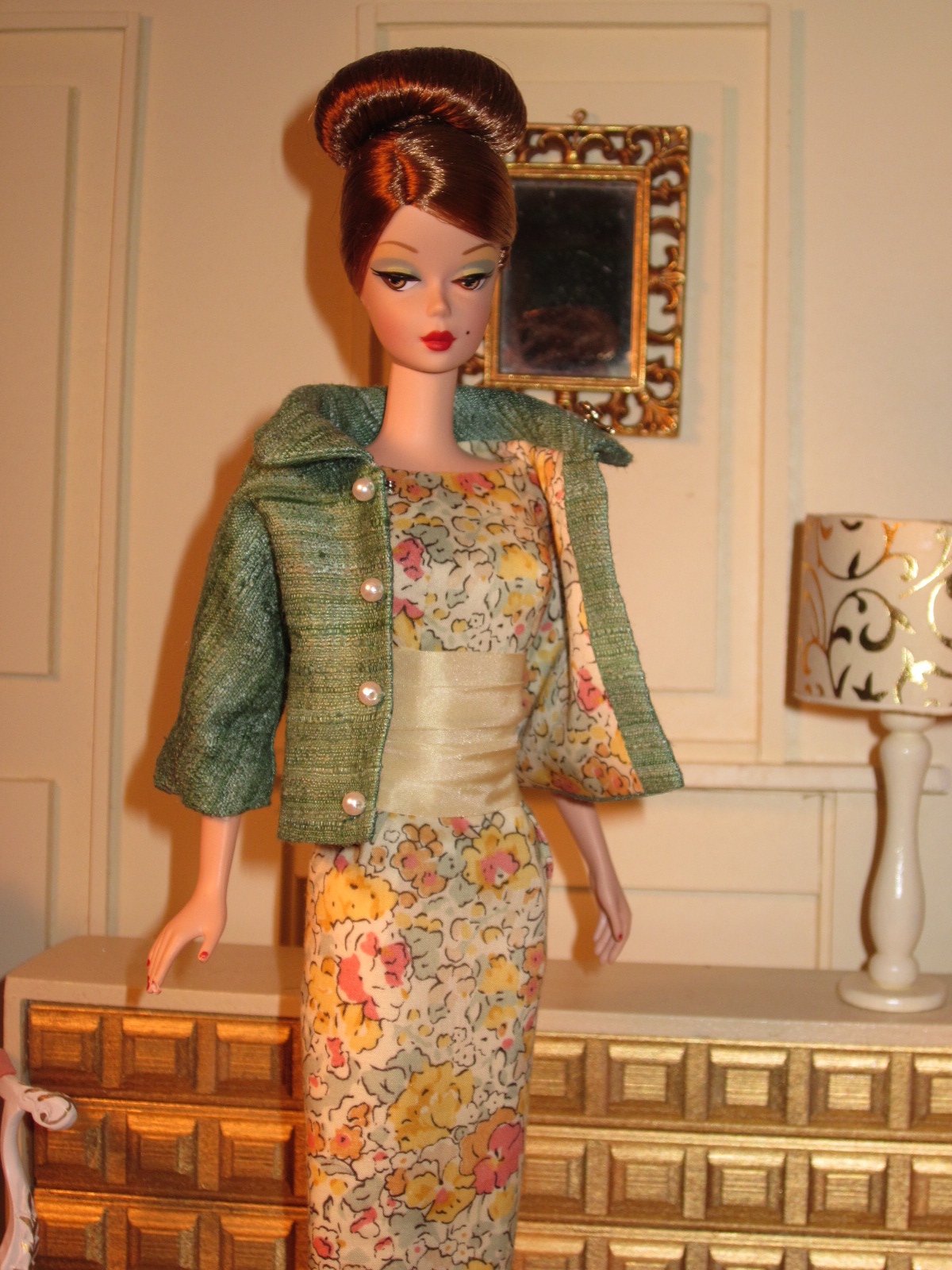 This ensemble is modeled on a Silkstone, but will fit most 12″ dolls.  There is only one of these fashions. I will not be taking orders.