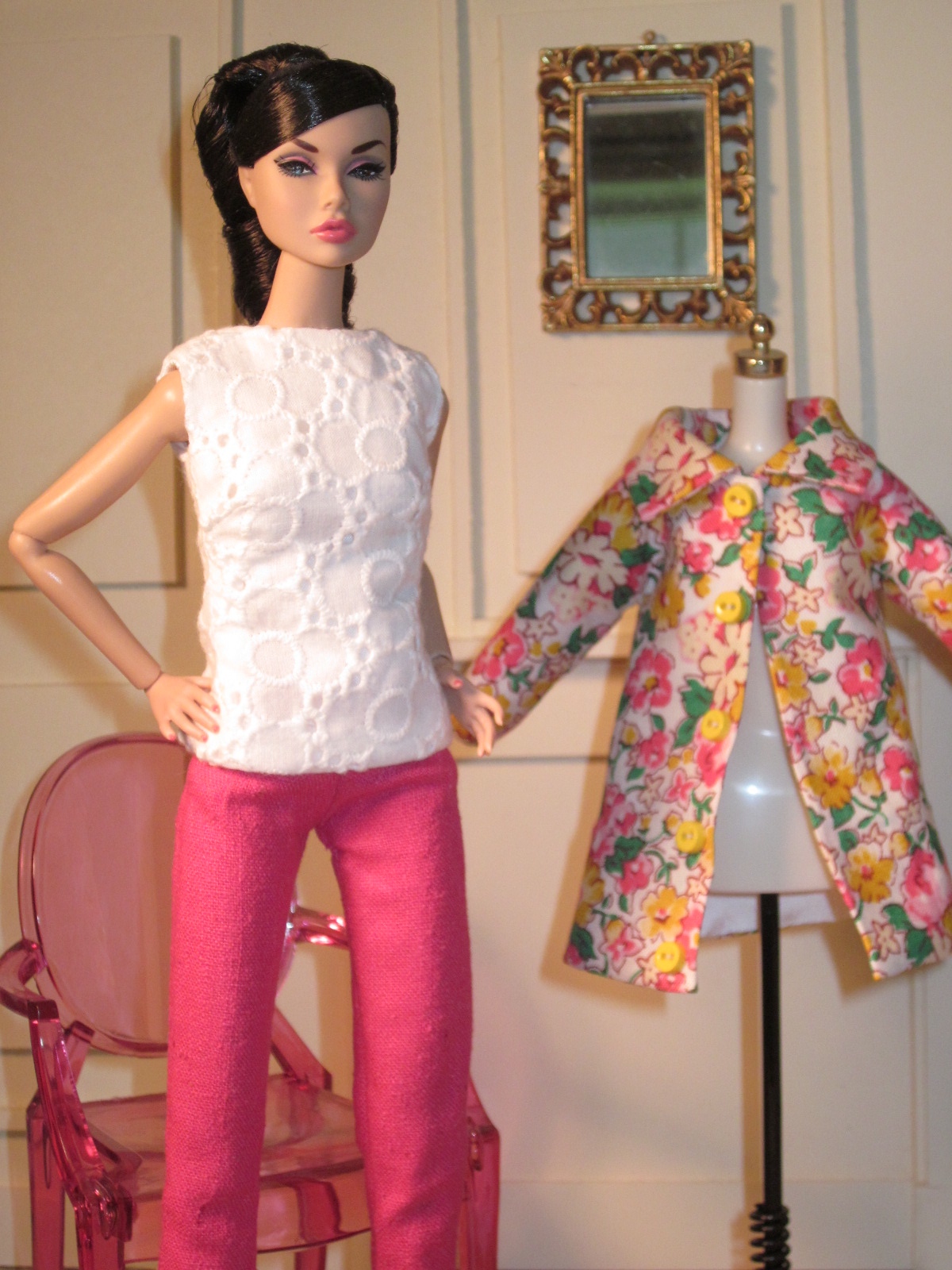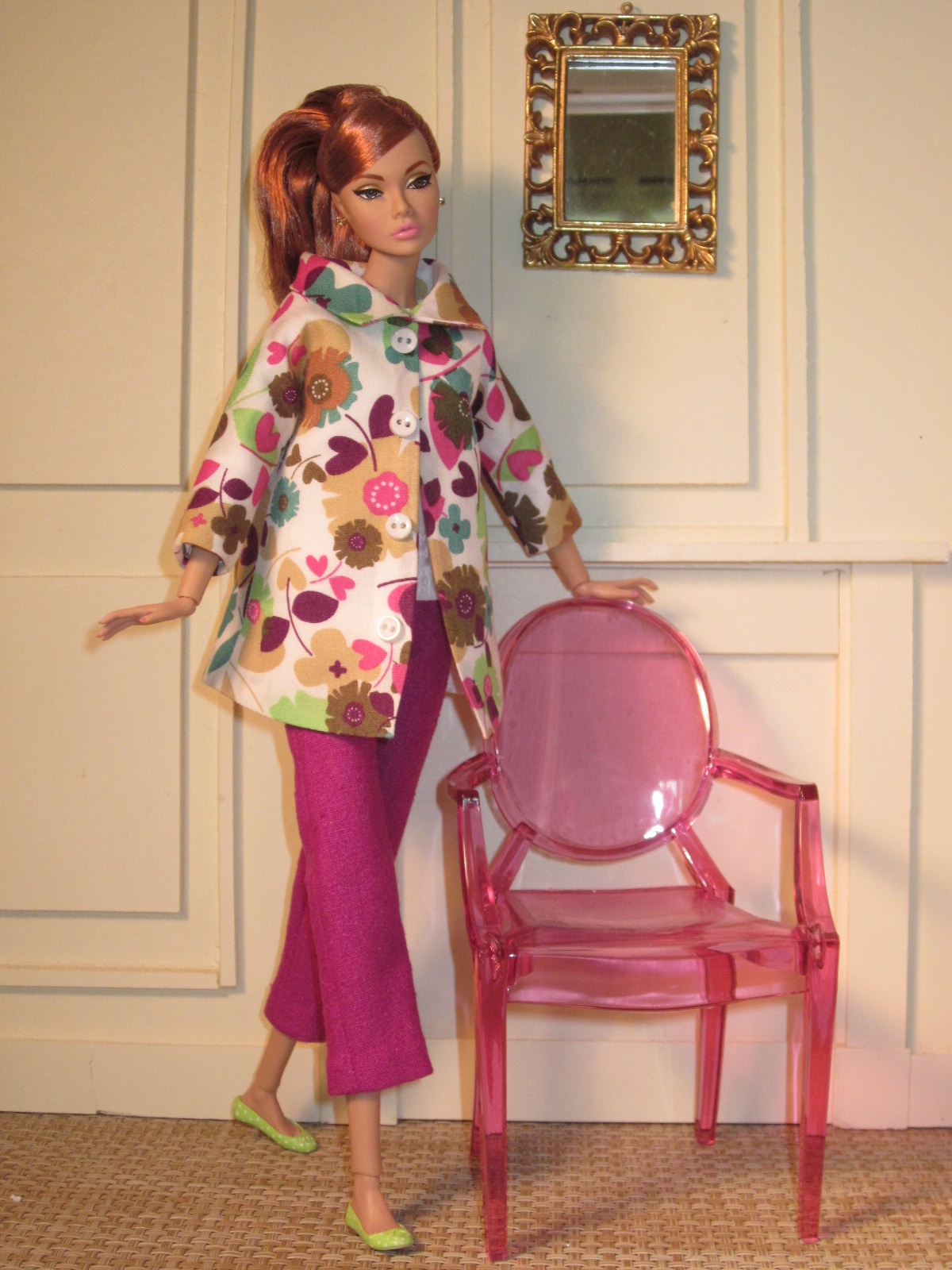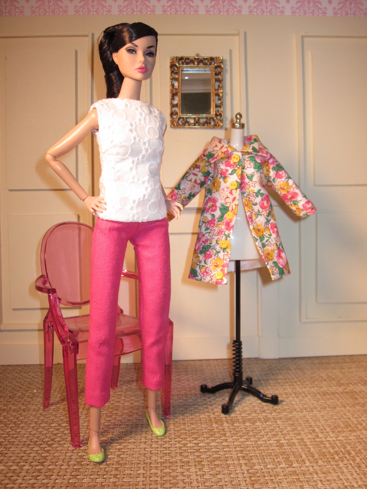 Miss Poppy Parker models a vibrant outfit for Spring.  The swing coat is a brightly colored cotton floral with bright yellow, pink and green.  Bright yellow buttons decorate the coat, which is fully lined in white silk.  Underneath the coat, Poppy wears a shell top in white cotton eyelet, and bright pink silk noil Capri pants.