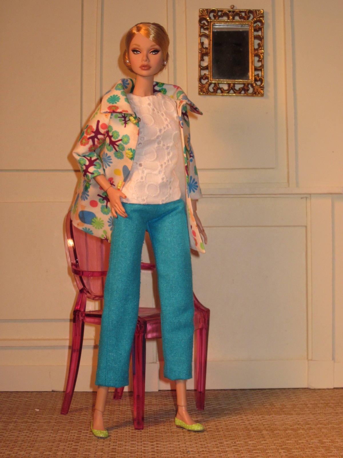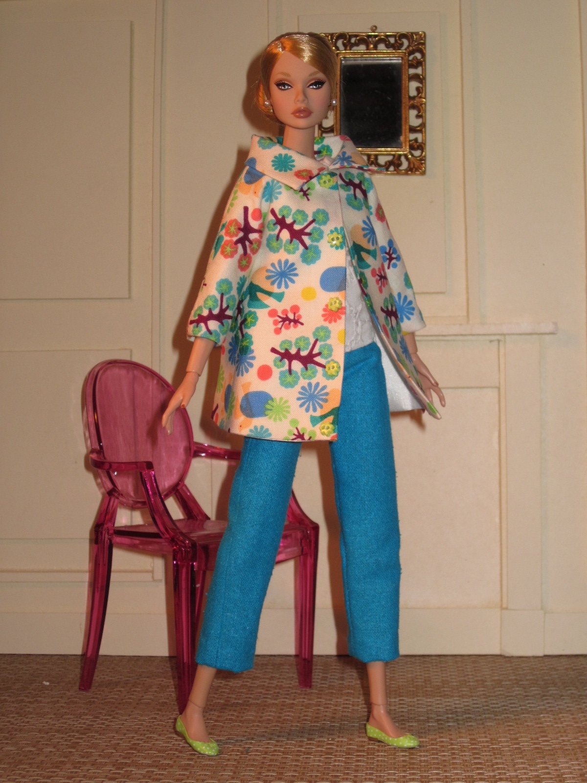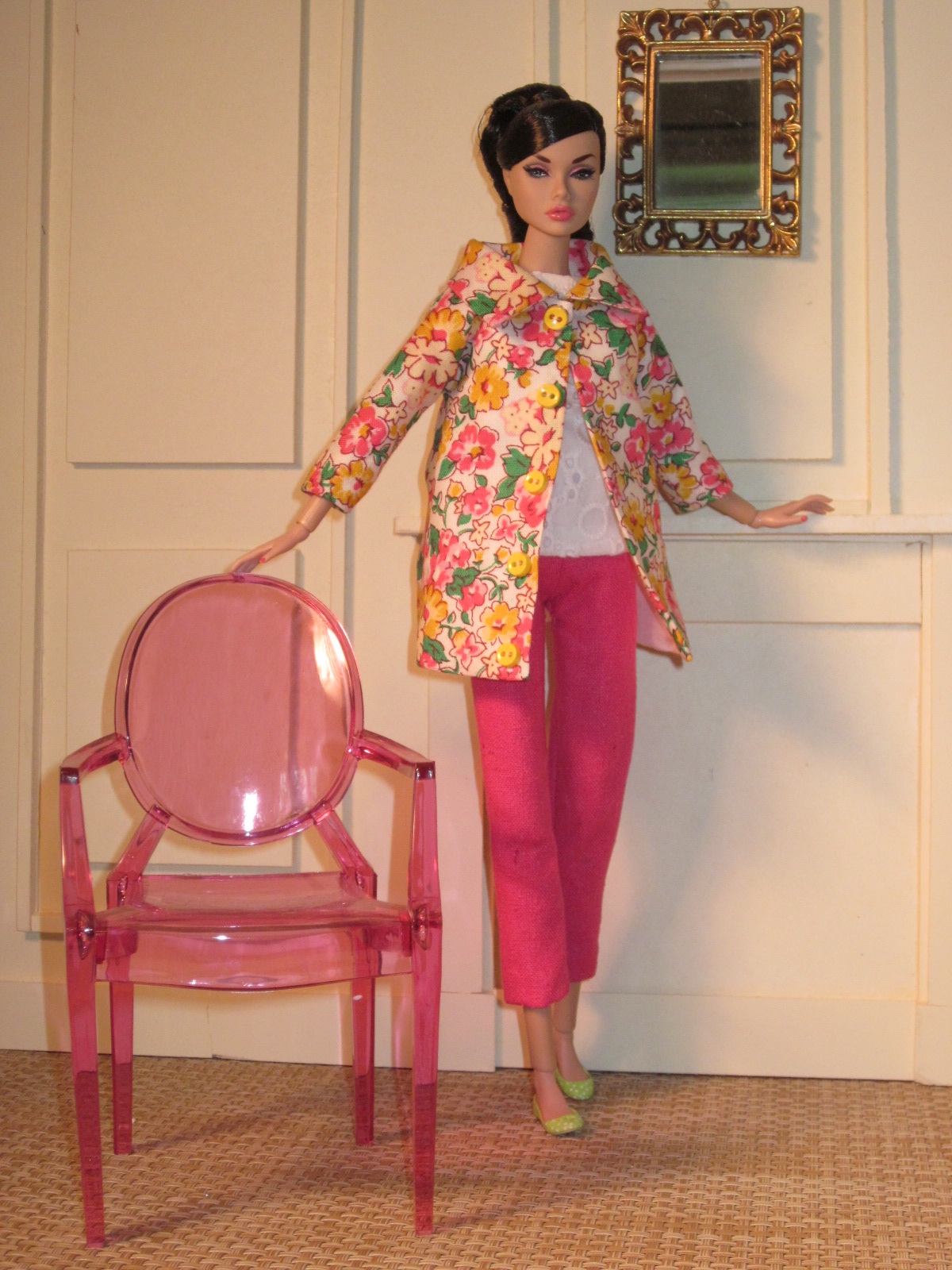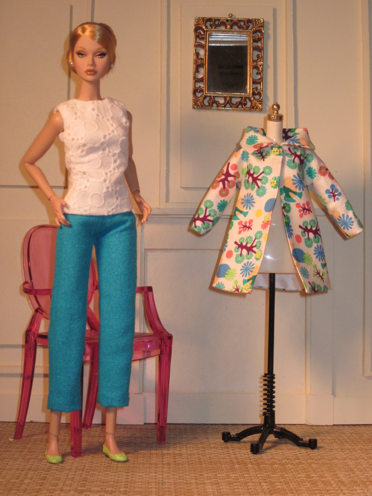 Miss Poppy Parker models a vibrant outfit for Spring.  The swing coat is a brightly colored cotton floral with bright yellow, pink and green.  Bright yellow buttons decorate the coat, which is fully lined in white silk.  Underneath the coat, Poppy wears a shell top in white cotton eyelet, and bright pink silk noil Capri pants.