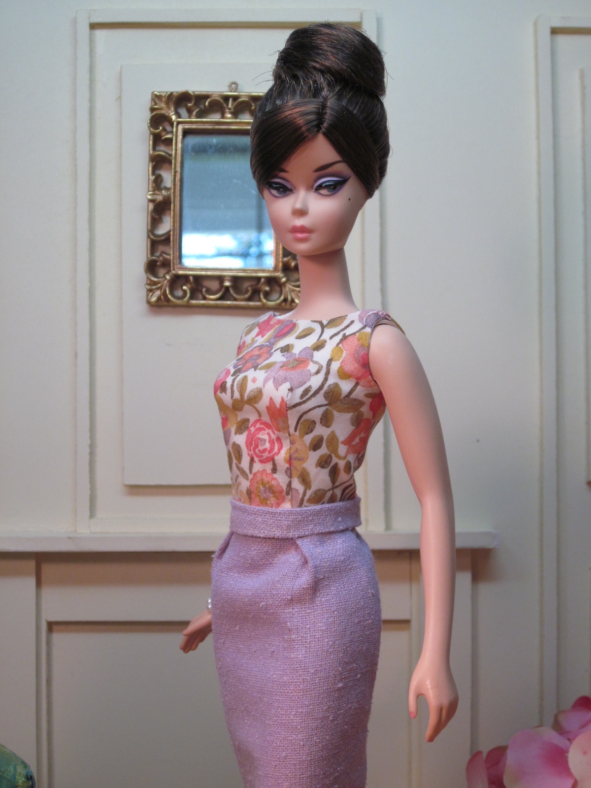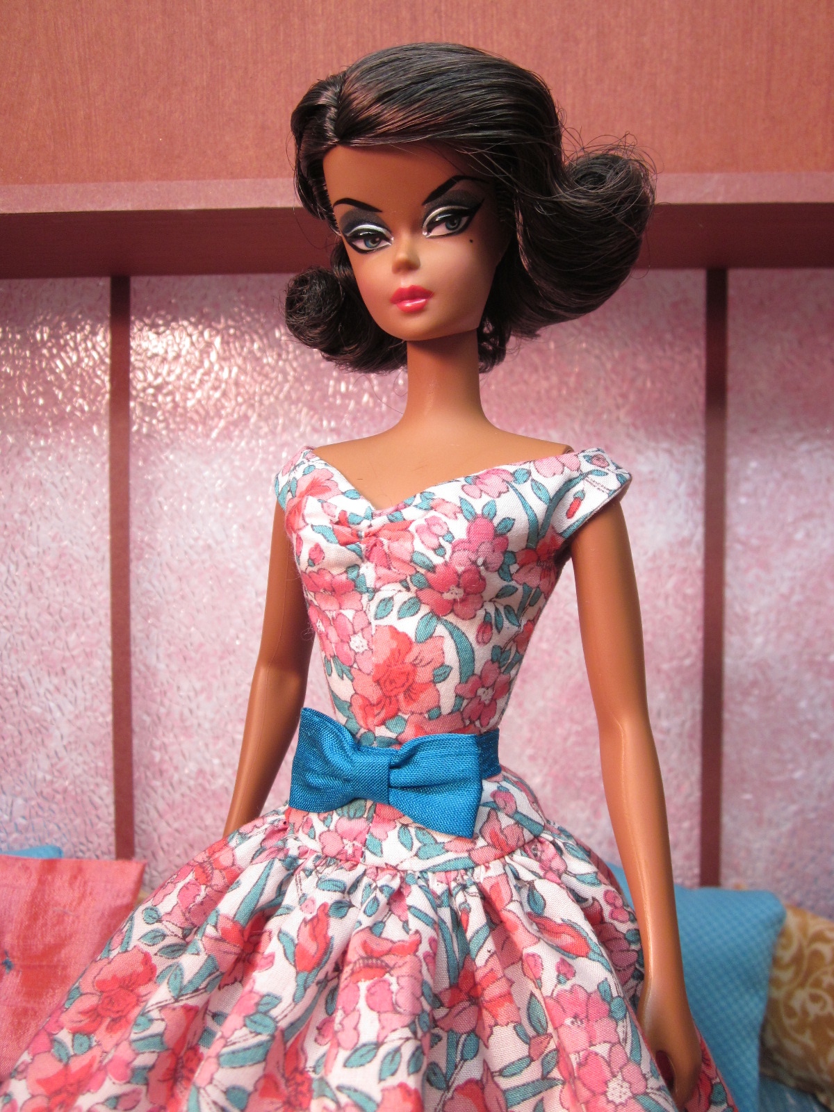 I only de-boxed the stunning Evening Gown Silkstone yesterday, so she got to model a new dress today. An elegant, dropped waist dress in this striking Liberty of London floral in shades of coral and turquoise blue perfectly matches her coloring. The dress is off the shoulder with a ruched decolletage. The skirt is made full with vivid coral tulle. A brilliant turquoise silk bow belt accents the waist.
