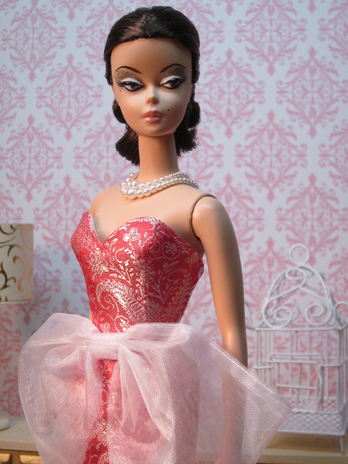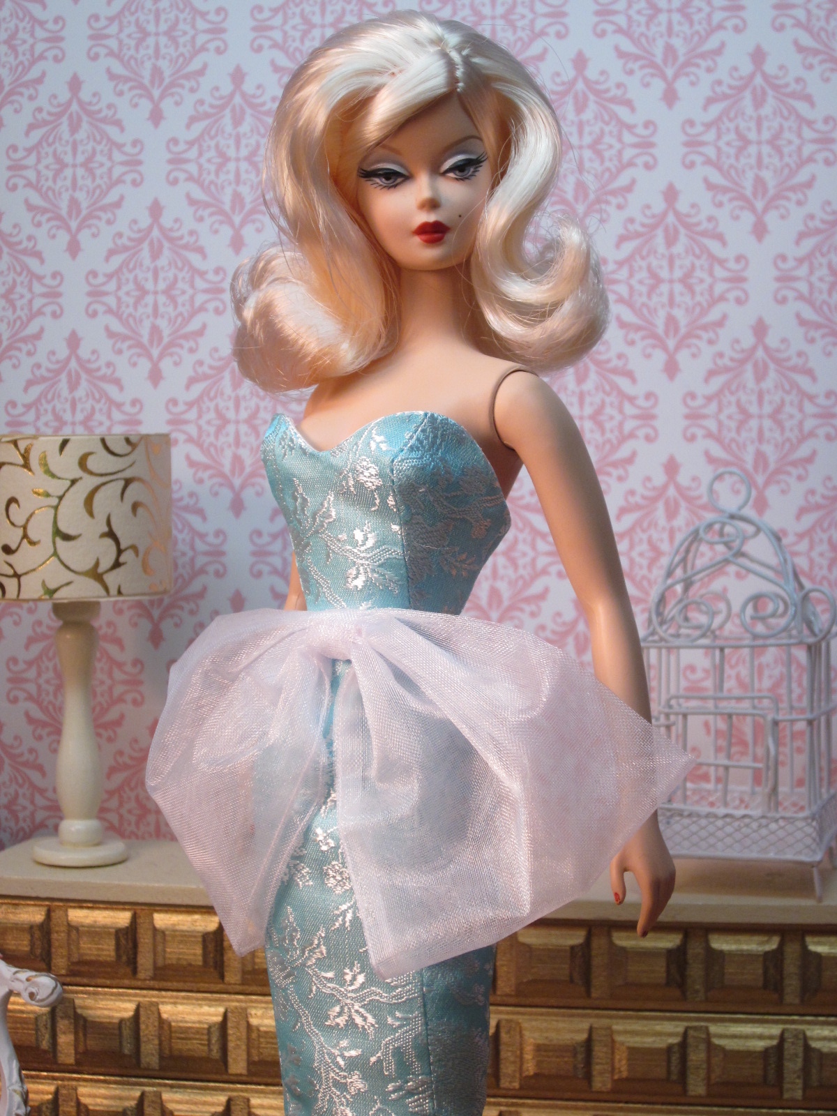 Strapless silk brocade cocktail dresses in Tiffany Blue and Raspberry Pink.  Each color is woven with white, giving a beautiful shimmer to the fabric.  A dramatic white organza bow decorates the front of the dress.