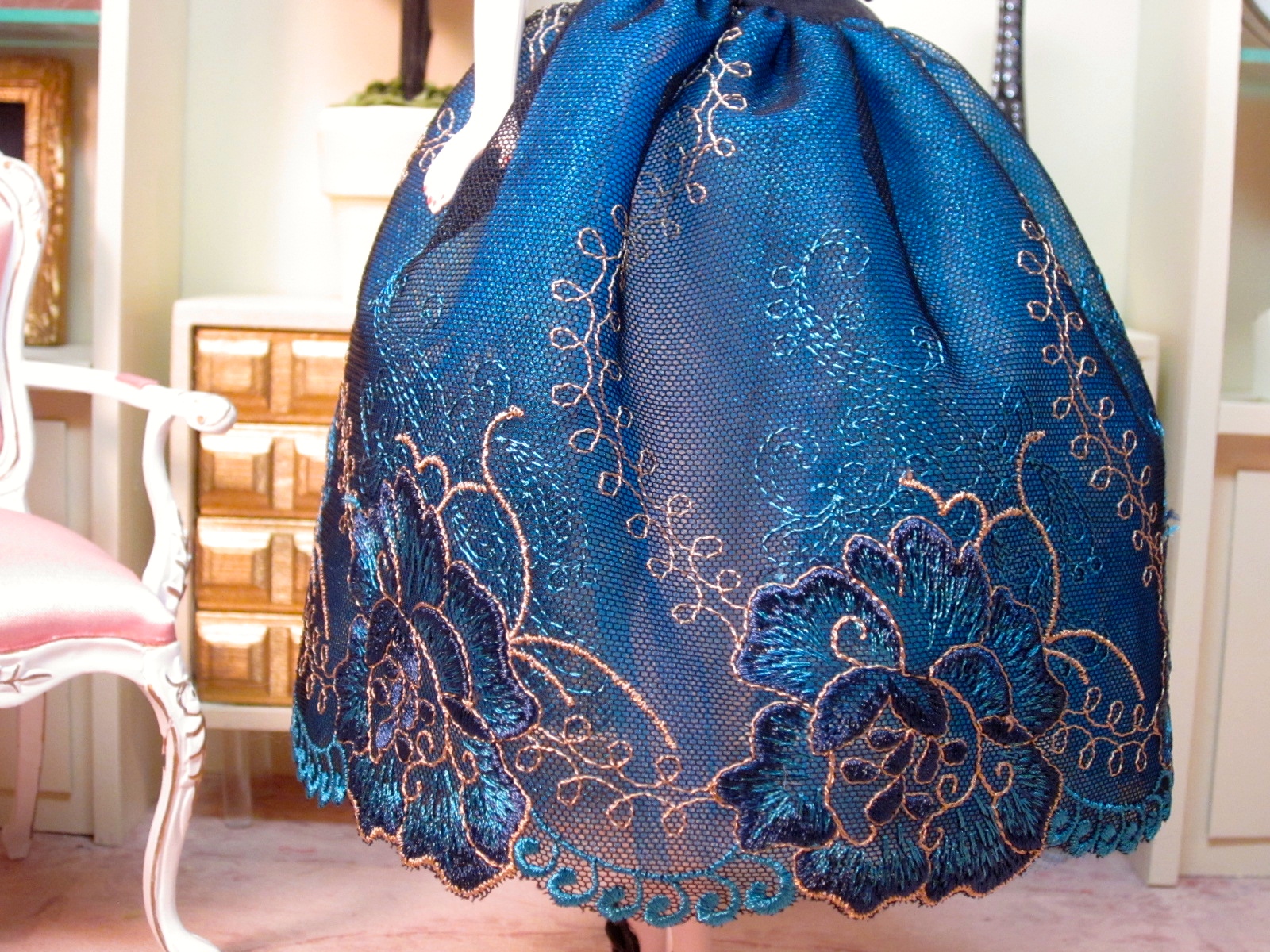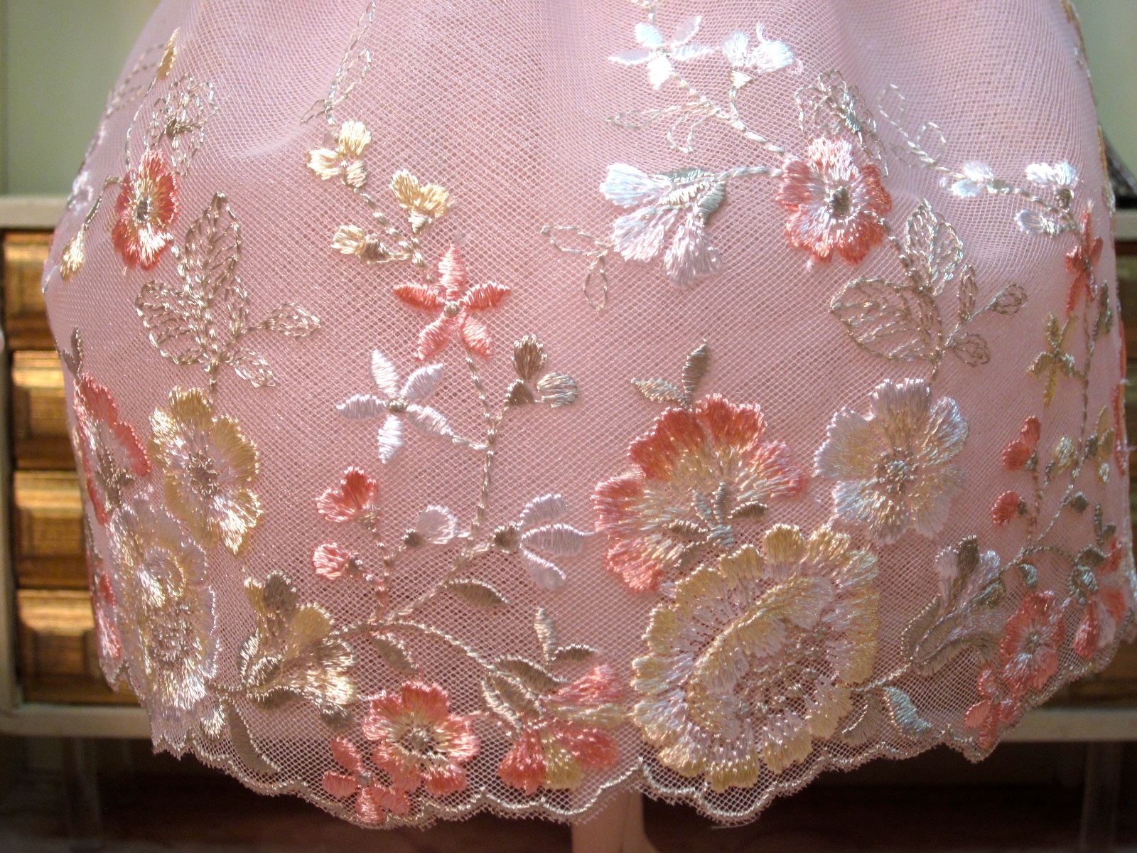 One of my favorite color combinations is pink and navy, so this lace is one of the prettiest I have seen. The dropped waist, strapless bodice is made from pale pink silk taffeta. The full skirt is navy blue tulle embroidered with pale pink and rose flowers, with pale green leaves. Layers of pale pink shimmer tulle give fullness to the skirt. A piece of lace matching the skirt embellishes the bodice with a pink silk band and bow under the bust.