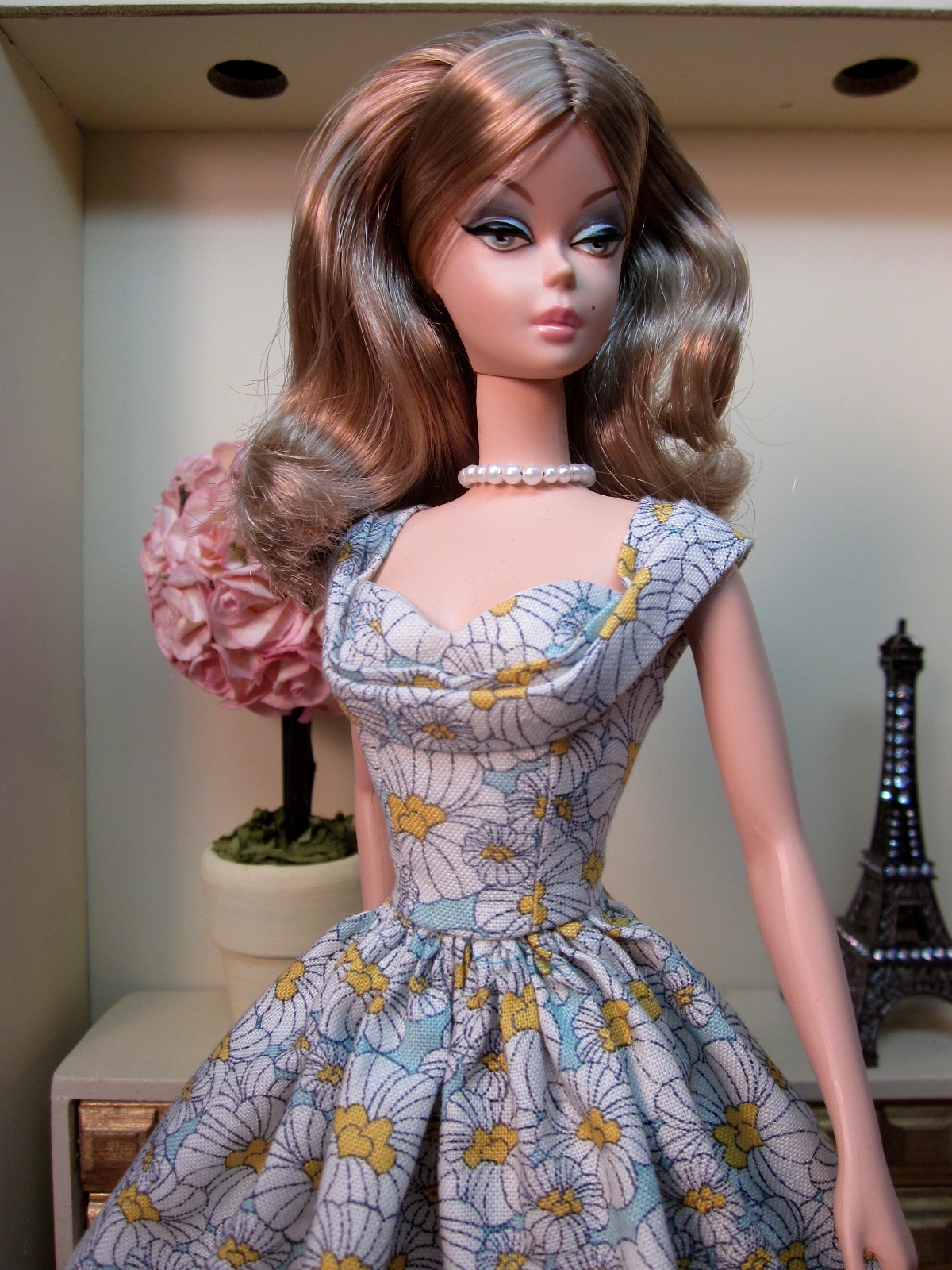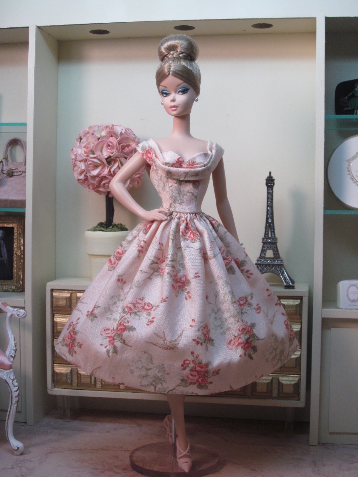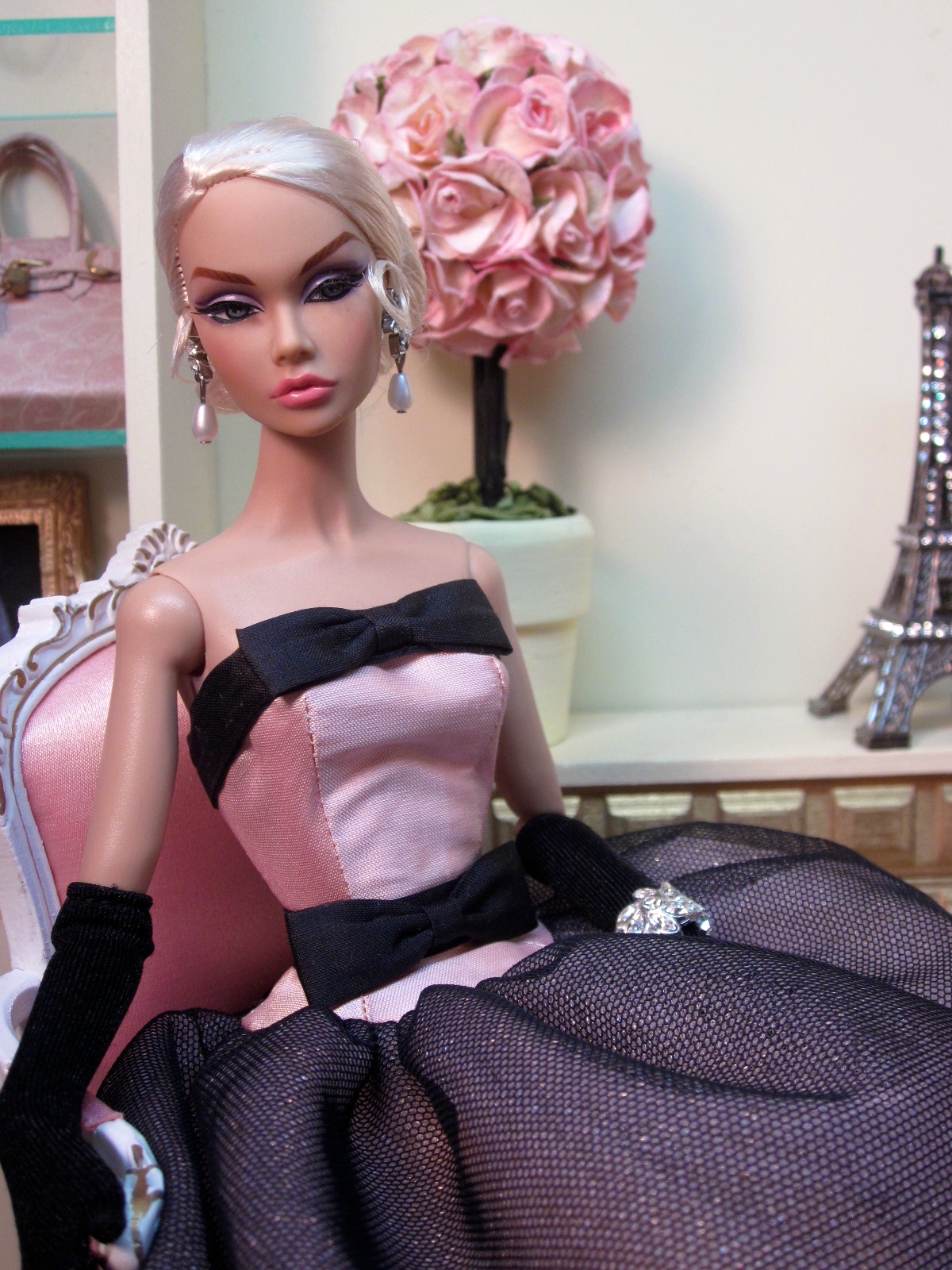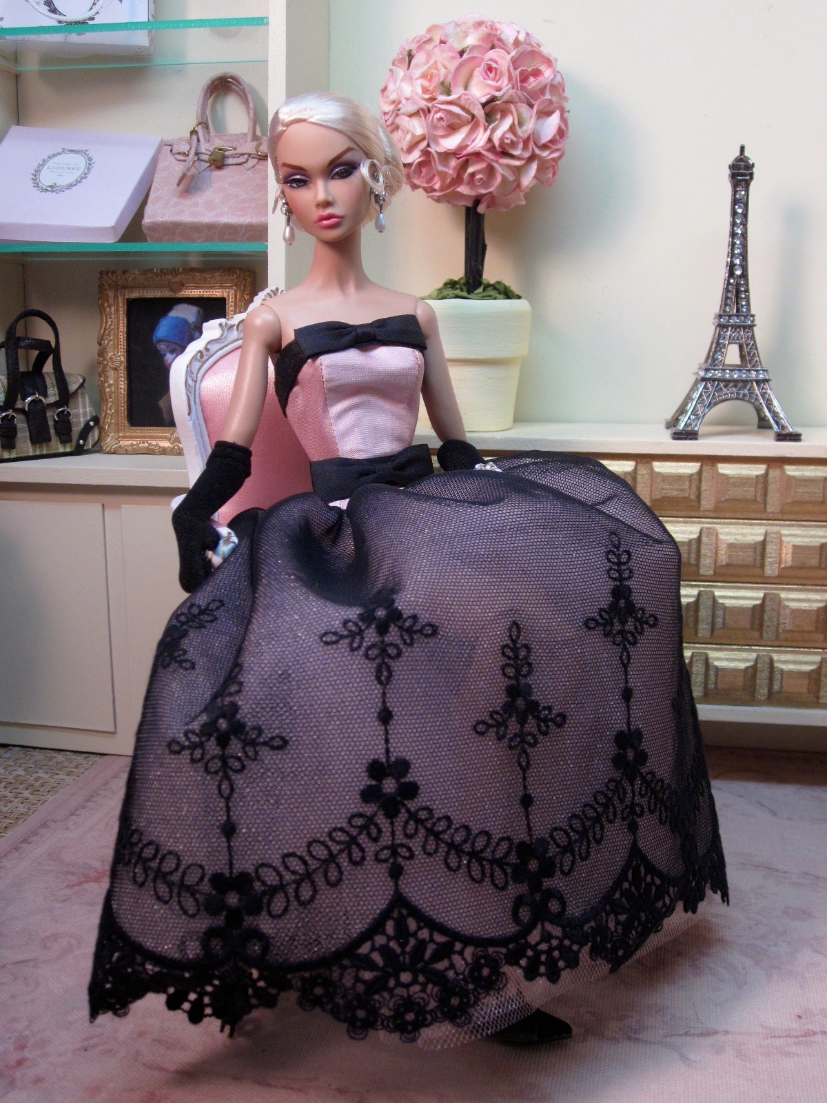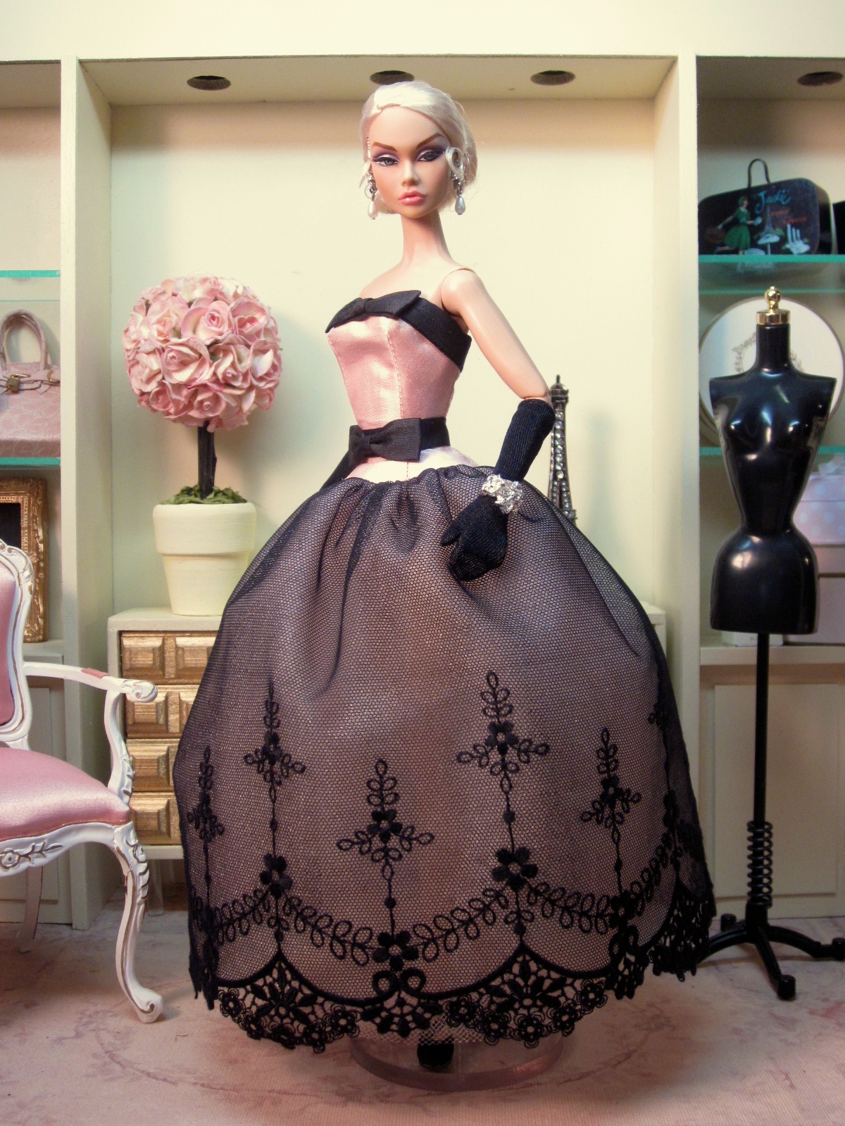 This darling set includes the Millinery Shop with light up capability and built-in vanity, as well as TEN custom-made hats ! Other accoutrements include 2 clear hat boxes (also custom-made), 5 hat mannequins , floral bouquet in gold filigree vase and ghost chair. Tending your needs for millinery is one of our “Mannequin Mavens” ! (Our own line of One Of A Kind Silkstone Beauties, dressed by Hilda and reimagined hair/paint by Maryann).