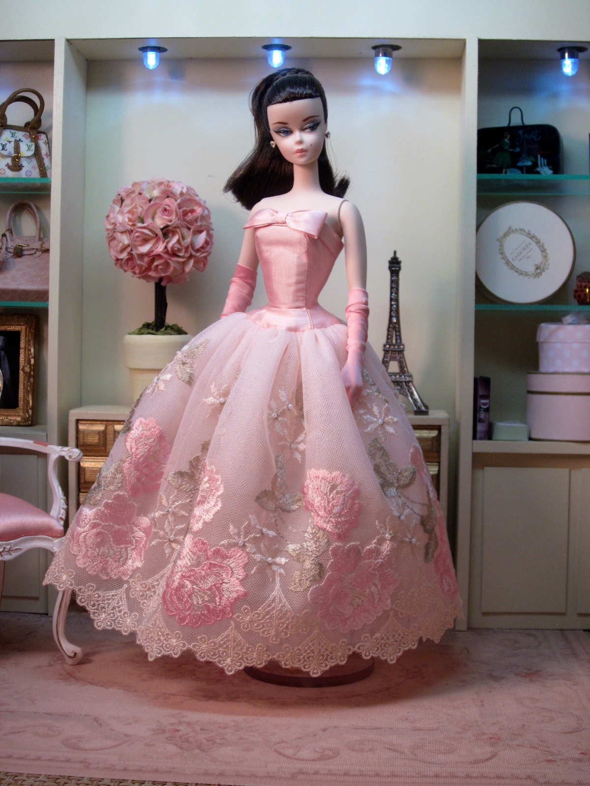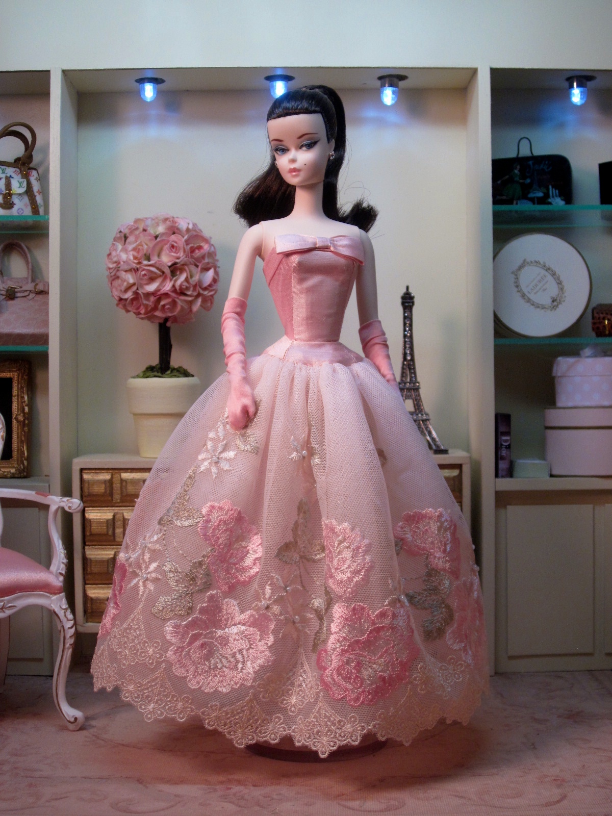 Blush Beauty had to wait patiently for me to create her debut gown, but she is in the spotlight at last. She models a tea length gown in shades of pale pink, rose, soft green, and pearl. The strapless, dropped waist bodice is made from pale pink silk, with a band and bow detail at the top. The ethereal skirt is cream tulle embroidered with large pink roses, pale green leaves, and tiny cream daisies. The center of each daisy has a hand beaded pearl. Eight layers of pale pink and shimmering pearl tulle give dramatic fullness to the skirt.
