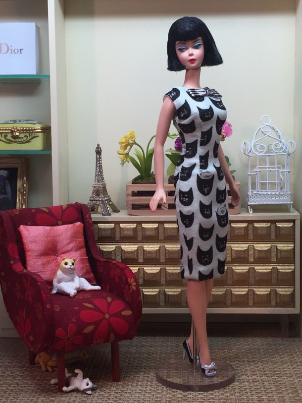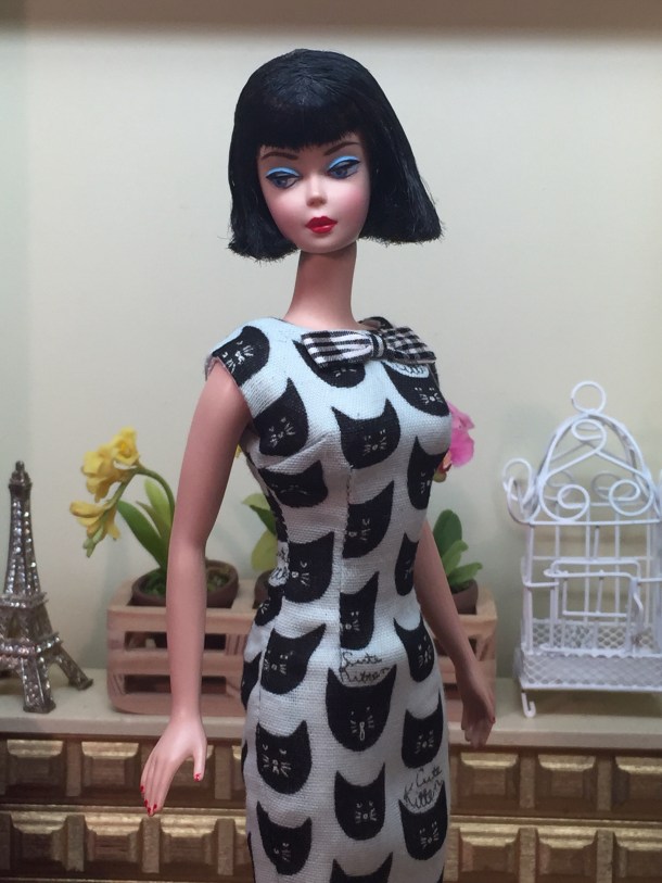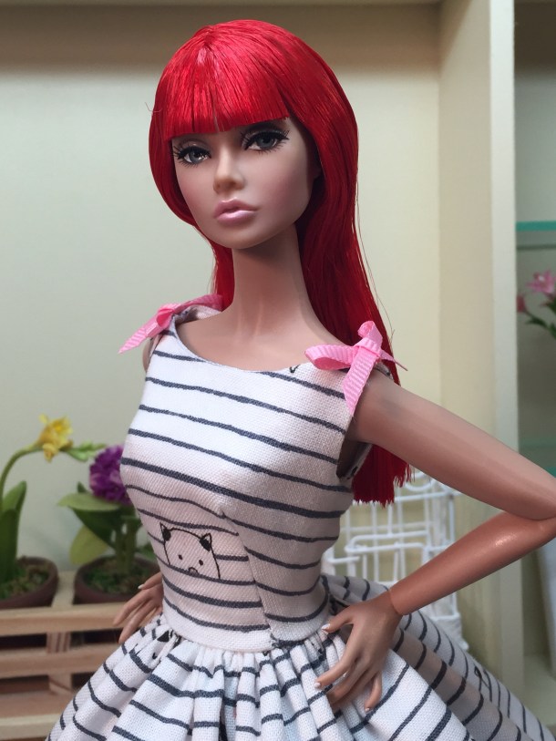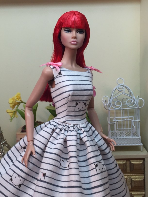 A gown worthy of a Valentine’s dance, this pale pink confection is the perfect addition to your fashion doll’s wardrobe. The strapless bodice is made from pale pink silk and has a peplum silhouette that flows into the voluminous lace skirt. This, made from pale pink embroidered tulle, has tiny bows embroidered above the scalloped hem. Eight layers of palest pink shimmer tulle makes up the underskirt. A pale pink silk band stretches under the bust and is decorated with bow.