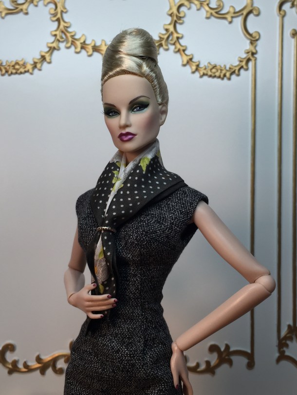 A beautiful Dior silk scarf from Inside the Fashion Doll Studio is the perfect accessory for this classic grey tweed sheath dress. The scarf includes a silver scarf ring and insignia box for storage. The sheath is made from tweed cotton and is fully lined in black silk.