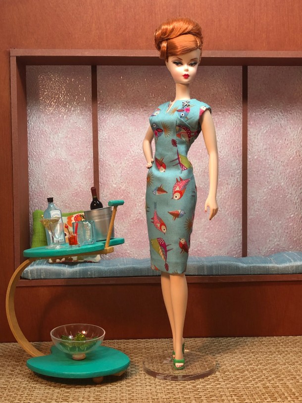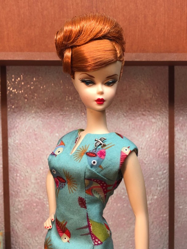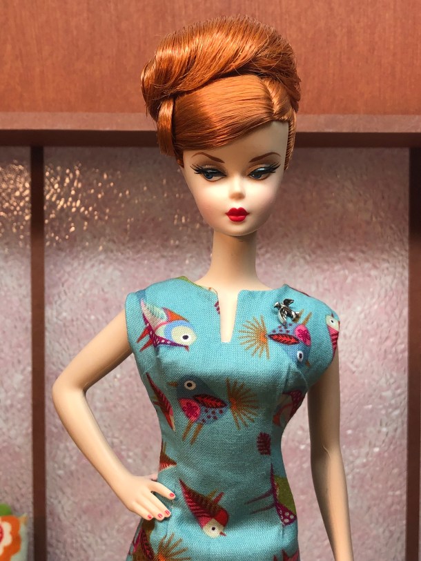 A charming and whimsical print in a retro aesthetic depicting colorful birds on a turquoise ground. The knee length sheath is form fitting and feature a stylish split neckline. A silver bird brooch decorates the lapel.