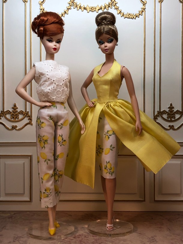 A mix and match set of pants, pencil skirt, hostess dress, and eyelet shell. The lemon fabric, created by Rebecca Berry, is a lightweight cotton lawn and makes up the pants and skirt. The shell top is white flowered eyelet. The hostess dress is made from a beautiful silk cotton blend and has a lovely crisp hand. It features a halter neckline and split skirt.