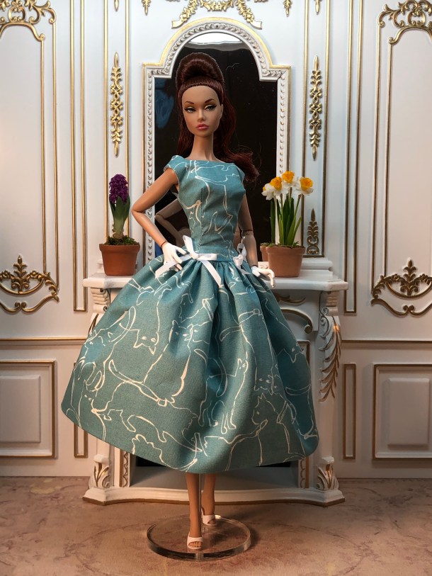 A print that appears at first abstract, upon closer examination proves to be line drawings of cats in white on a duck egg blue ground. The bodice has a broad neckline and dropped waist, decorated with white silk bows. The full skirt is given added volume from layers of white tulle.