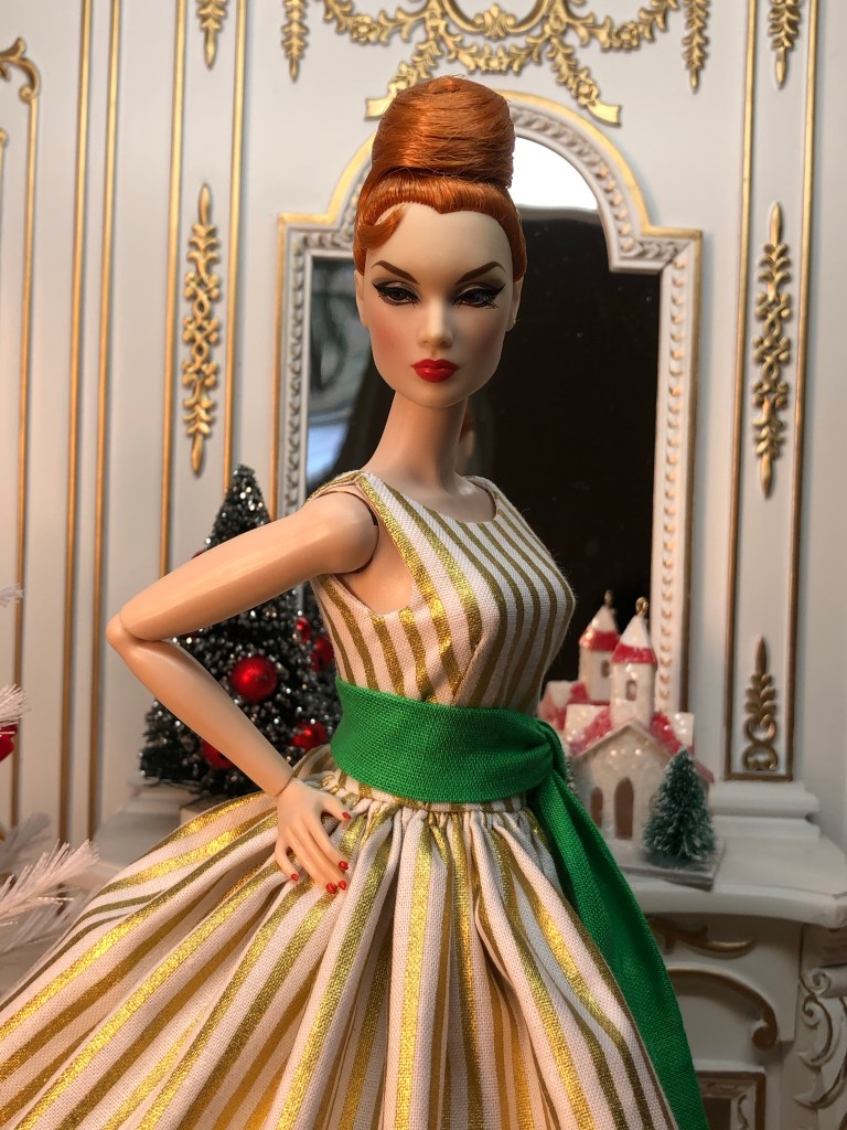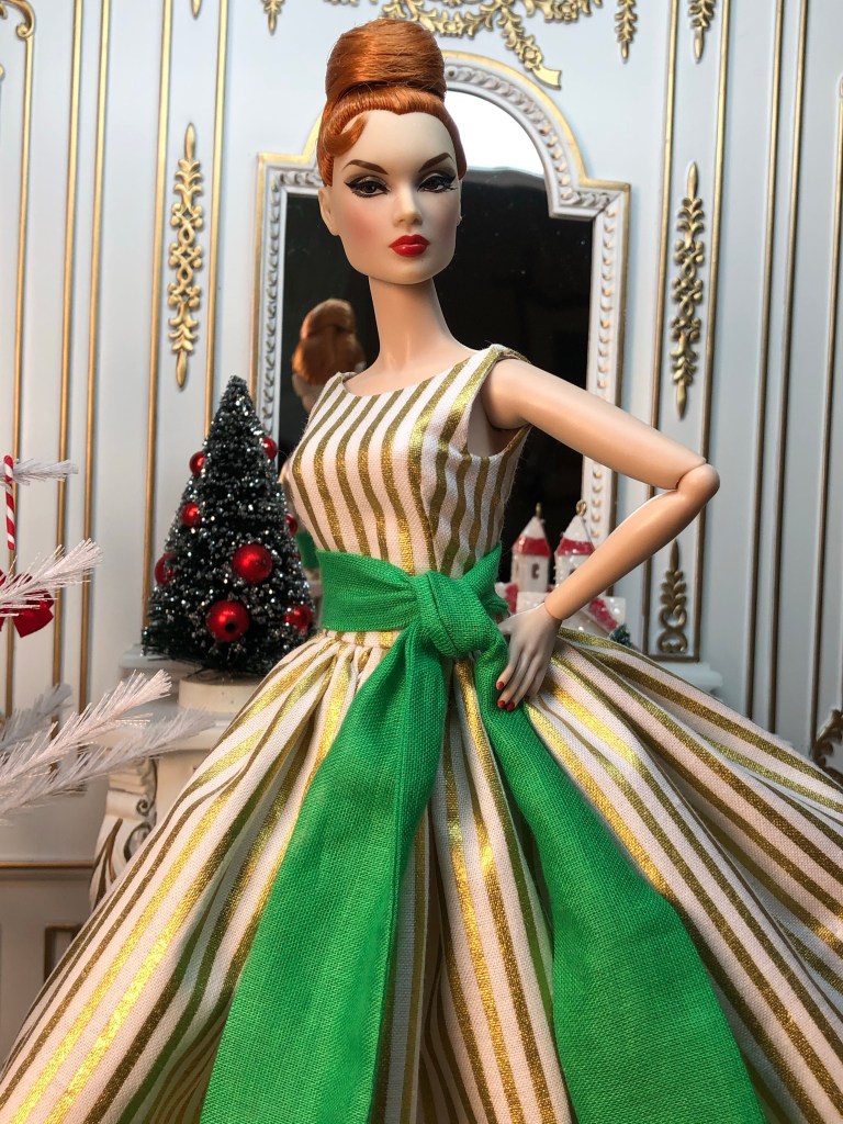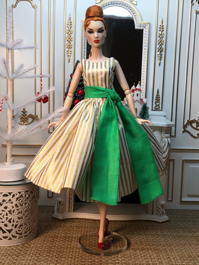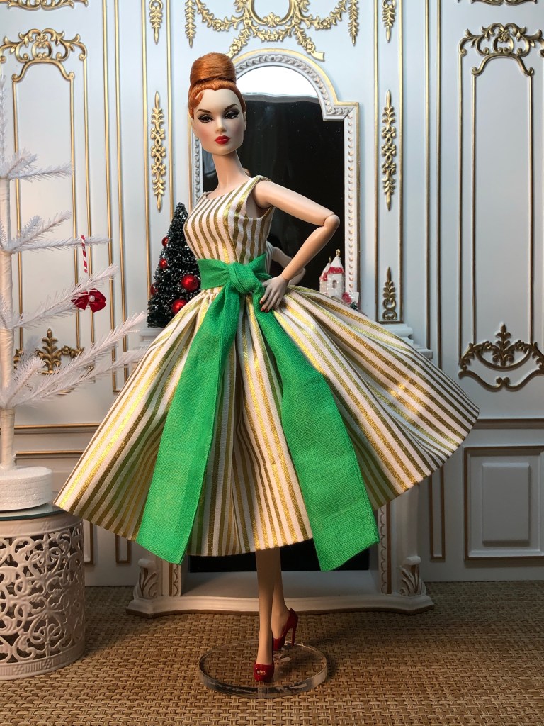In a flirty party dress in shiny gold stripes, Victoire looks like a beautiful holiday present. The waist is highlighted by a Kelly green cotton gauze scarf that ties to one side. Layers of gold tulle give volume to the extra full skirt.