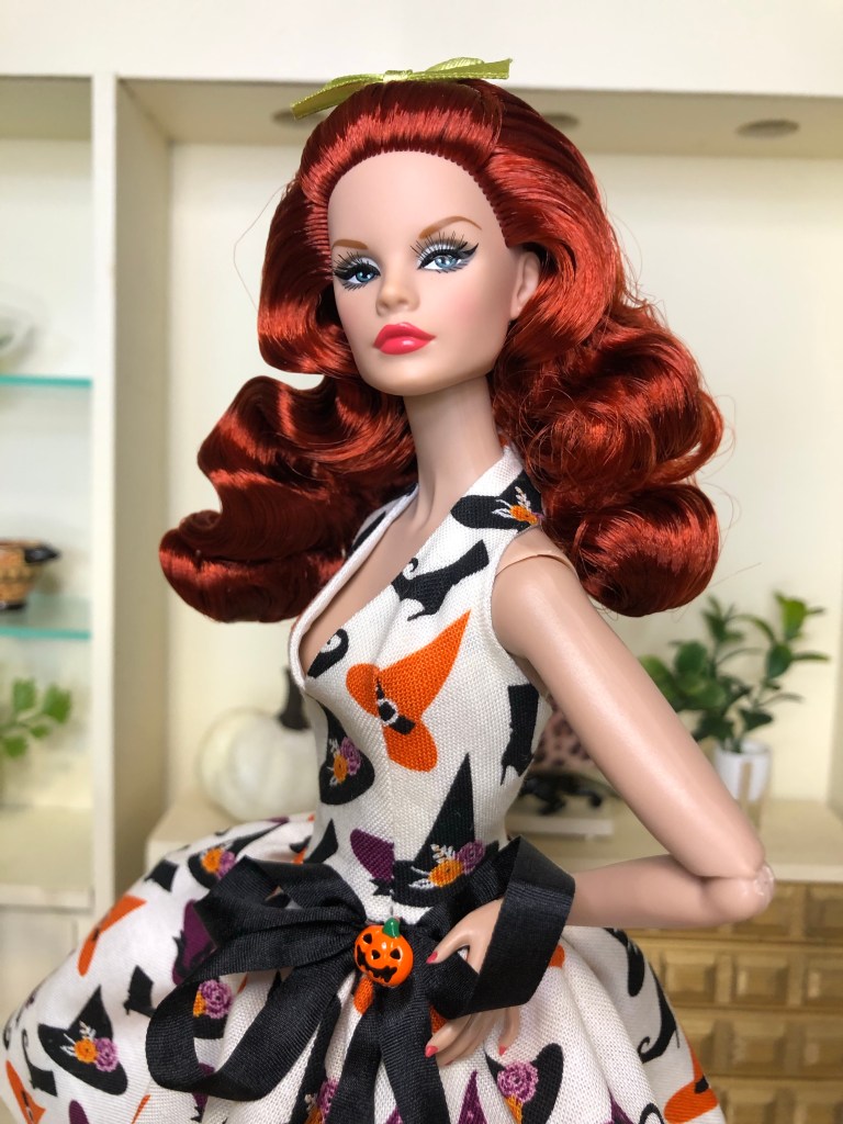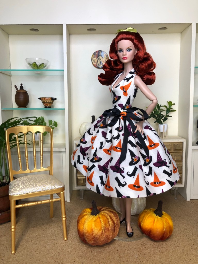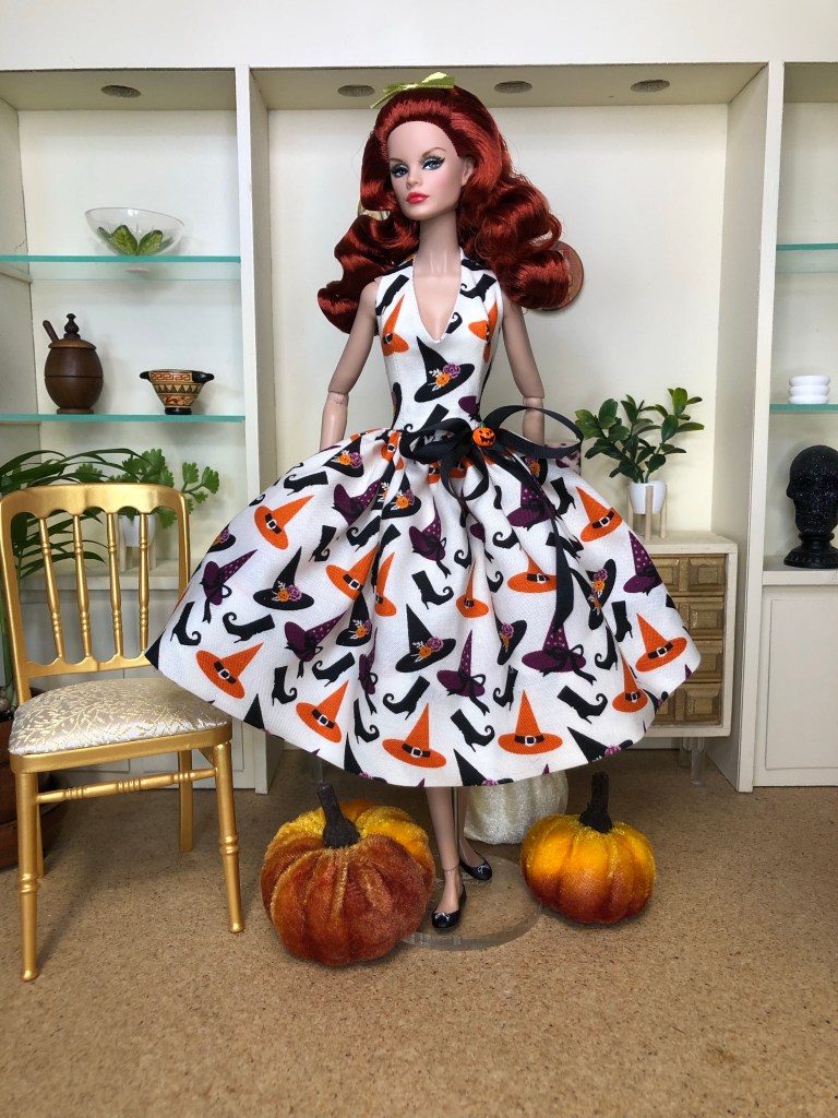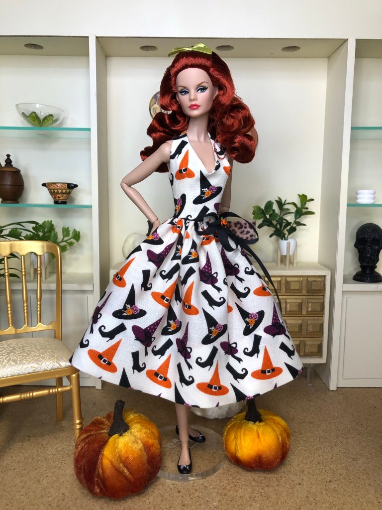 A charming print featuring a stylish witch’s accessories, including flower bedecked hats and pointed boots. The style is a halter with a full skirt, given added volume from layers of orange shimmer tulle. Black silk ribbons decorated with an orange enamel pumpkin trim the waistline.