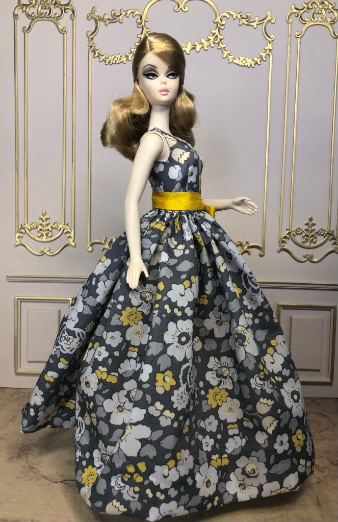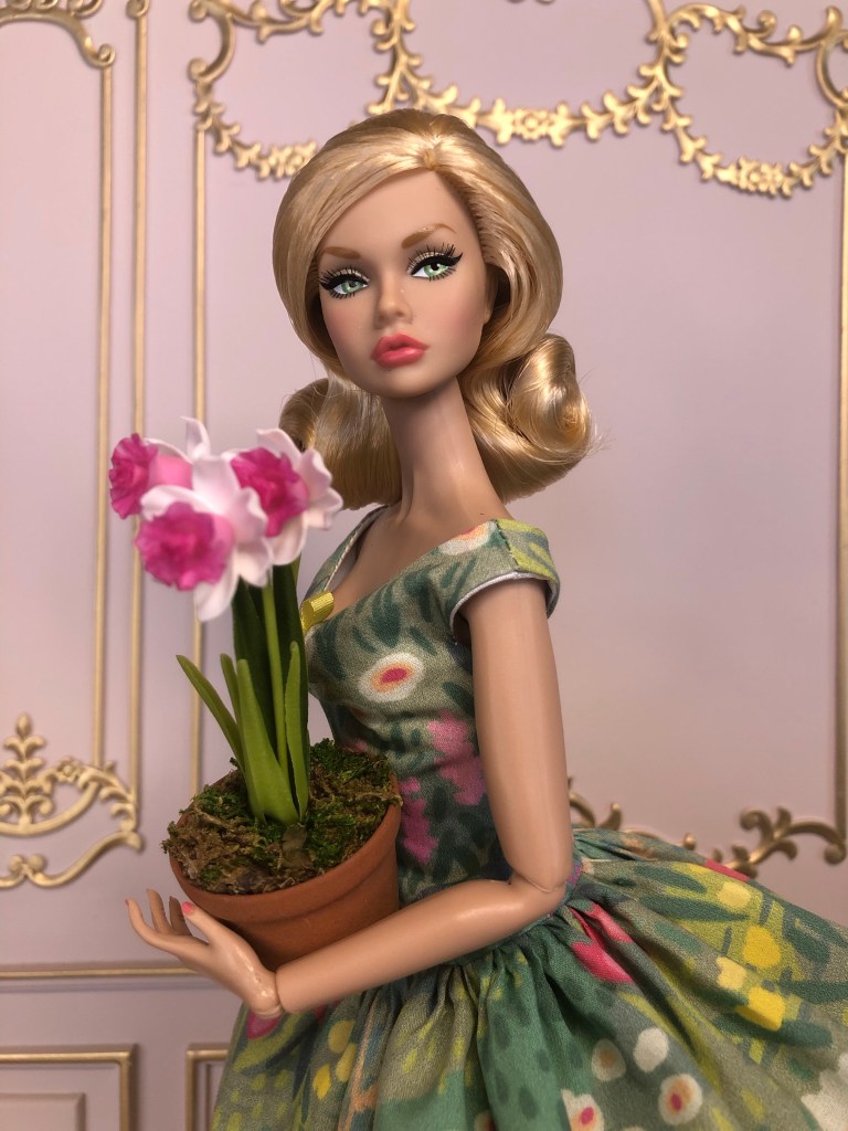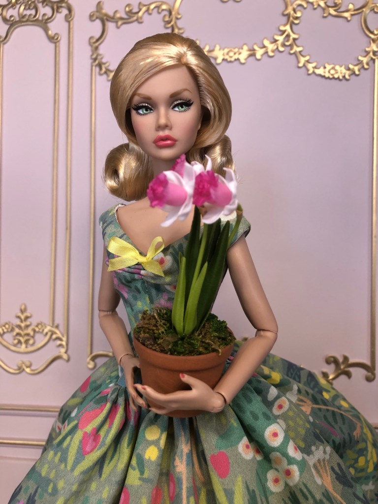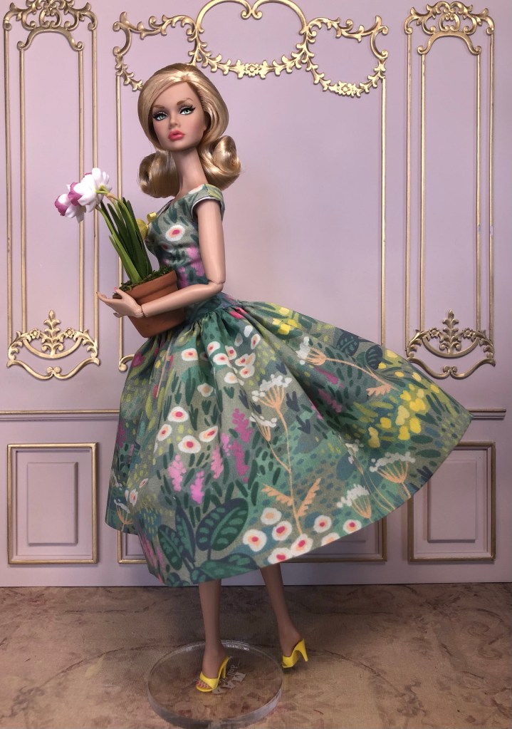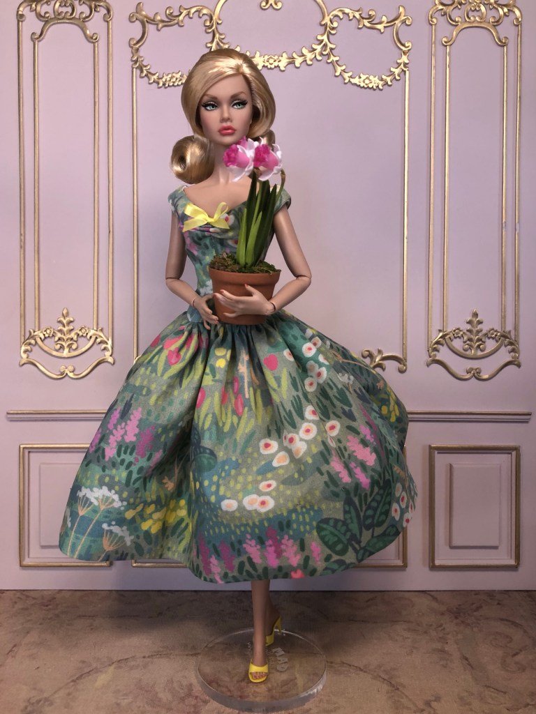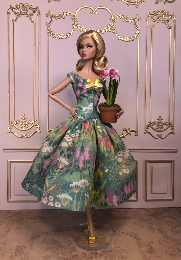 We just got a foot of snow here in Maine, so I’m ready for Spring, which has me reaching for the fresh, colorful fabrics in my collection. This fabric is like a painting that has gotten wet; the colors are hazy and soft like a spring meadow in the rain. The bodice has an off the shoulder silhouette and ruched bust. The full skirt is given additional volume from layers of spring green tulle. A sunny yellow silk bow decorates the bust. Included is a beautifully detailed pot of delicate daffodils.