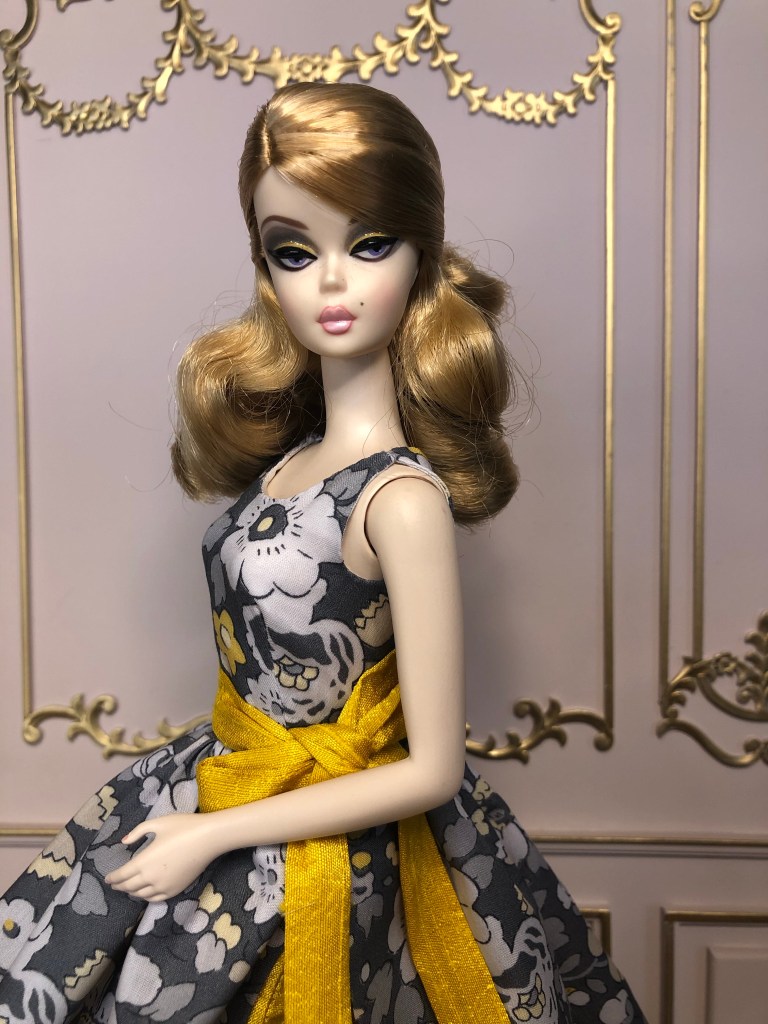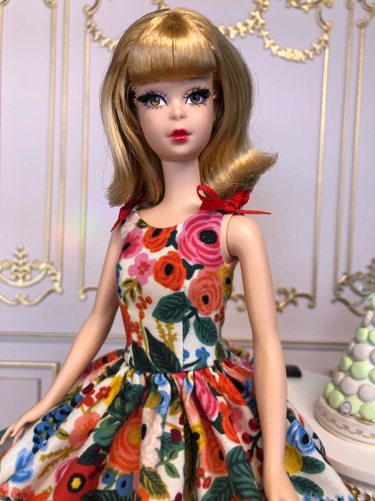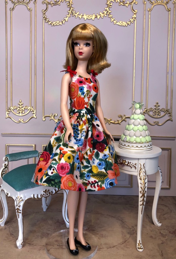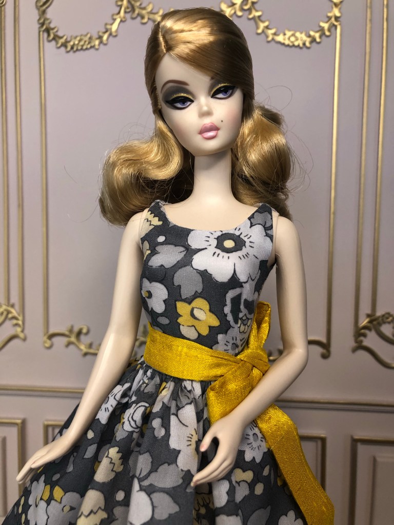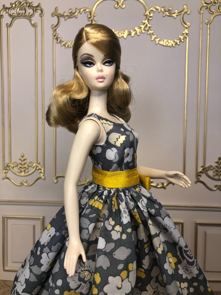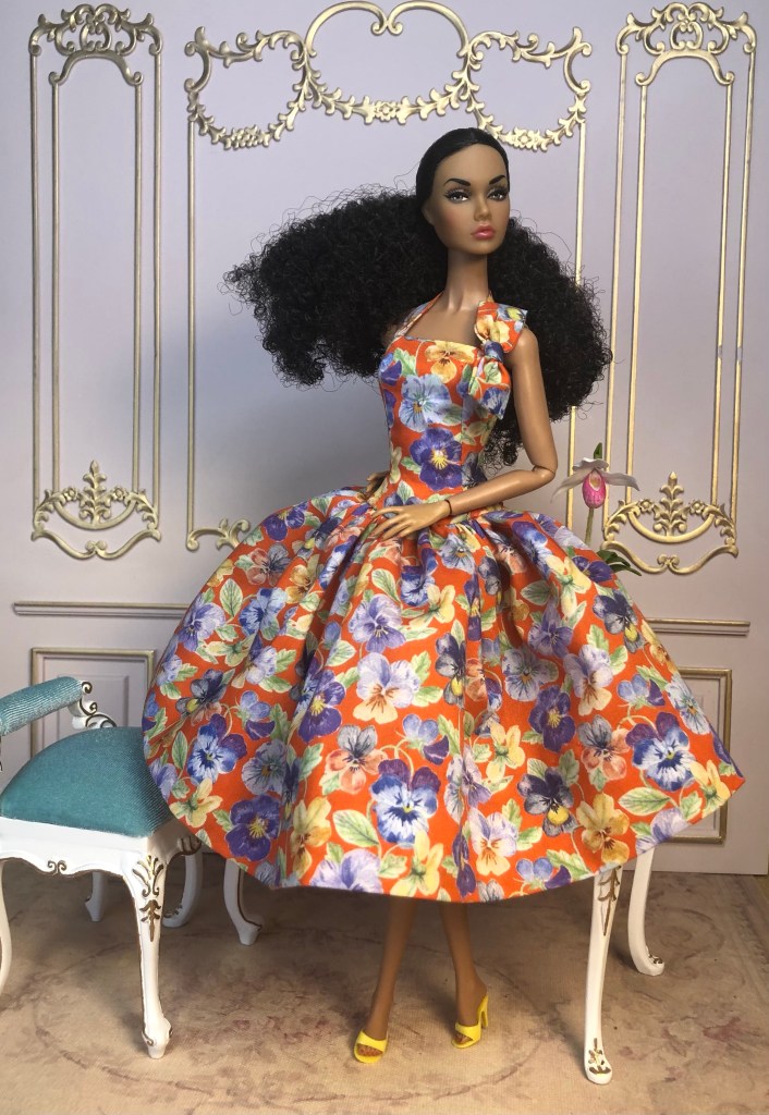 We just got a foot of snow here in Maine, so I’m ready for Spring, which has me reaching for the fresh, colorful fabrics in my collection. This fabric is like a painting that has gotten wet; the colors are hazy and soft like a spring meadow in the rain. The bodice has an off the shoulder silhouette and ruched bust. The full skirt is given additional volume from layers of spring green tulle. A sunny yellow silk bow decorates the bust. Included is a beautifully detailed pot of delicate daffodils.