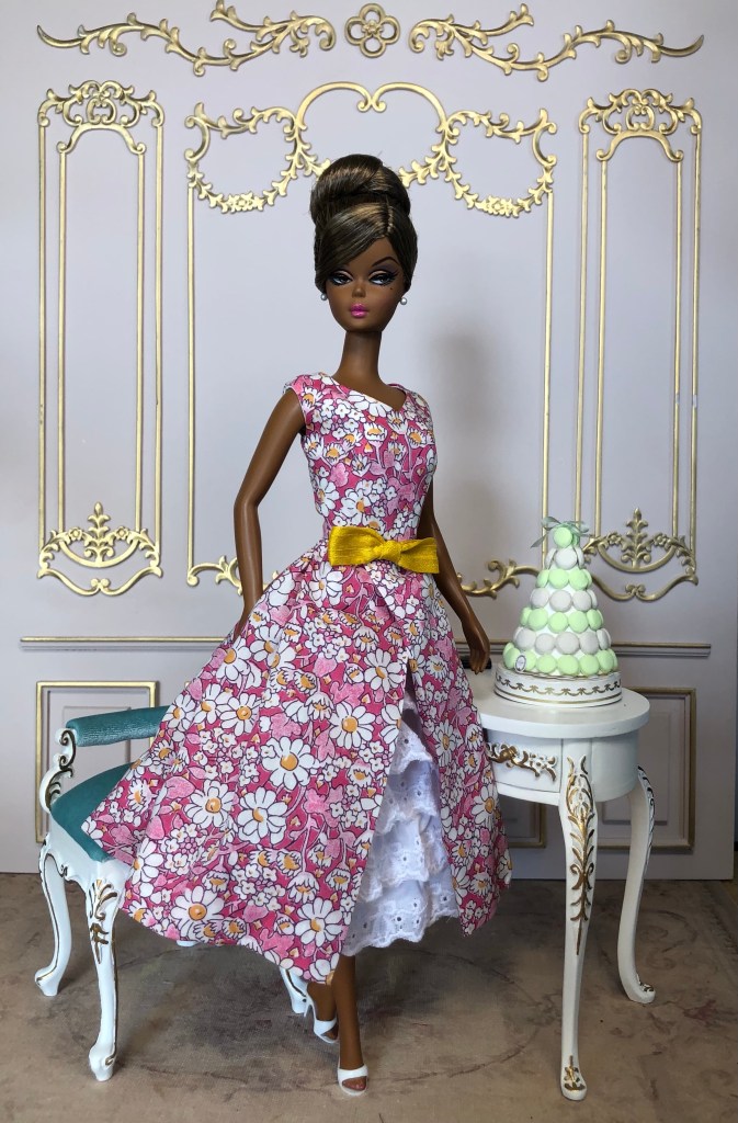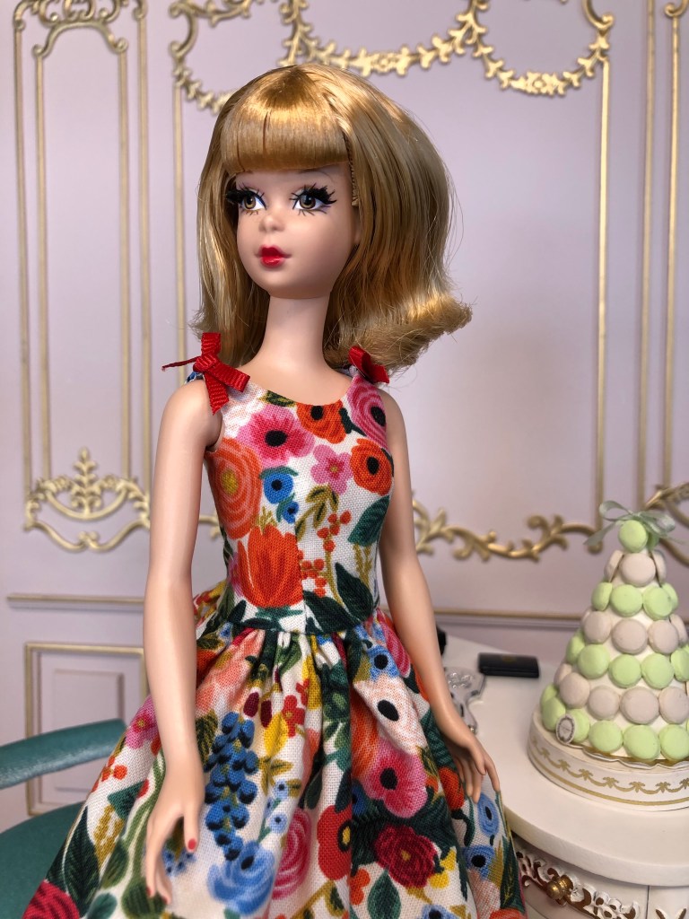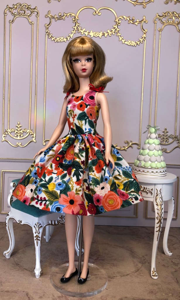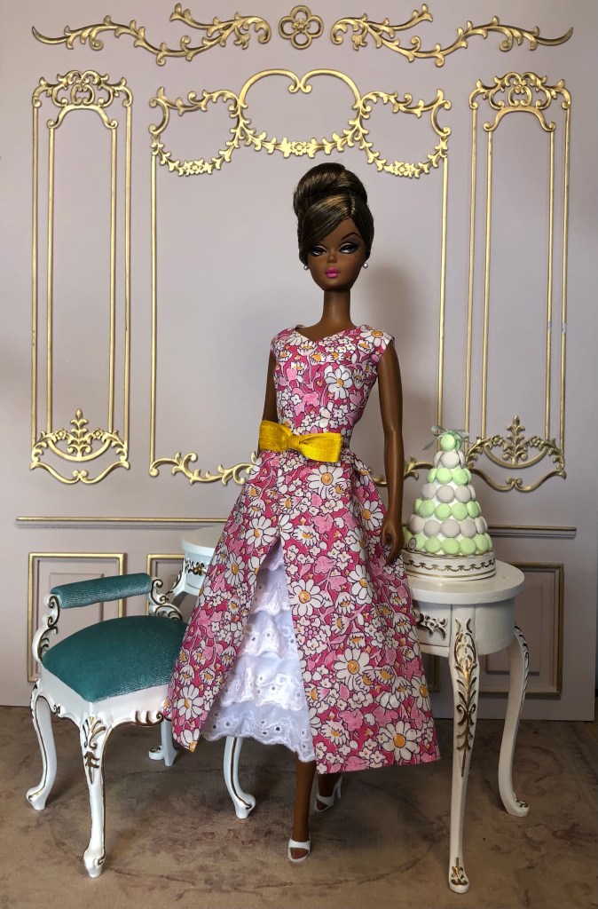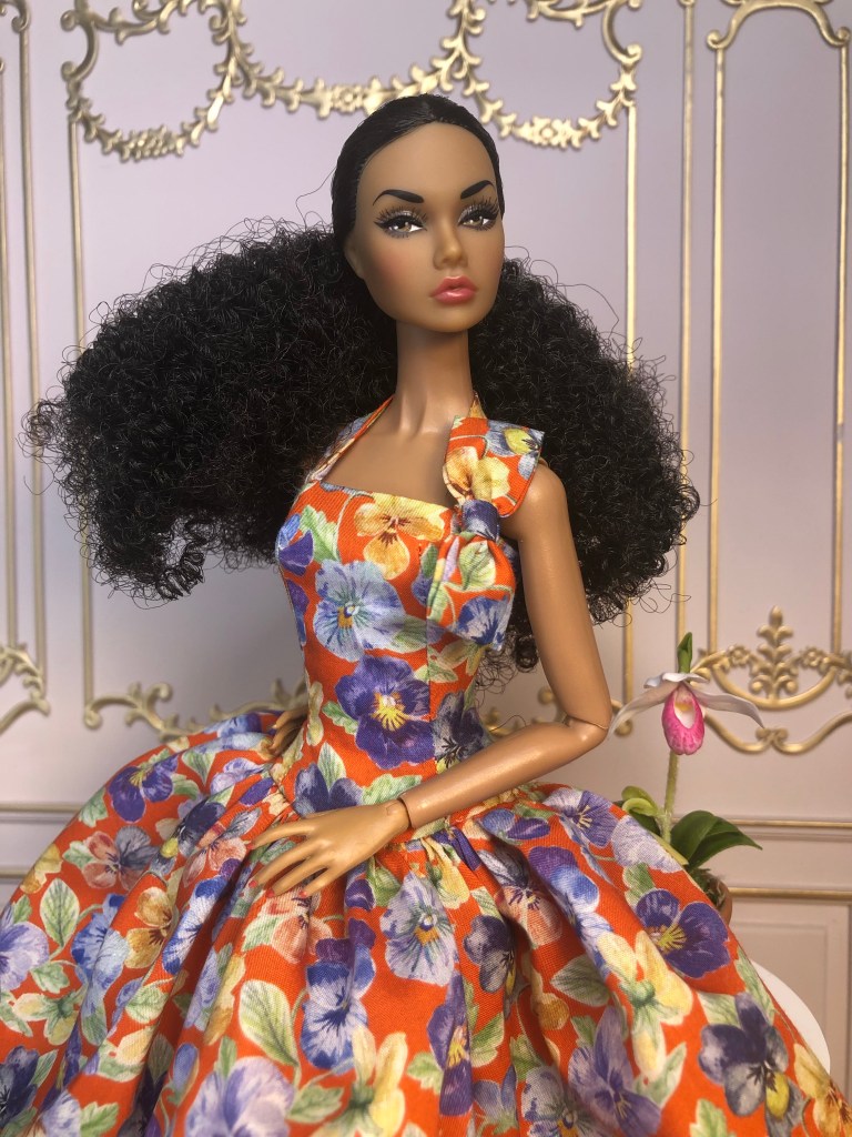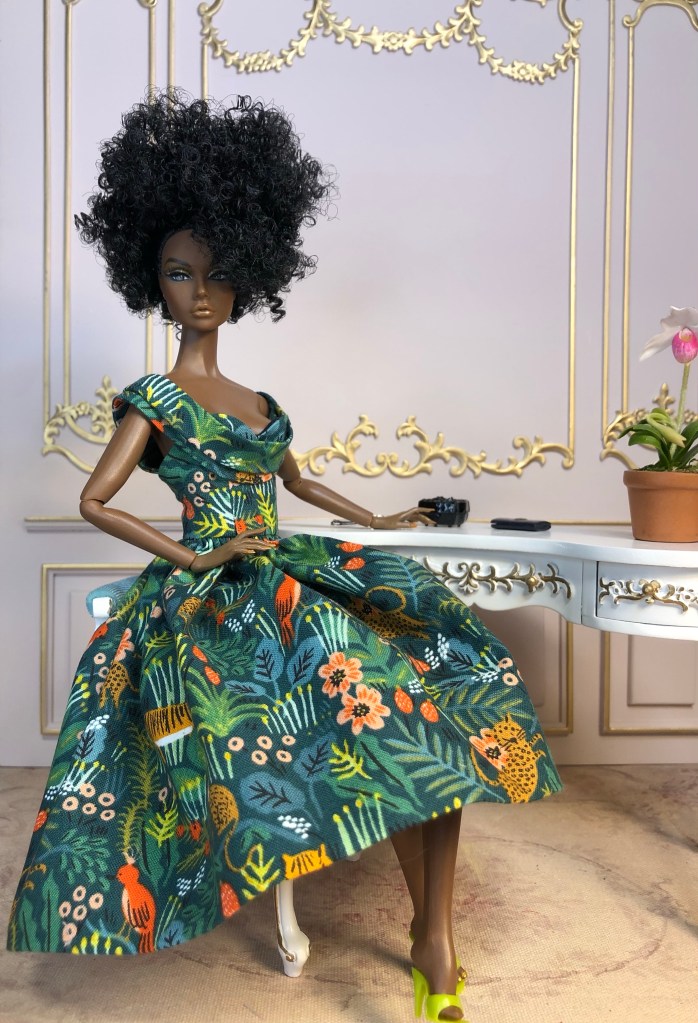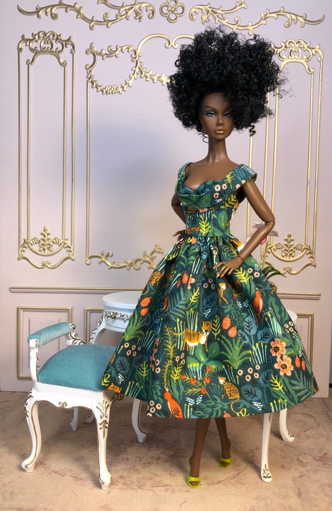 We just got a foot of snow here in Maine, so I’m ready for Spring, which has me reaching for the fresh, colorful fabrics in my collection. This fabric is like a painting that has gotten wet; the colors are hazy and soft like a spring meadow in the rain. The bodice has an off the shoulder silhouette and ruched bust. The full skirt is given additional volume from layers of spring green tulle. A sunny yellow silk bow decorates the bust. Included is a beautifully detailed pot of delicate daffodils.