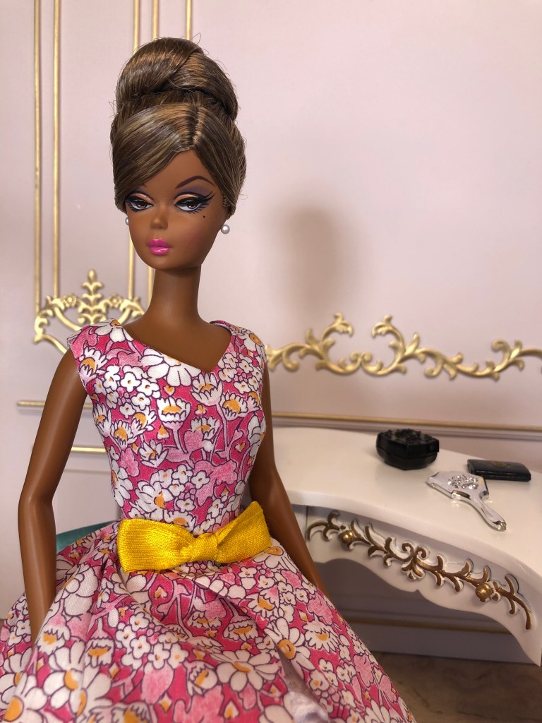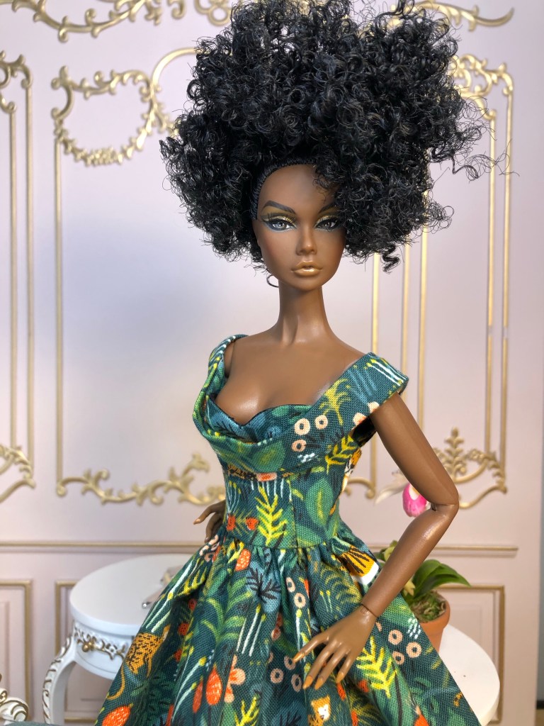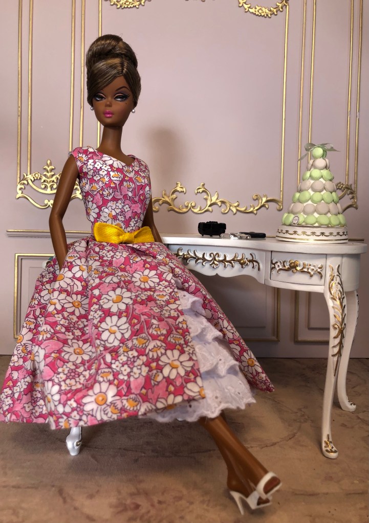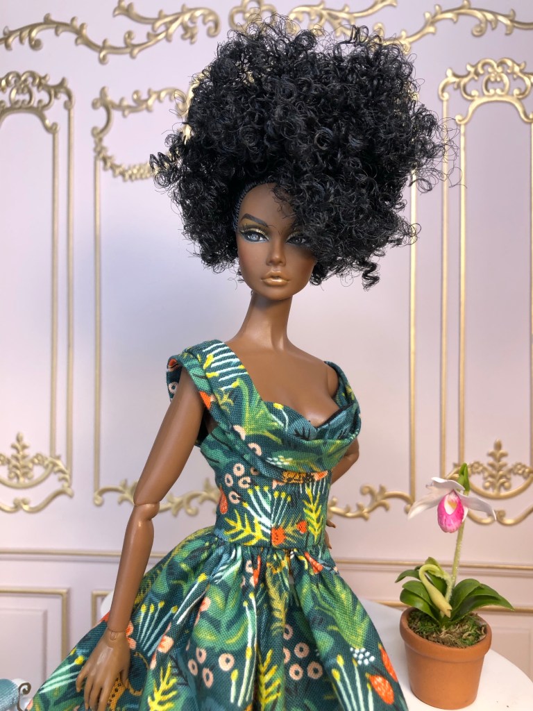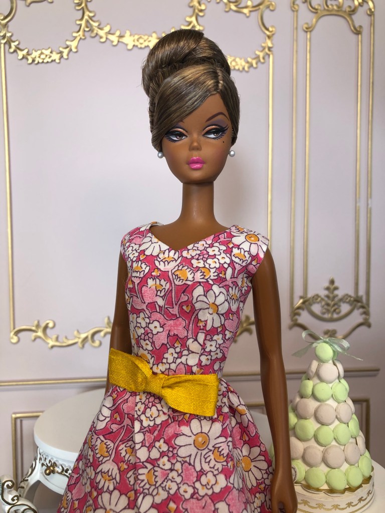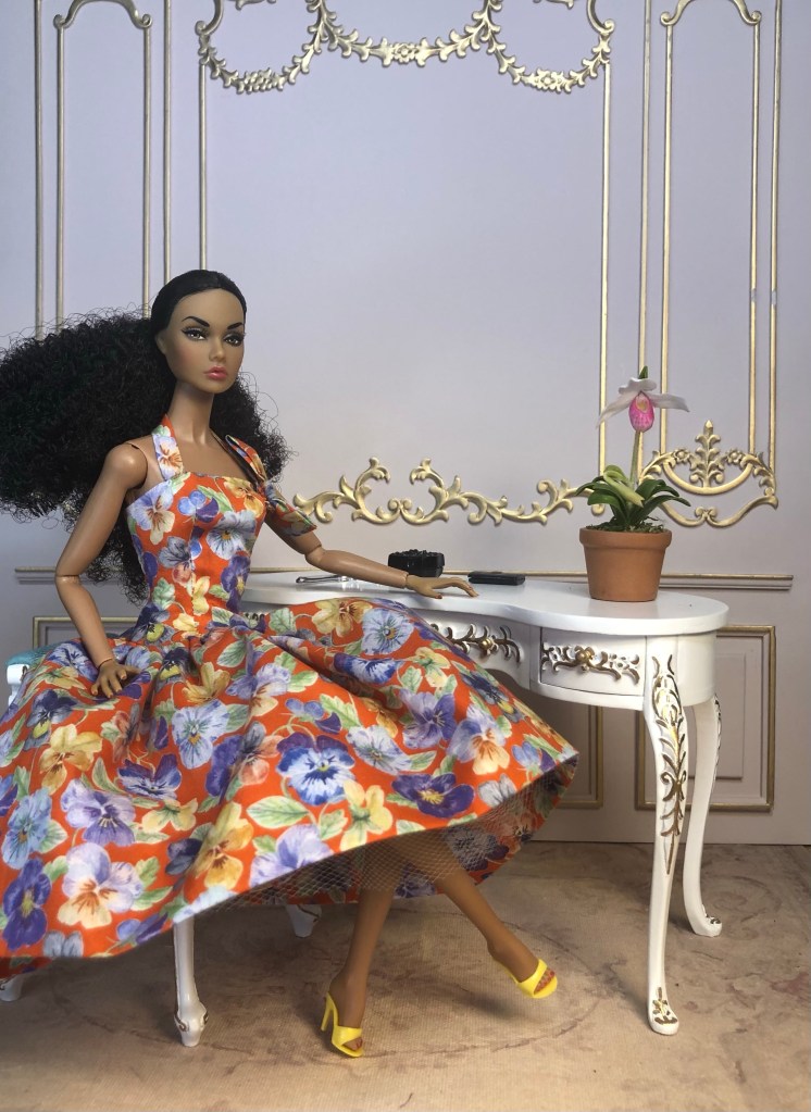 We just got a foot of snow here in Maine, so I’m ready for Spring, which has me reaching for the fresh, colorful fabrics in my collection. This fabric is like a painting that has gotten wet; the colors are hazy and soft like a spring meadow in the rain. The bodice has an off the shoulder silhouette and ruched bust. The full skirt is given additional volume from layers of spring green tulle. A sunny yellow silk bow decorates the bust. Included is a beautifully detailed pot of delicate daffodils.