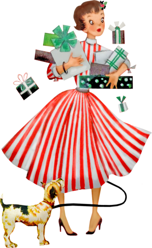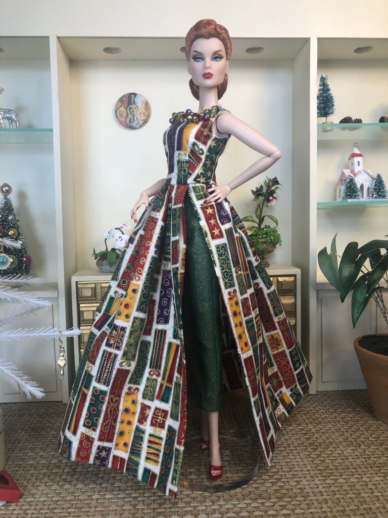 I found a scrap of vintage Christmas fabric in my stash of fabric depicting elegant jewel toned gifts, elegantly wrapped and adorned. The fabric is made into a hostess gown with a wide necked bodice that is richly decorated with seed beads, crystals, and semi precious stones. The full skirt is split on one side to reveal the olive green and gold glitter capri pants beneath. The perfect ensemble for a night of stylish entertaining at home.