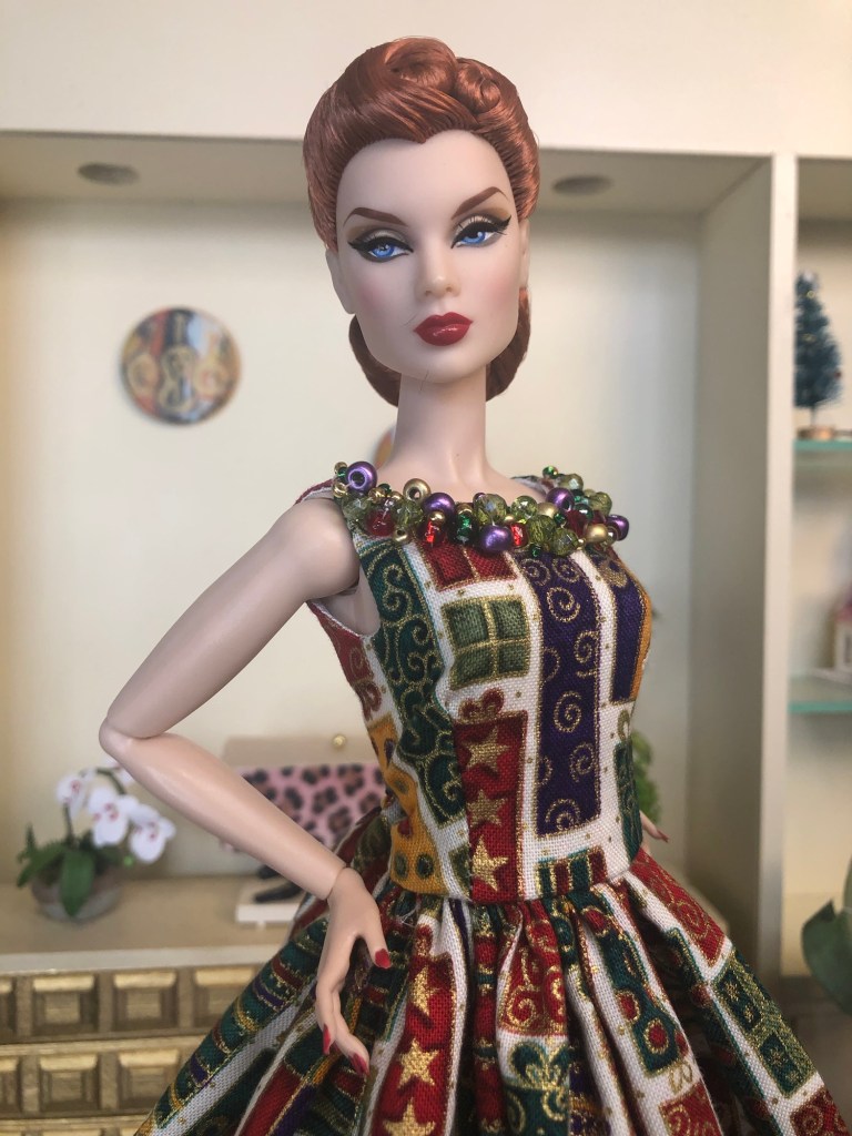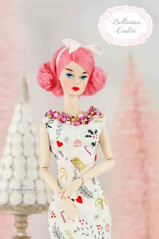 A darling print from the UK with birds, bows, holly leaves, and other tiny icons of Christmas. Touched with metallic silver and gold. Richly beaded at the neckline with a candy pink assortment of glass beads and crystals. Model is the work of MaryannRoy.